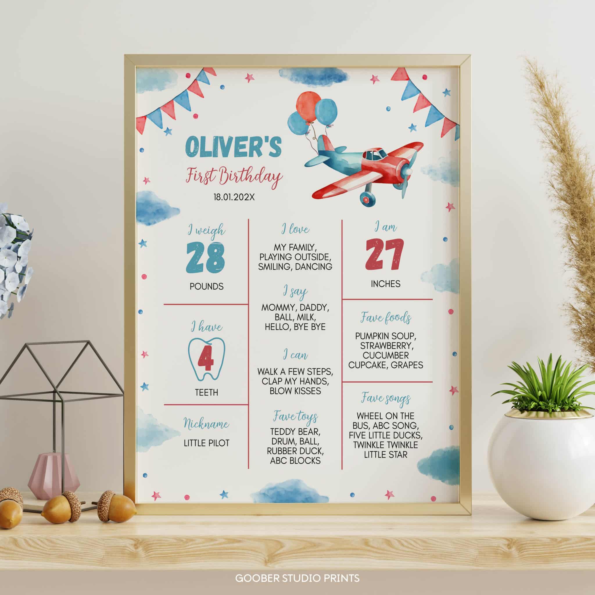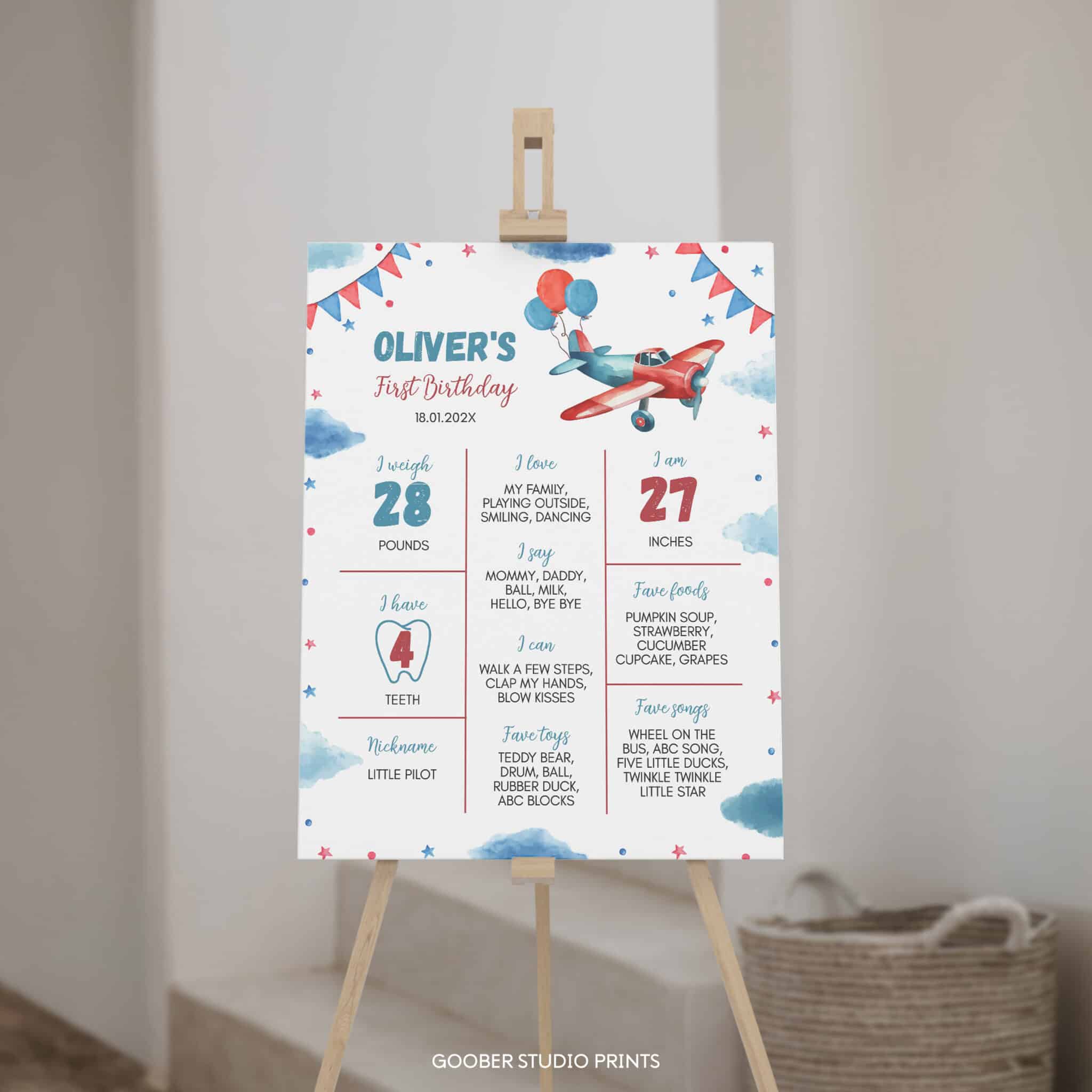 Celebrate your baby’s big day with our airplane birthday milestone poster—perfect for a sky-high celebration! Featuring adorable aeroplane artwork and cloud-filled details, this keepsake poster includes space to showcase your child’s name, favorite things, and special milestones. A charming addition to your aeroplane happy birthday party, it’s a beautiful way to capture memories from your little pilot’s big day!