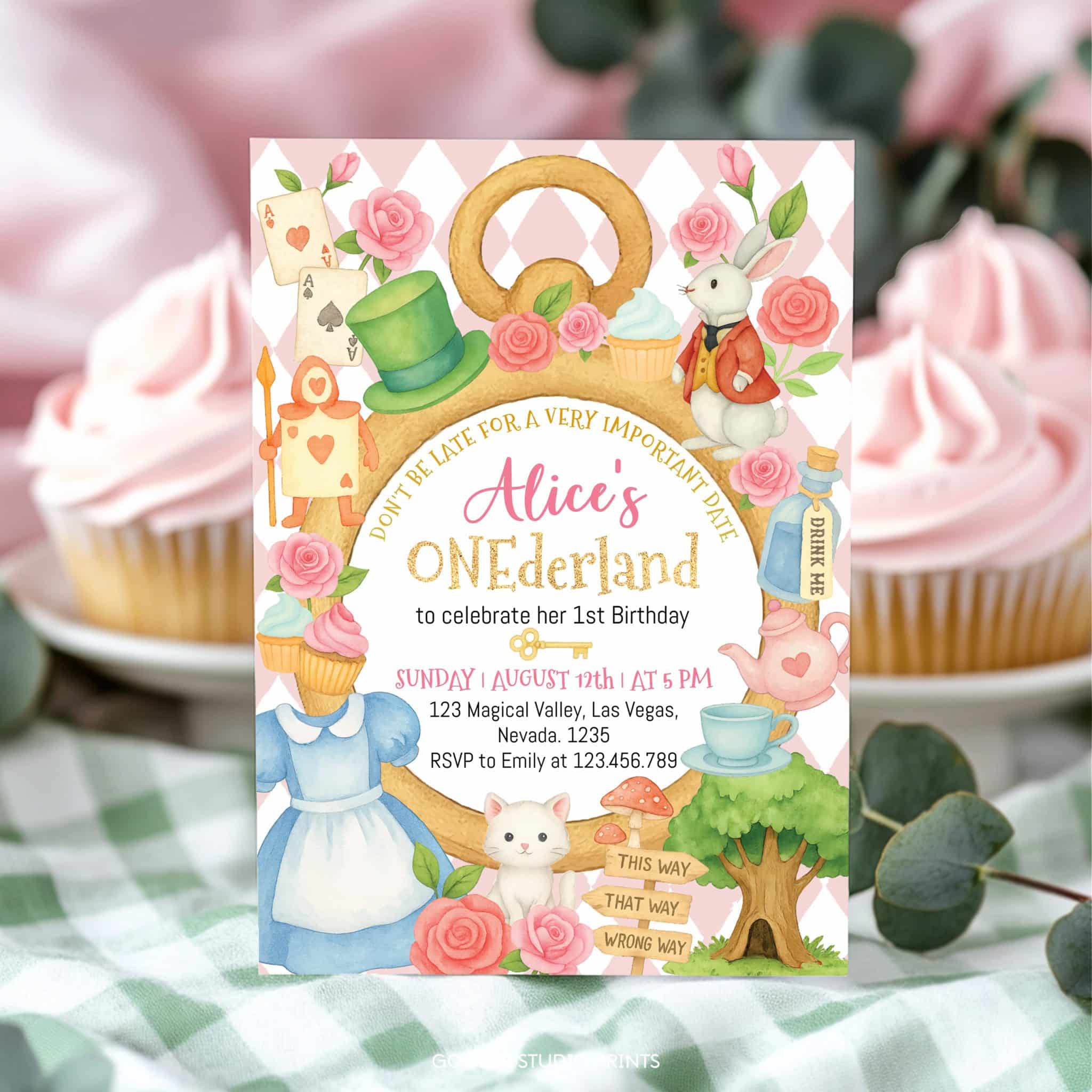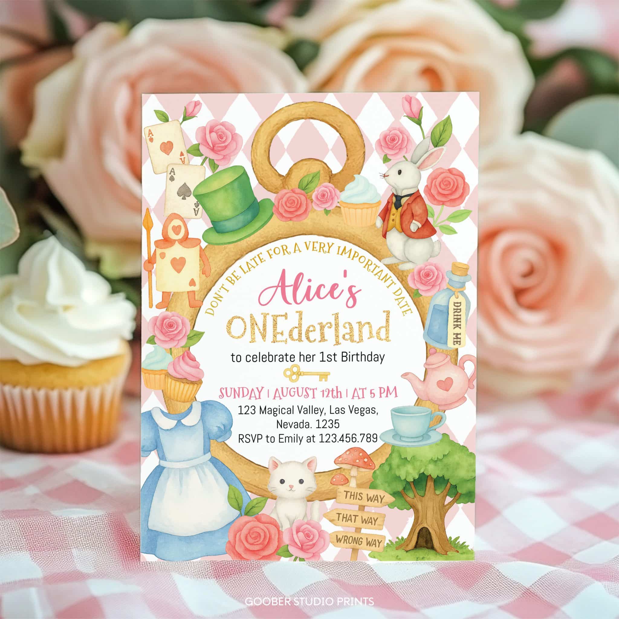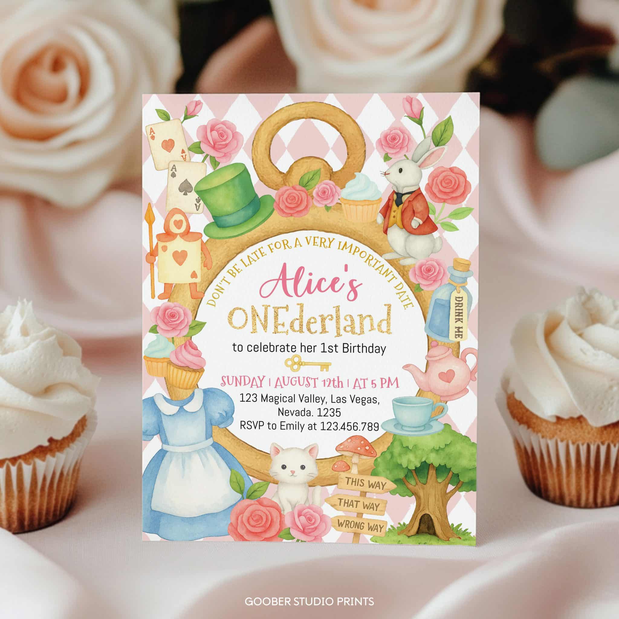 Step into a whimsical world with our Alice in onederland 1st birthday invitation. Adorned with pink floral accents, delicate teacups, and enchanting Wonderland elements, this invitation sets the perfect tone for your little girl’s magical tea party. Easily personalize with your event details and print at home for a charming and convenient touch. Create an unforgettable celebration that captures the essence of Wonderland.
