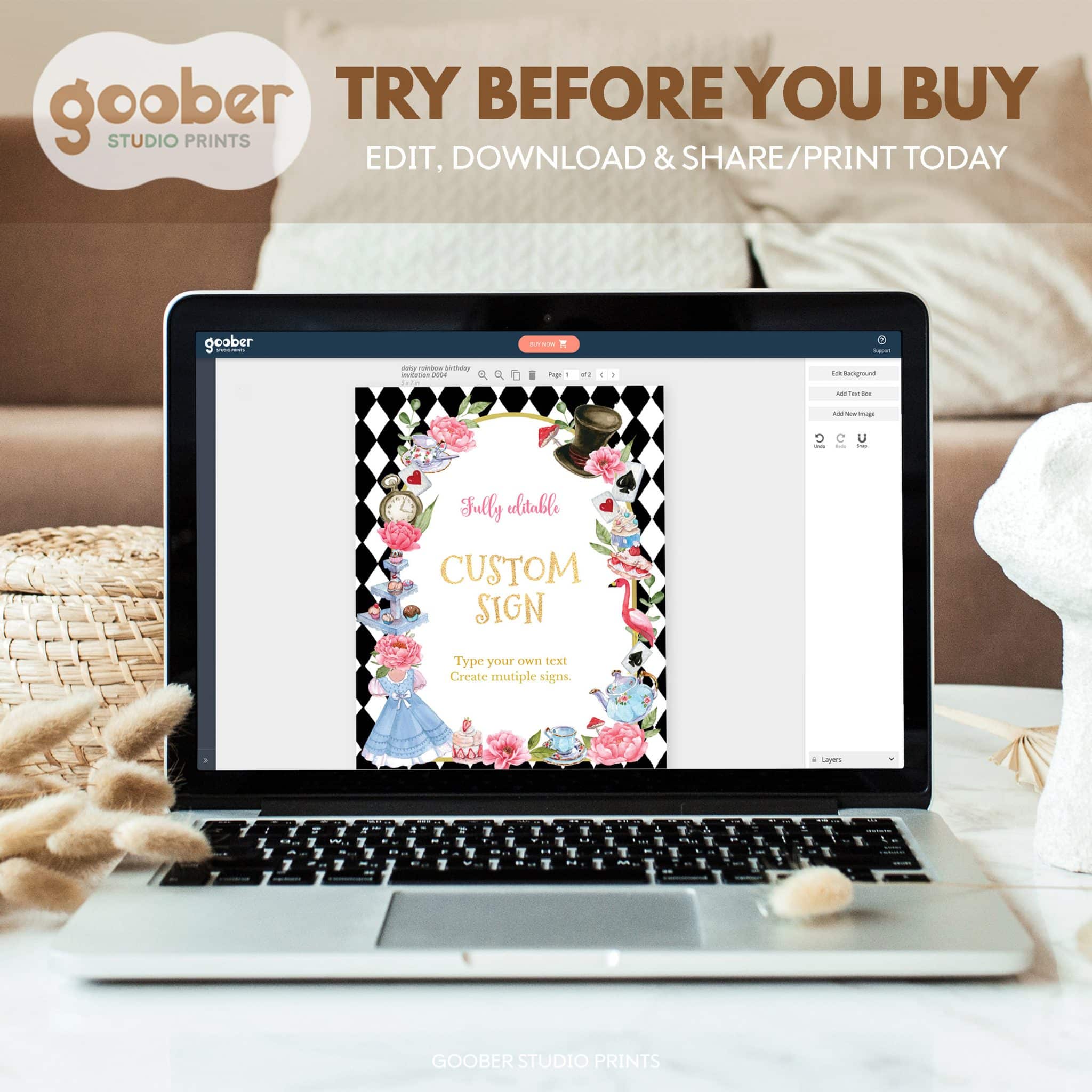 Add a magical touch to your Alice in onederland celebration with our custom Alice tea party sign! Featuring pink floral accents, whimsical teacups, and enchanting wonderland details, this 8×10-inch sign is fully customizable with any text, name, or age. Perfect as a welcome sign, photo prop, or backdrop, it brings a charming touch to your girl birthday and wonderland-themed party!