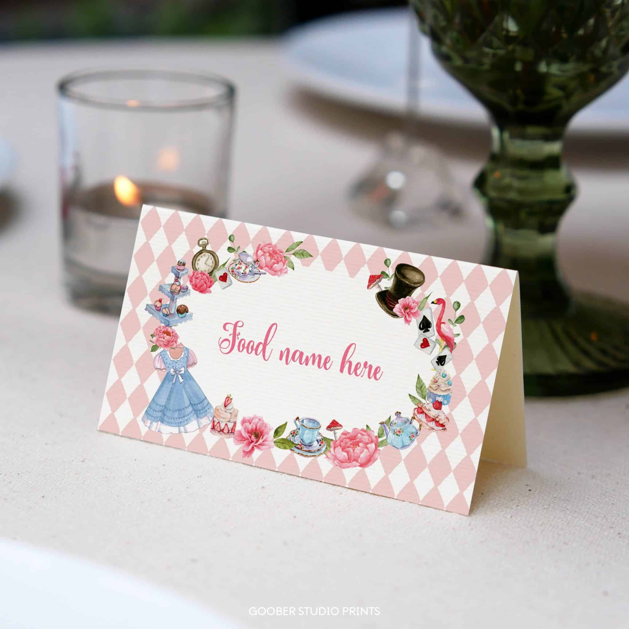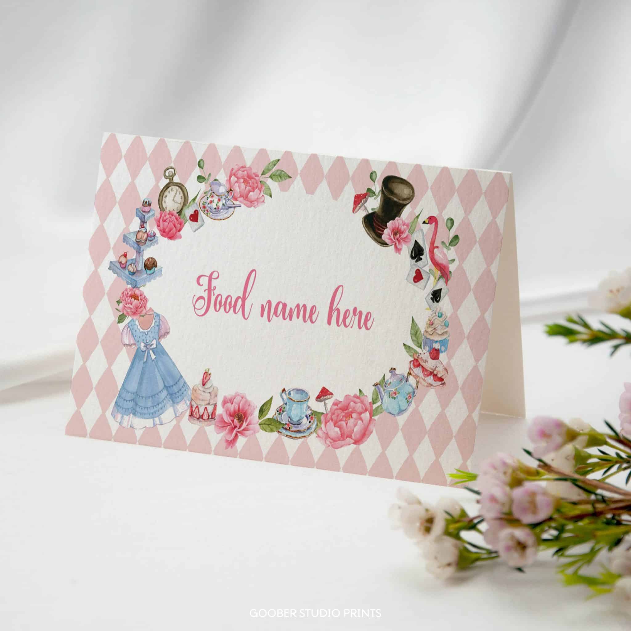 Add a touch of wonderland magic to your party menu with our Alice in onederland food tent cards! Featuring pink floral accents, delicate teacups, and whimsical Alice tea party details, these cards offer space to label your dishes while enhancing the charm of your buffet or dessert table. Customizable and easy to print at home, they’re the perfect addition to your girl birthday celebration, bringing a delightful, whimsical touch to your wonderland theme!