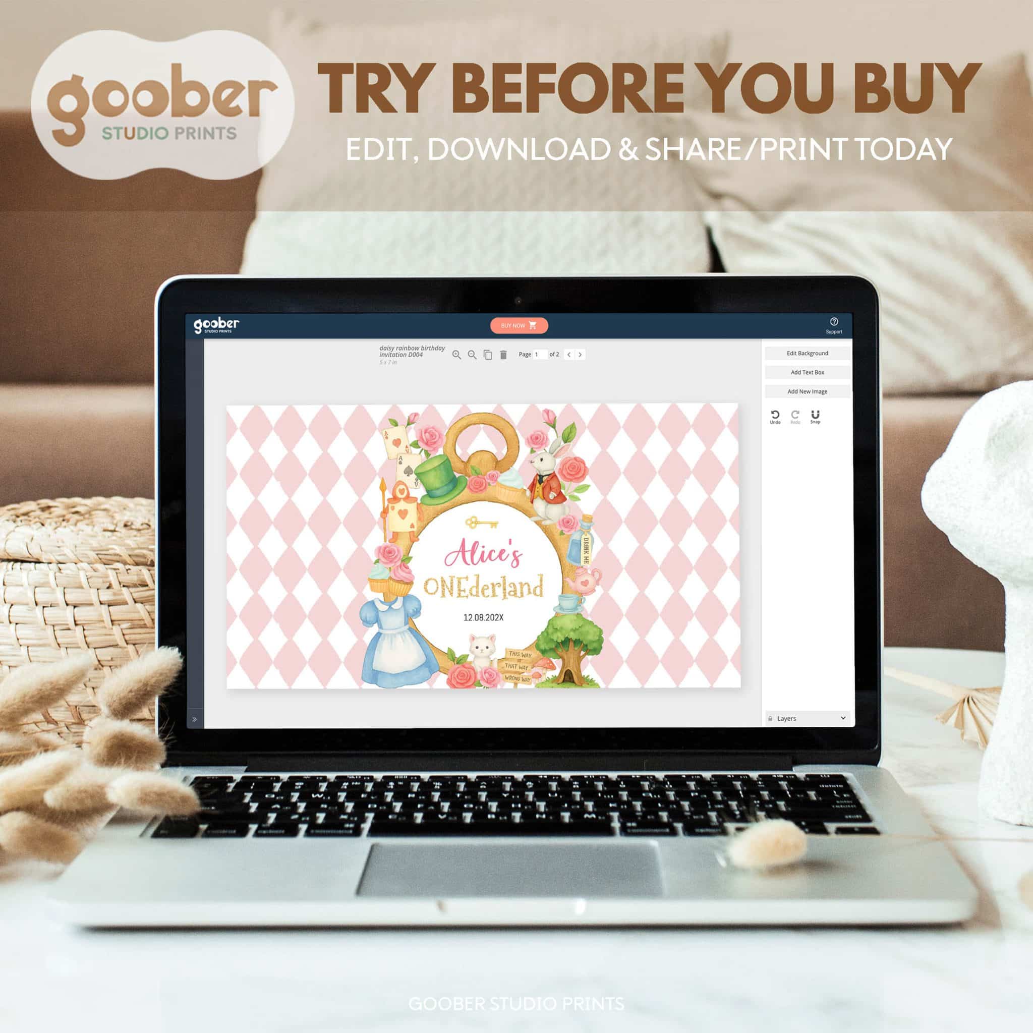An access link to your editable Alice in onederland birthday gable box label design will be sent to your e-mail address. The link allows you to edit, save and download your design as JPG or PDF file. The design is made for printing at 6.25×3.5 inches.  We’re happy to answer any questions through our contact page.