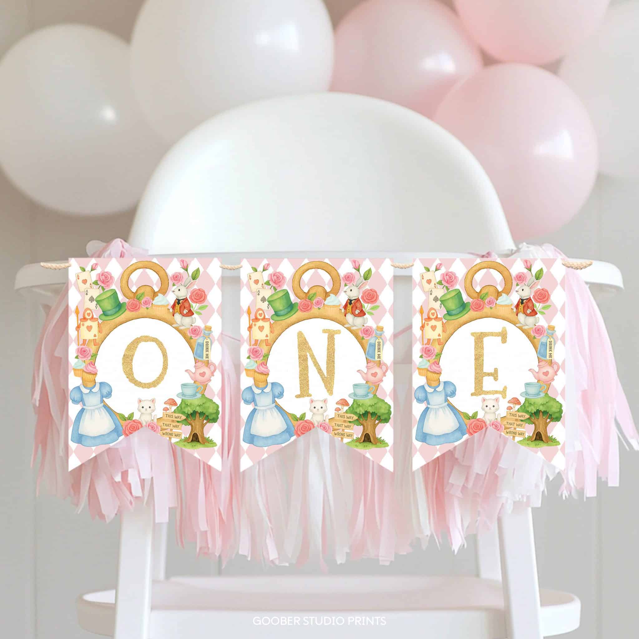 Celebrate your little one’s Alice in onederland birthday with our adorable Alice tea party highchair banner! Decorated with pink floral accents, dainty teacups, and whimsical wonderland details, this printable banner spells out “one” in charming style—perfect for highlighting your baby girl’s special seat. A delightful touch for any girl birthday with a magical wonderland theme!
