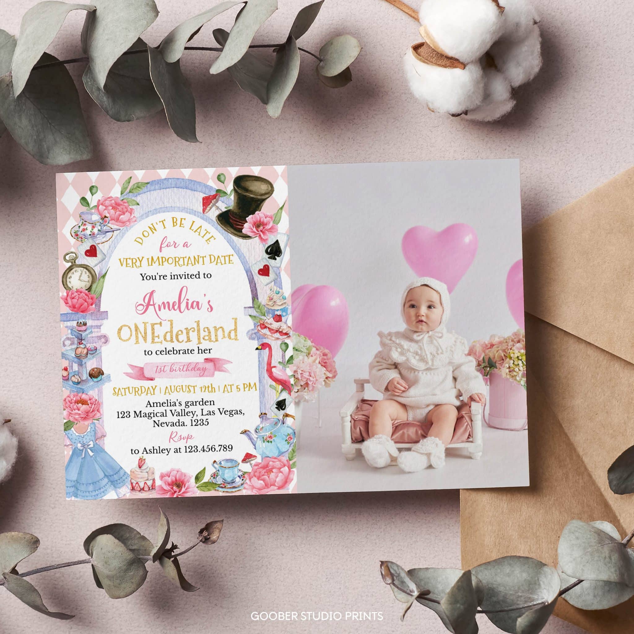 Celebrate a magical first birthday with our Alice in onederland photo invitation! Featuring pink floral accents, delicate teacups, and whimsical wonderland details, this charming invite is perfect for an Alice tea party girl birthday. Personalize it with all the event details—date, time, and location—to create a beautiful keepsake for your wonderland-inspired celebration. Designed for easy at-home printing, this invitation sets the stage for an unforgettable day!