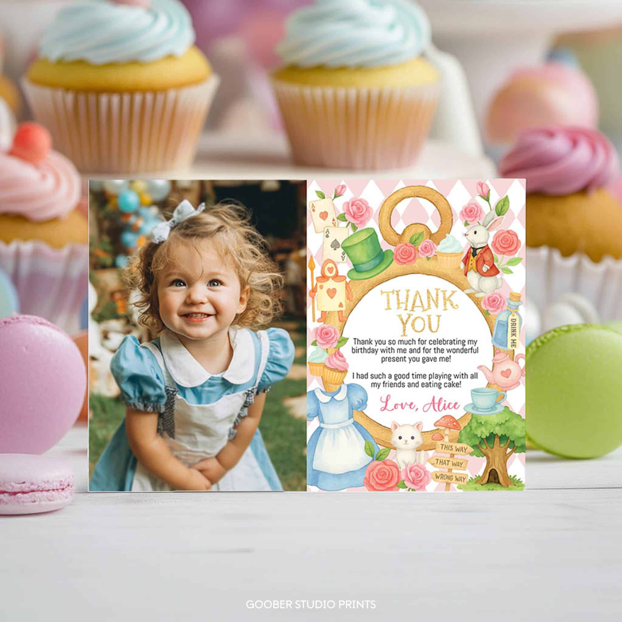 Express your gratitude with our Alice in onederland birthday thank you cards! Featuring pink floral accents, whimsical teacups, and magical wonderland details, these cards offer space for a heartfelt, personalized message. Easy to print at home on standard cardstock, they’re the perfect way to thank your guests for joining the celebration and making your Alice tea party girl birthday truly unforgettable.