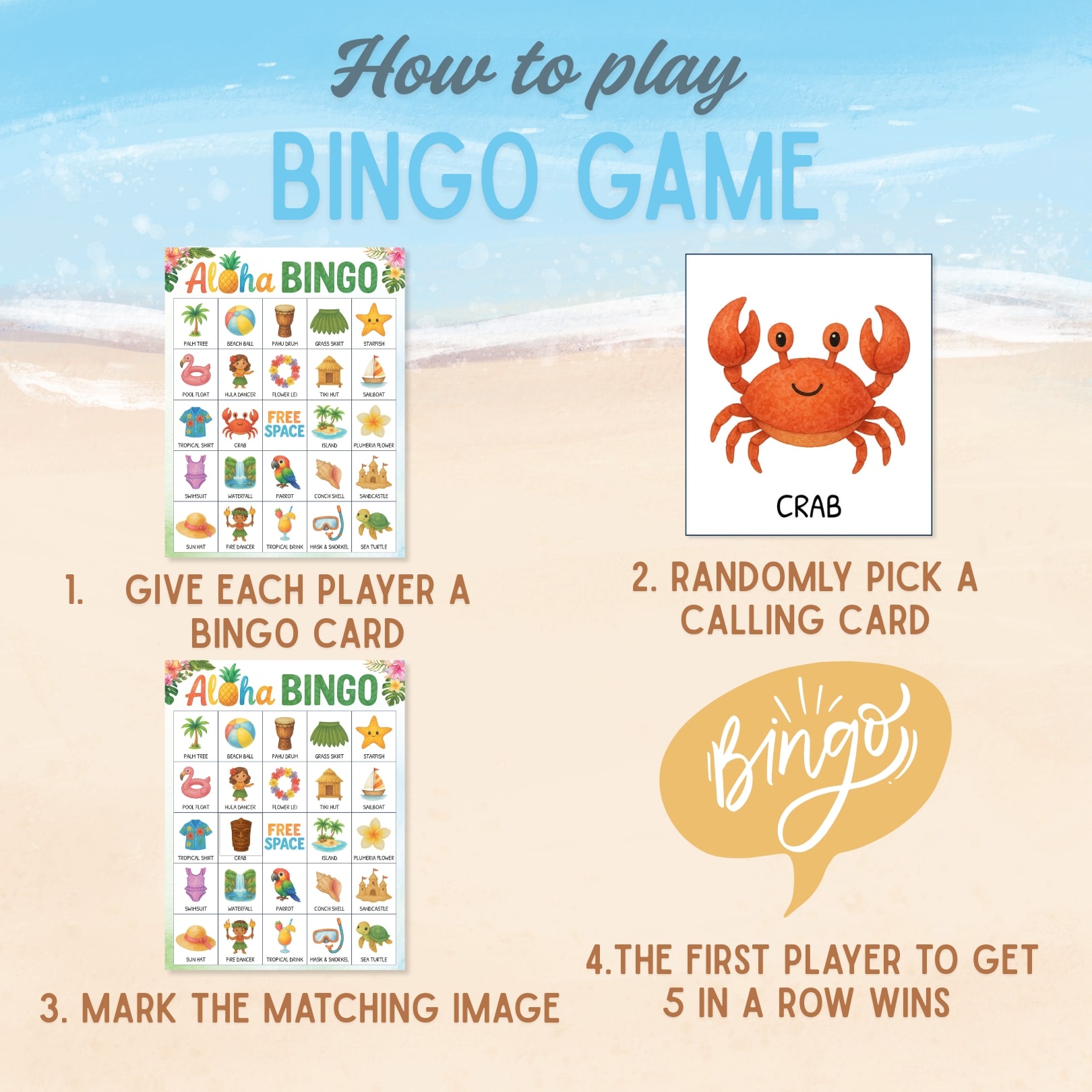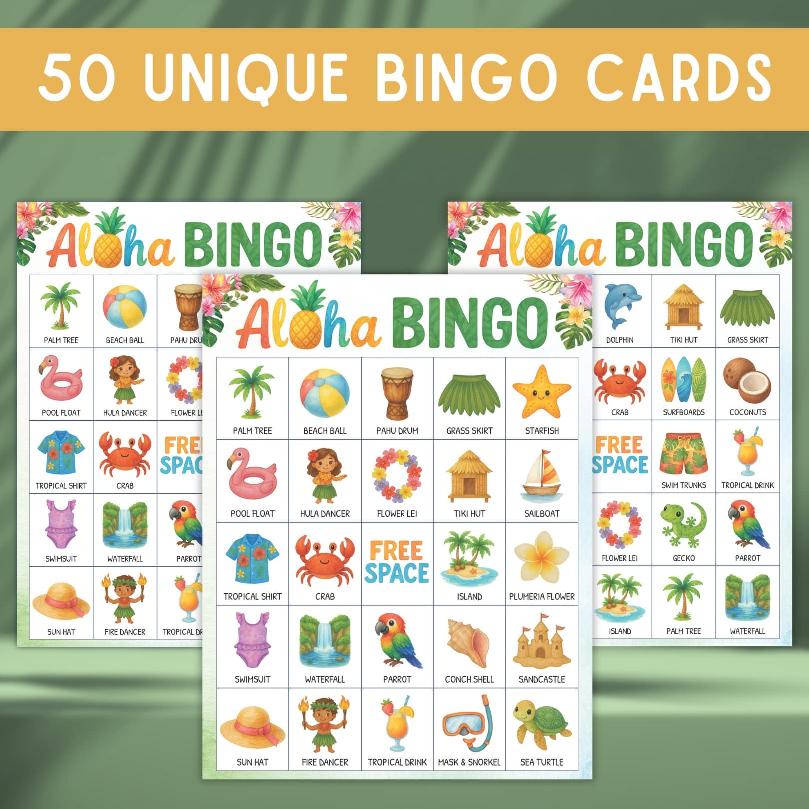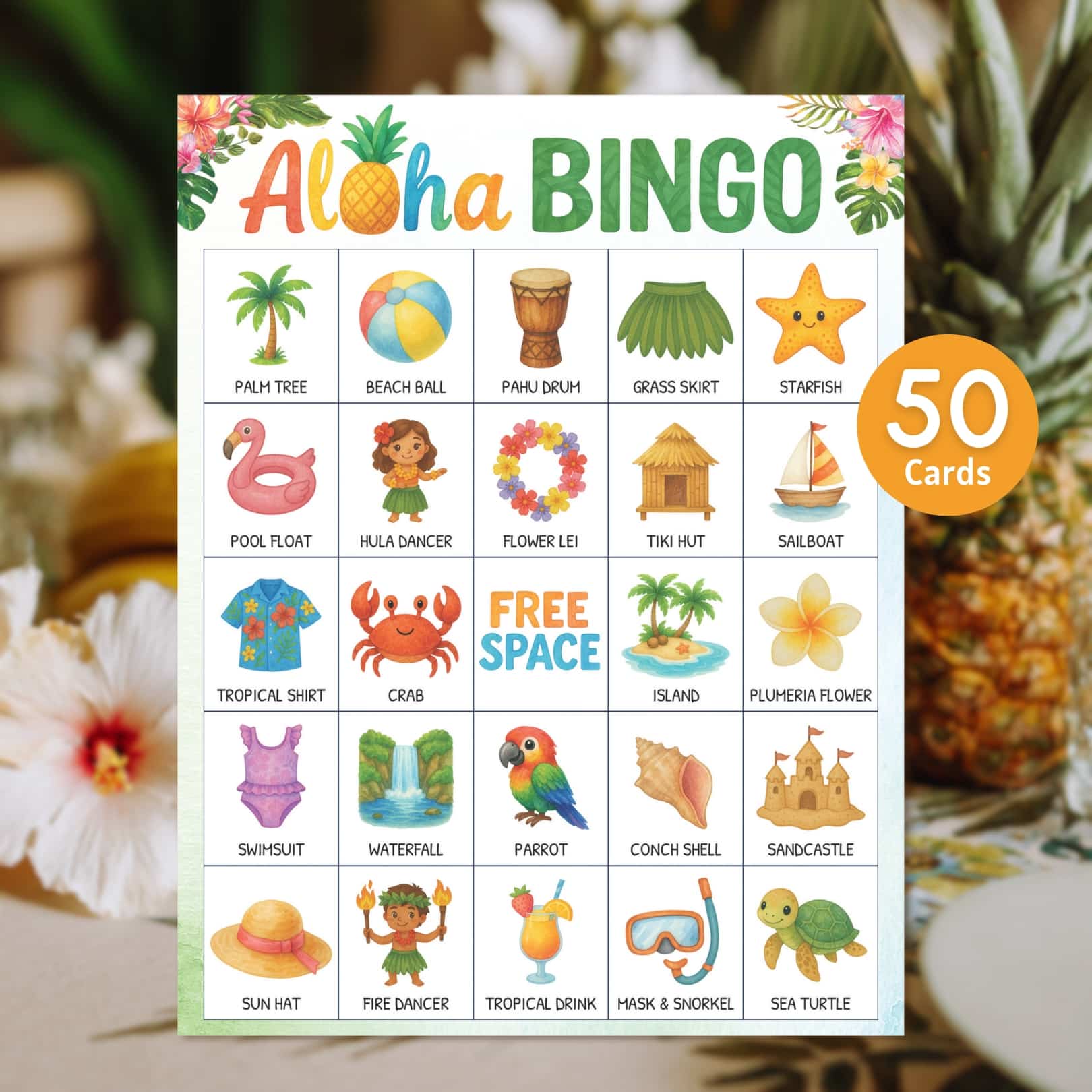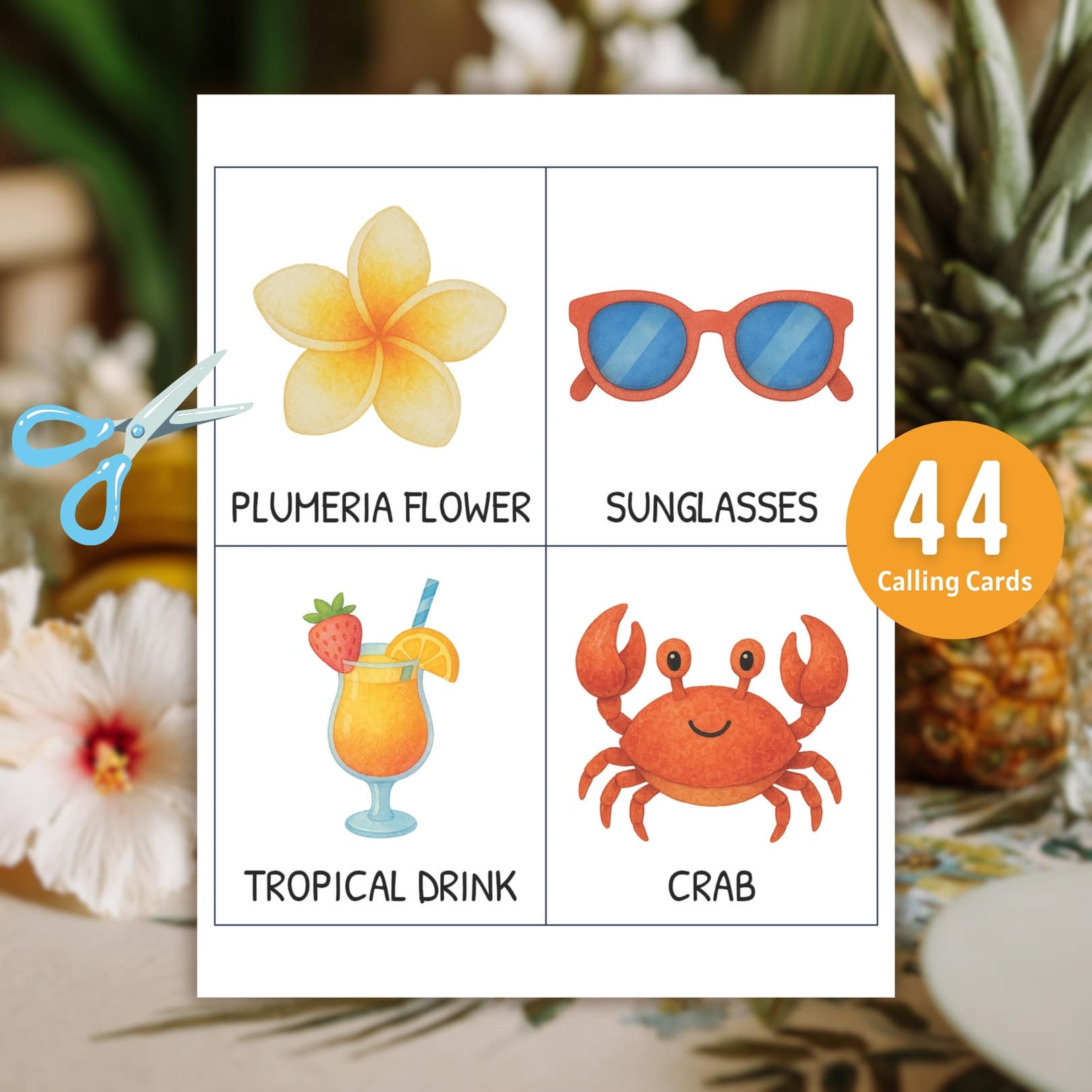 🌺 Complete set included – 50 unique bingo cards, 44 calling cards & tropical tokens.