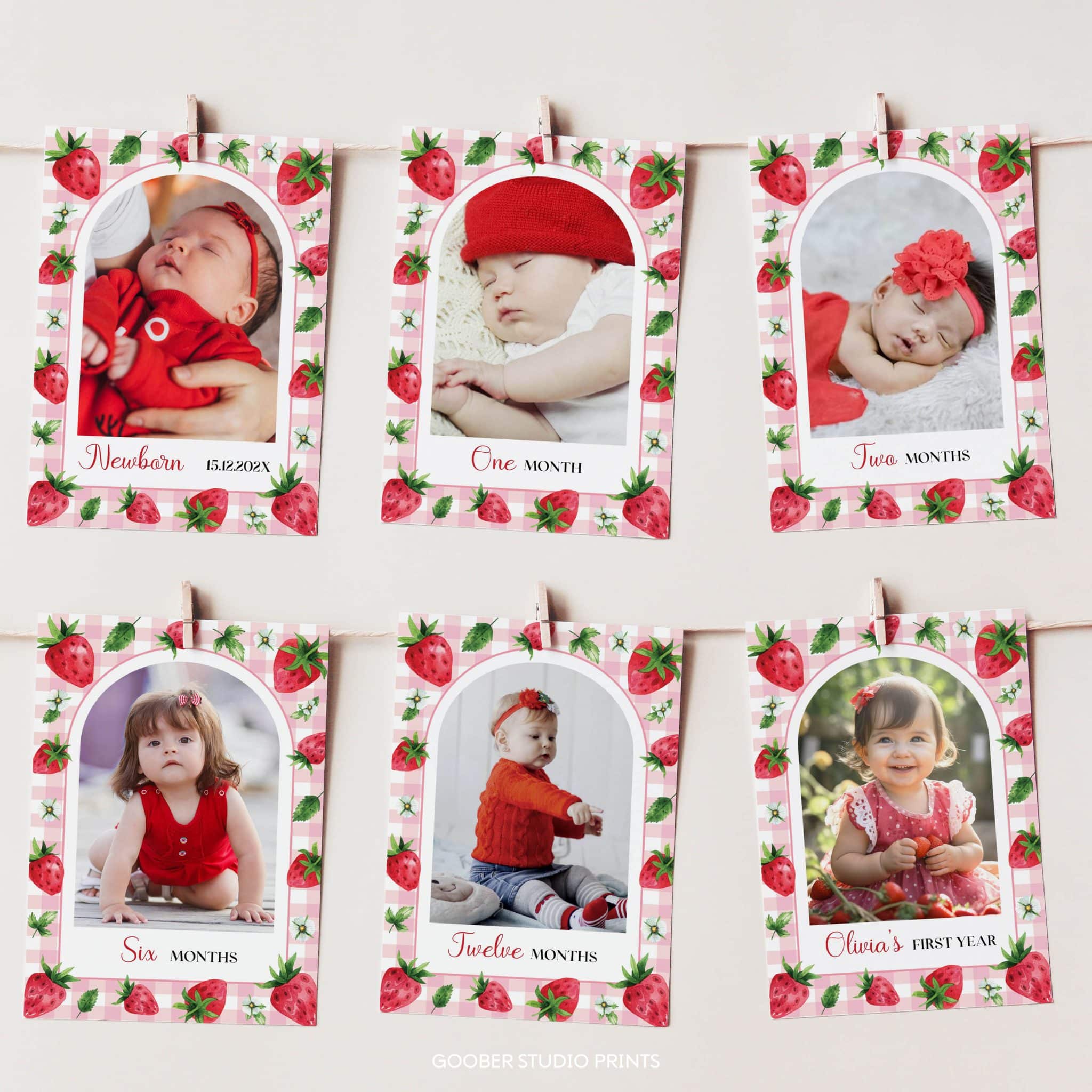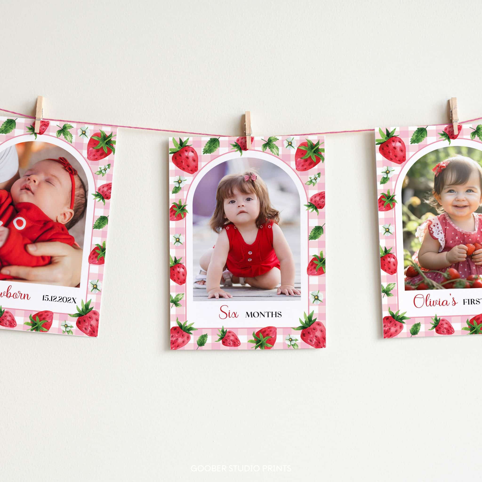 Celebrate your little one’s berry sweet first year with our adorable strawberry-themed photo banner! Featuring charming strawberry illustrations, and gingham pattern, this banner includes space for 12 monthly photos, your baby girl’s name, and age. Easily customizable and printable at home on standard 5×7 inch paper, it’s perfect for displaying at a strawberry-themed girl birthday celebration or as a cherished keepsake in her room!