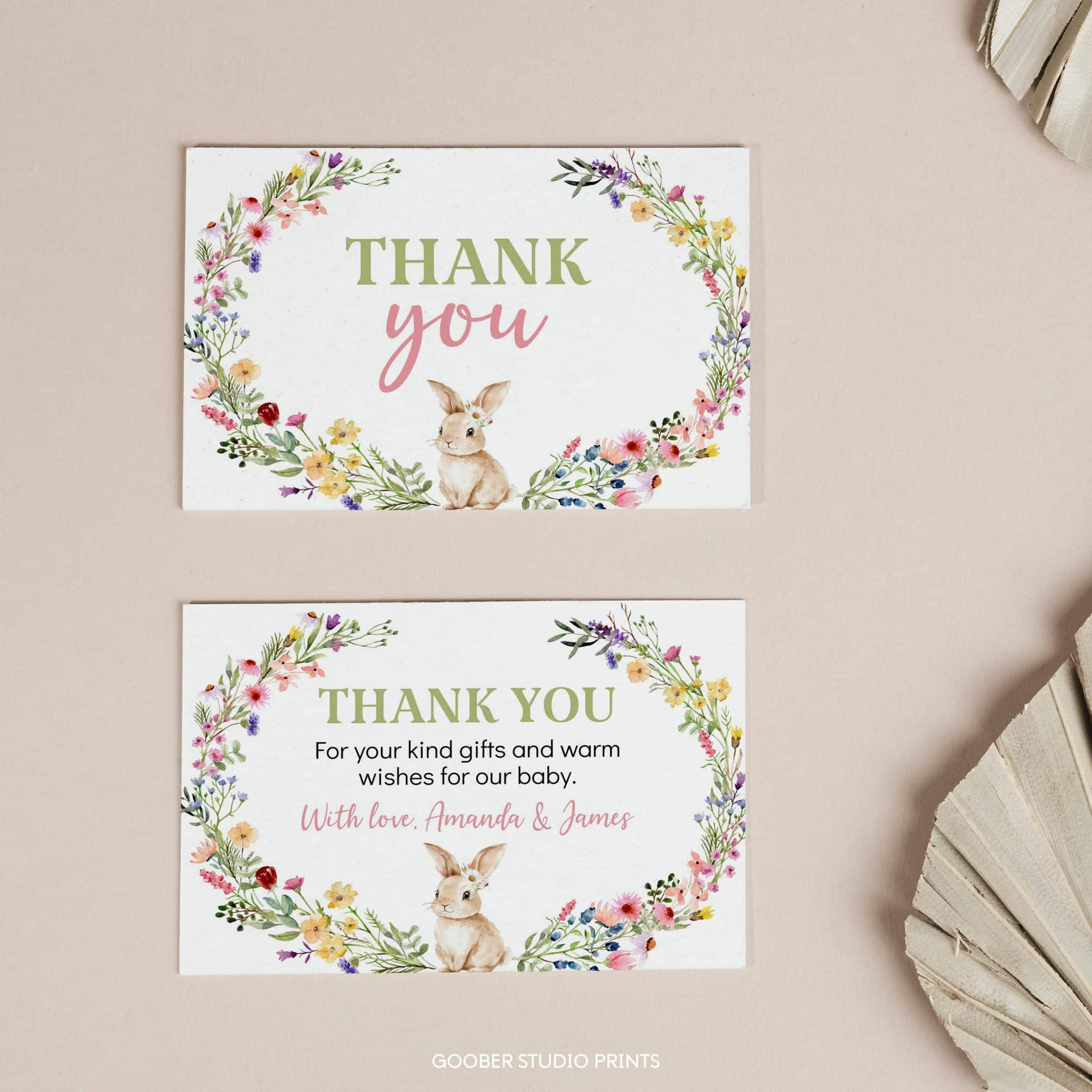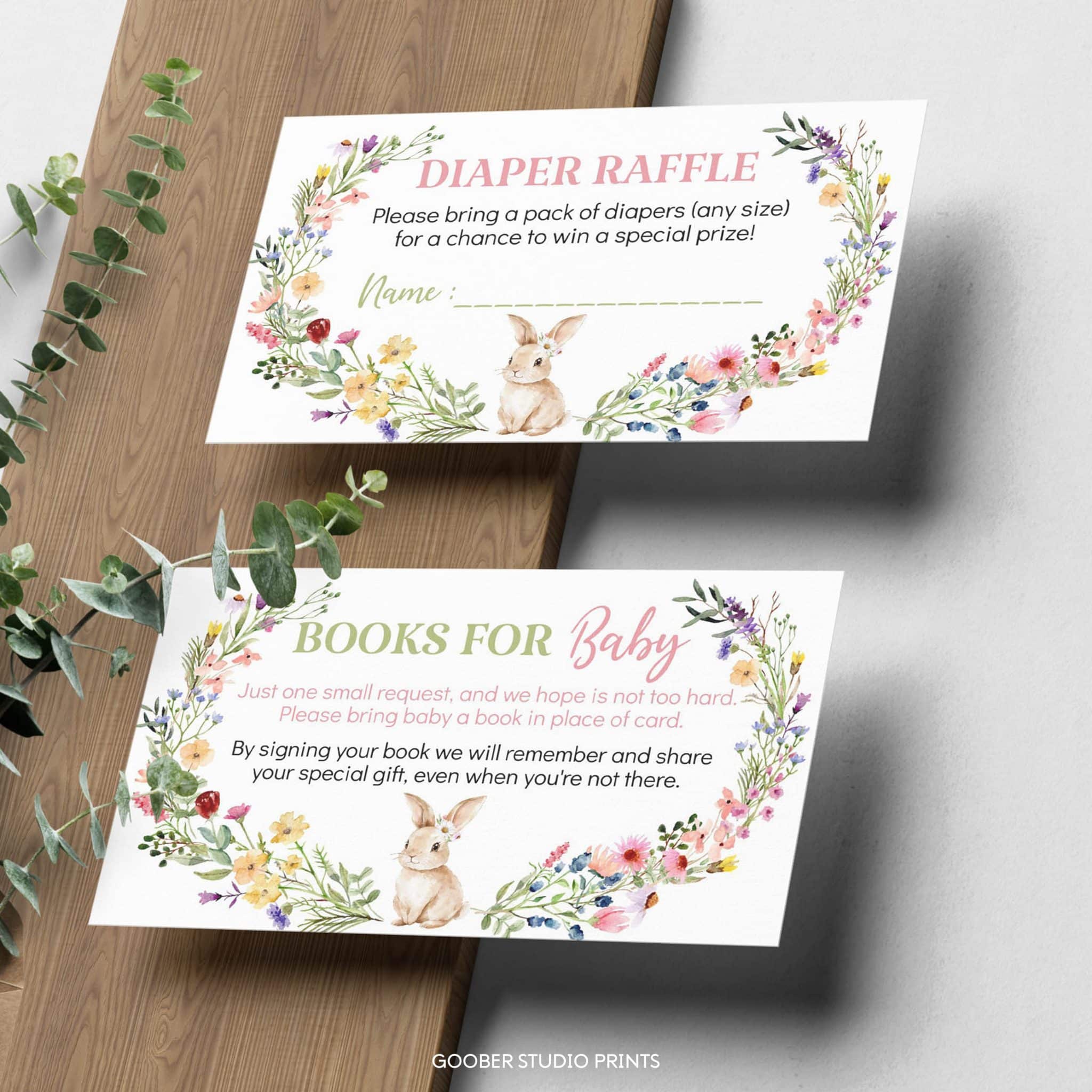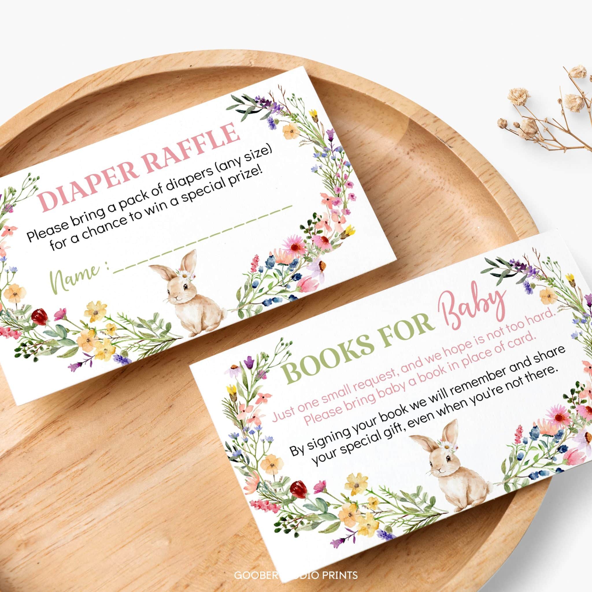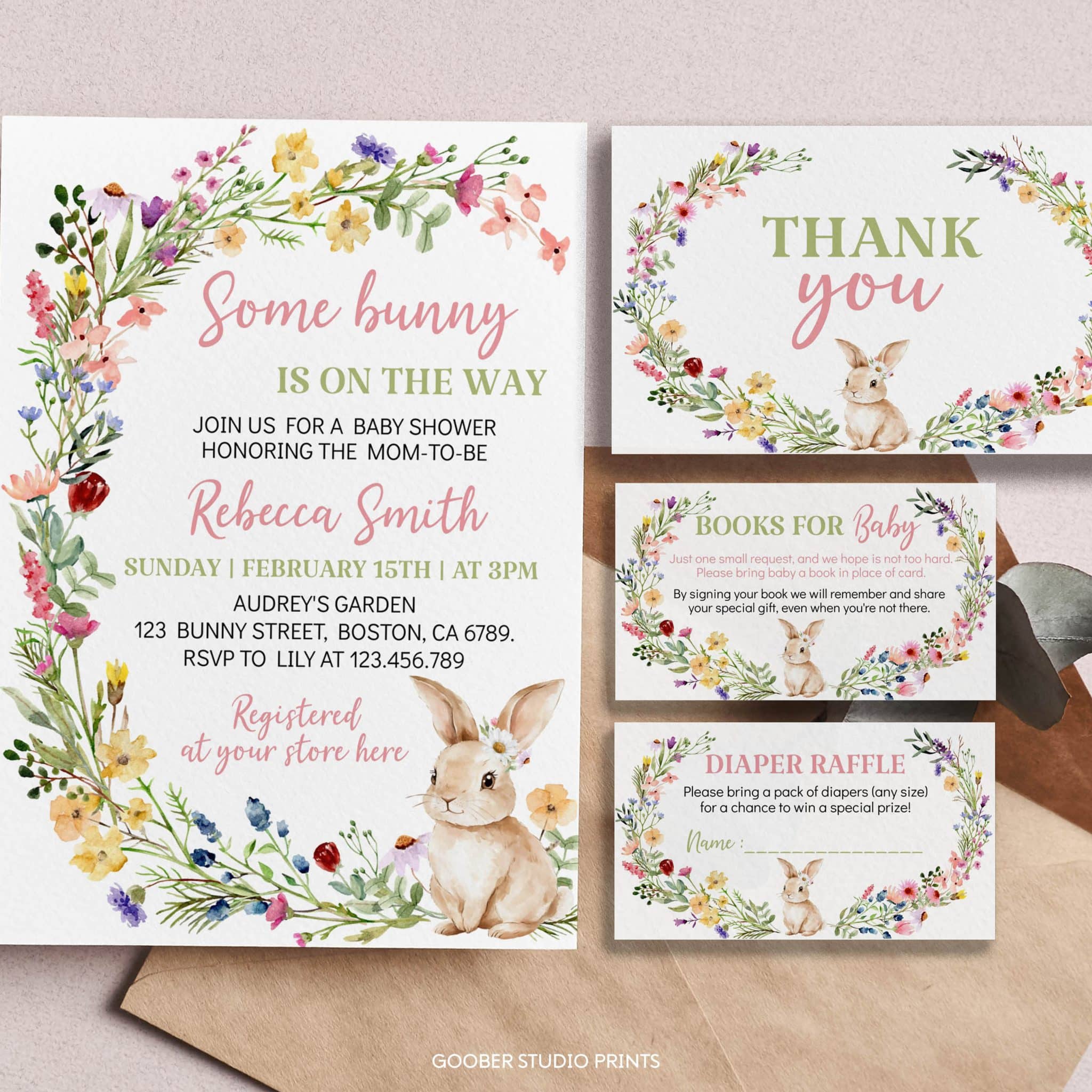 Welcome your baby girl with our adorable little bunny baby shower invitation set. Designed with a sweet bunny, delicate wildflowers, and a soft floral watercolor touch, this set is perfect for a whimsical bunny-themed celebration. The elegant invitation can be easily personalized with the date, time, and location, setting the tone for a magical gathering. It also includes a diaper raffle card to help the new parents prepare, a ‘Books for Baby’ card to build a special library, and a folded thank-you card to share heartfelt appreciation. Create an unforgettable event with this charming wildflower and little bunny-inspired set!