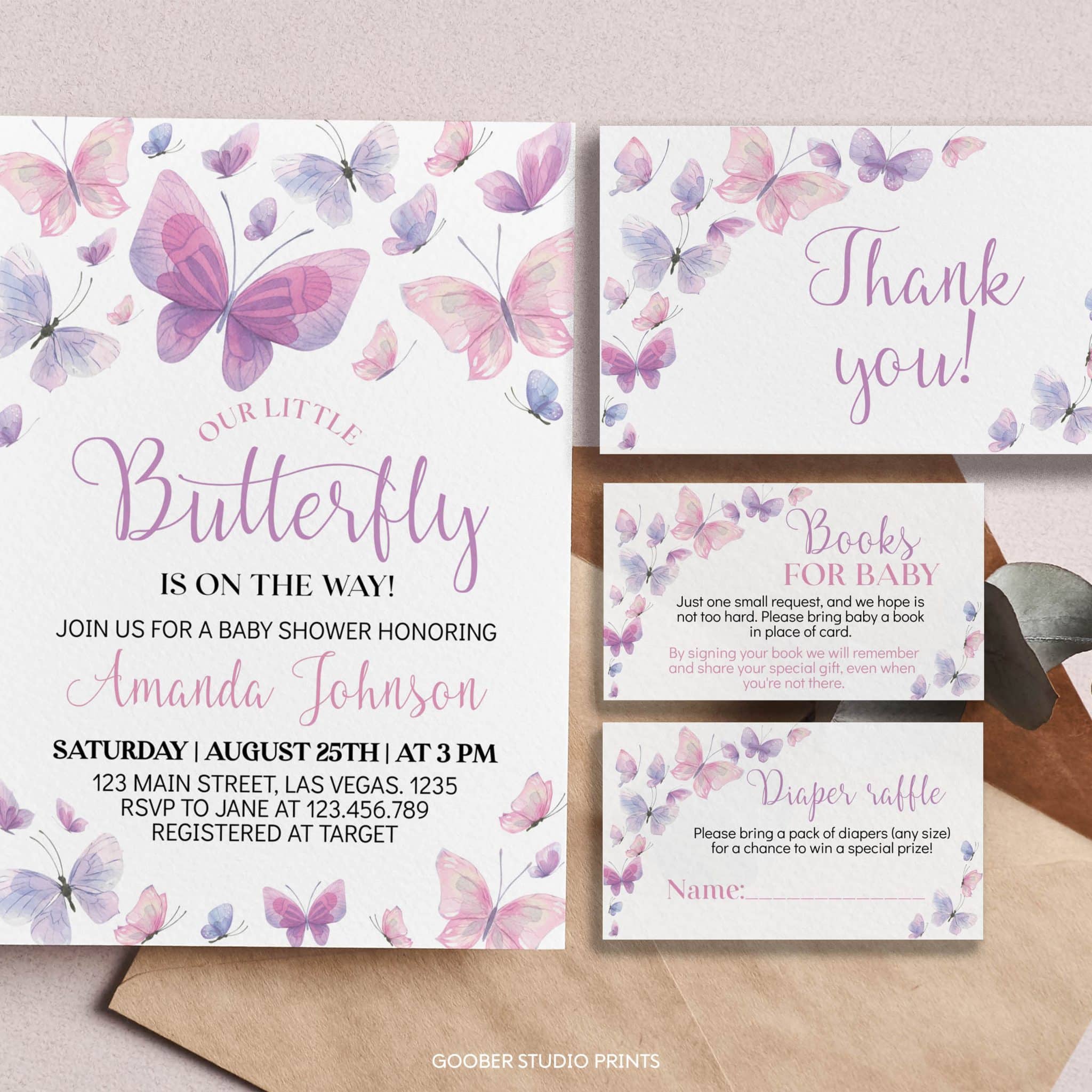 An access link to your editable butterfly baby shower invite, diaper raffle card, books for baby card, and folded thank you card designs will be sent to your e-mail address. The link allows you to edit, save and download your design as JPG or PDF file. The printable baby shower invitation is made for printing at 5×7 inches. The other set items printing sizes are: