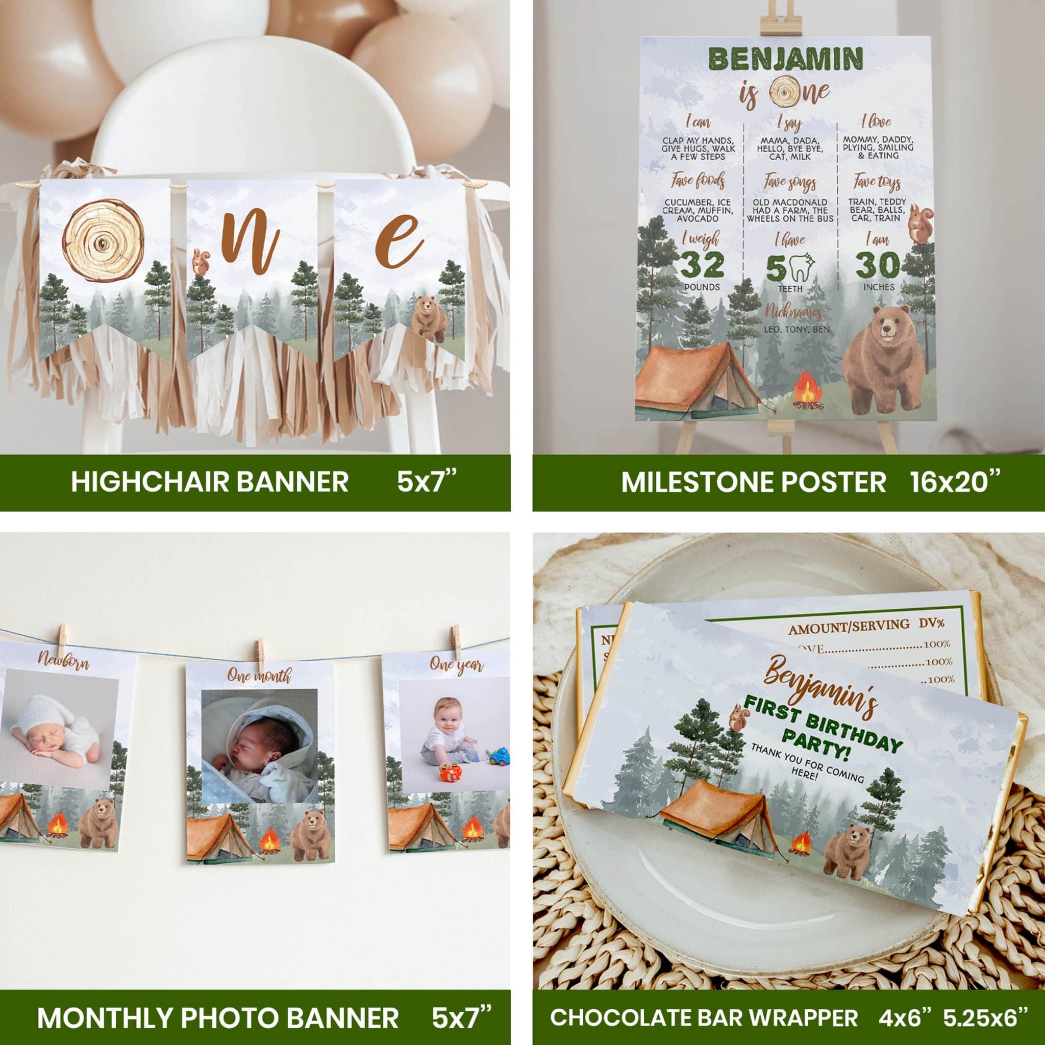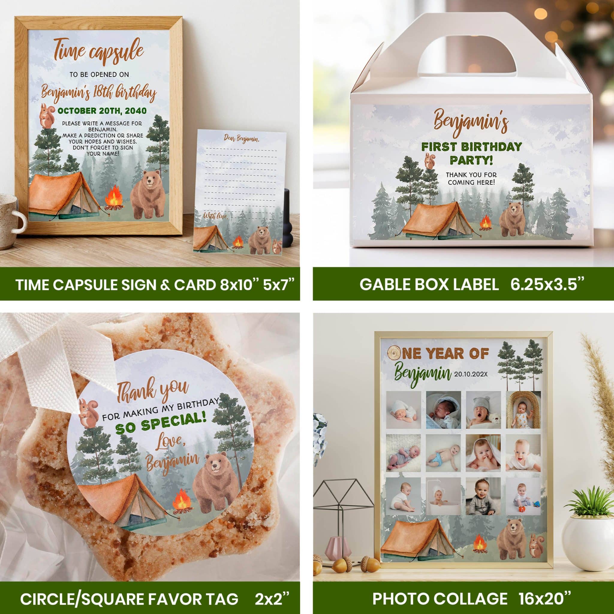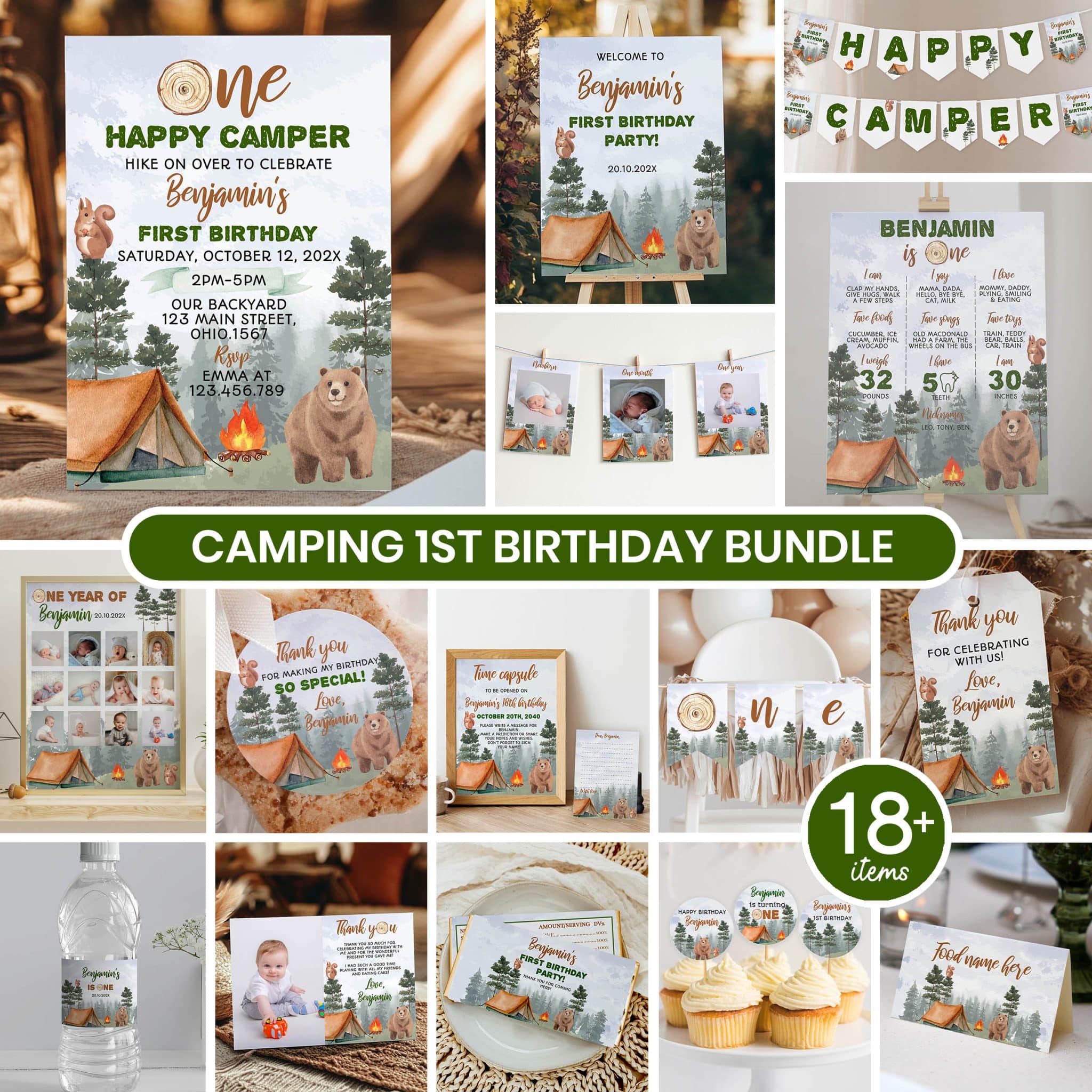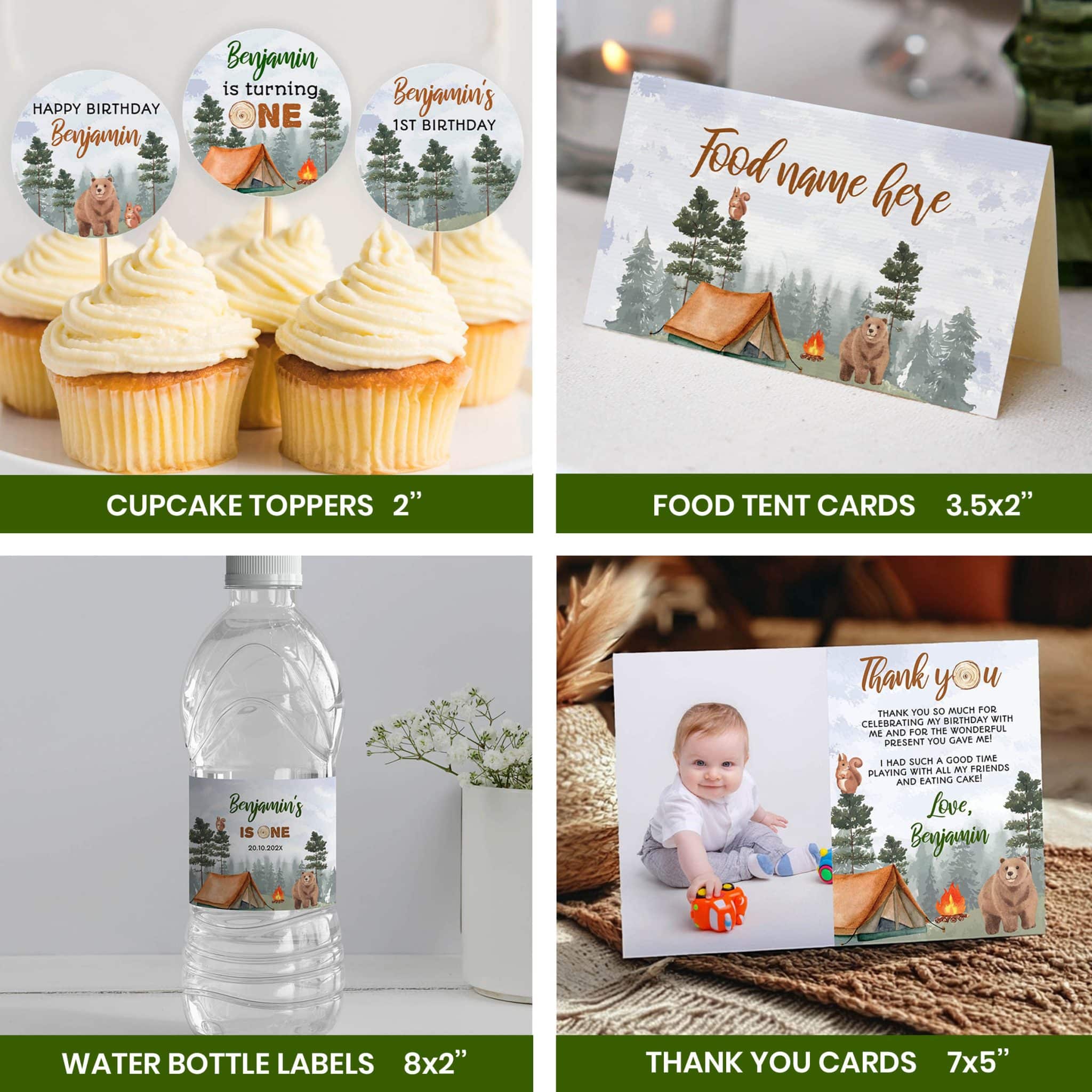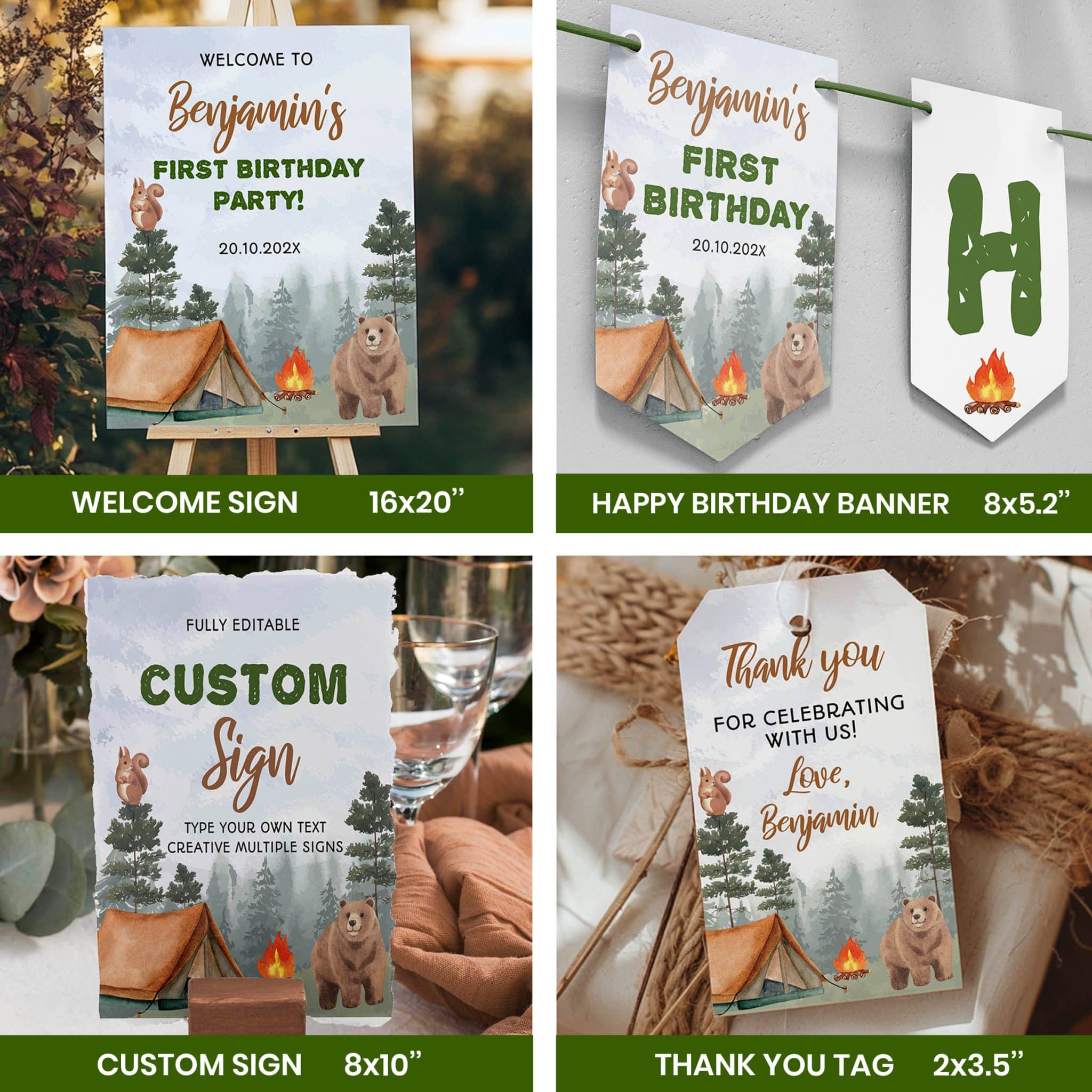 Celebrate in style with our camping theme party woodland animal birthday bundle! Perfect for a boy birthday, this all-in-one set features adorable forest animals and rustic outdoor elements. It includes invitations, banners, cupcake toppers, favor tags, and more—all customizable with your child’s name, age, and party details. See everything included below.