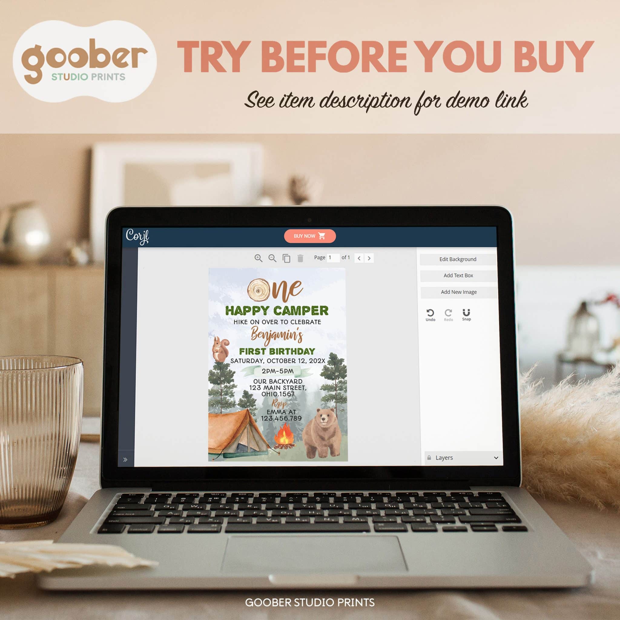 An access link to your editable camping birthday bundle set will be sent to your e-mail address. The link allows you to edit, save and download your designs as JPG or PDF files. All the included designs and their sizes are: