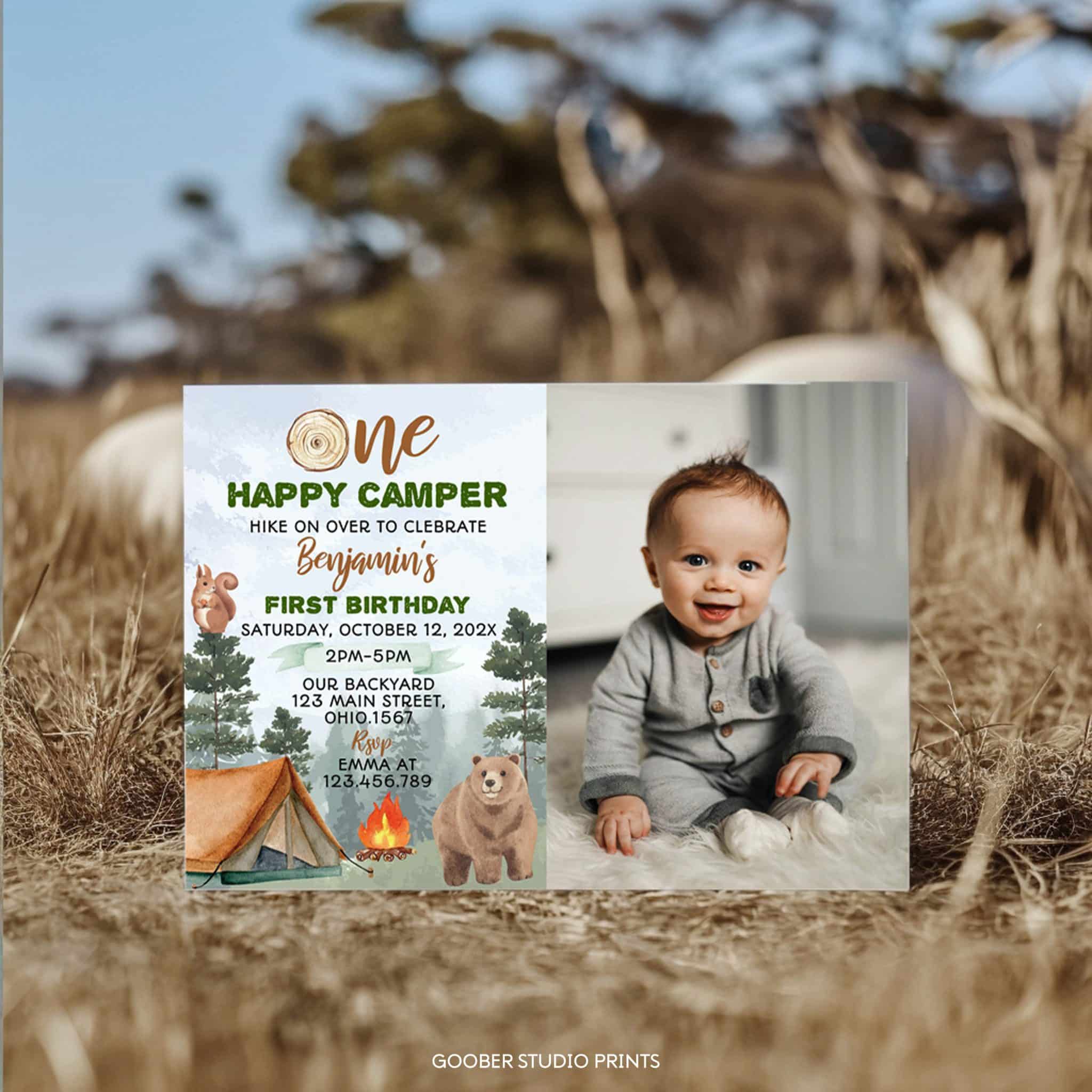 Get ready to celebrate your little camper’s first big milestone with our camping 1st birthday photo invitation! Featuring sweet woodland animals, rustic tents, and forest-inspired details, this design is perfect for a boy birthday and a cozy camping theme party. Customize it with your event info and print it at home or professionally—an easy, adorable, and budget-friendly way to invite friends and family to the adventure!