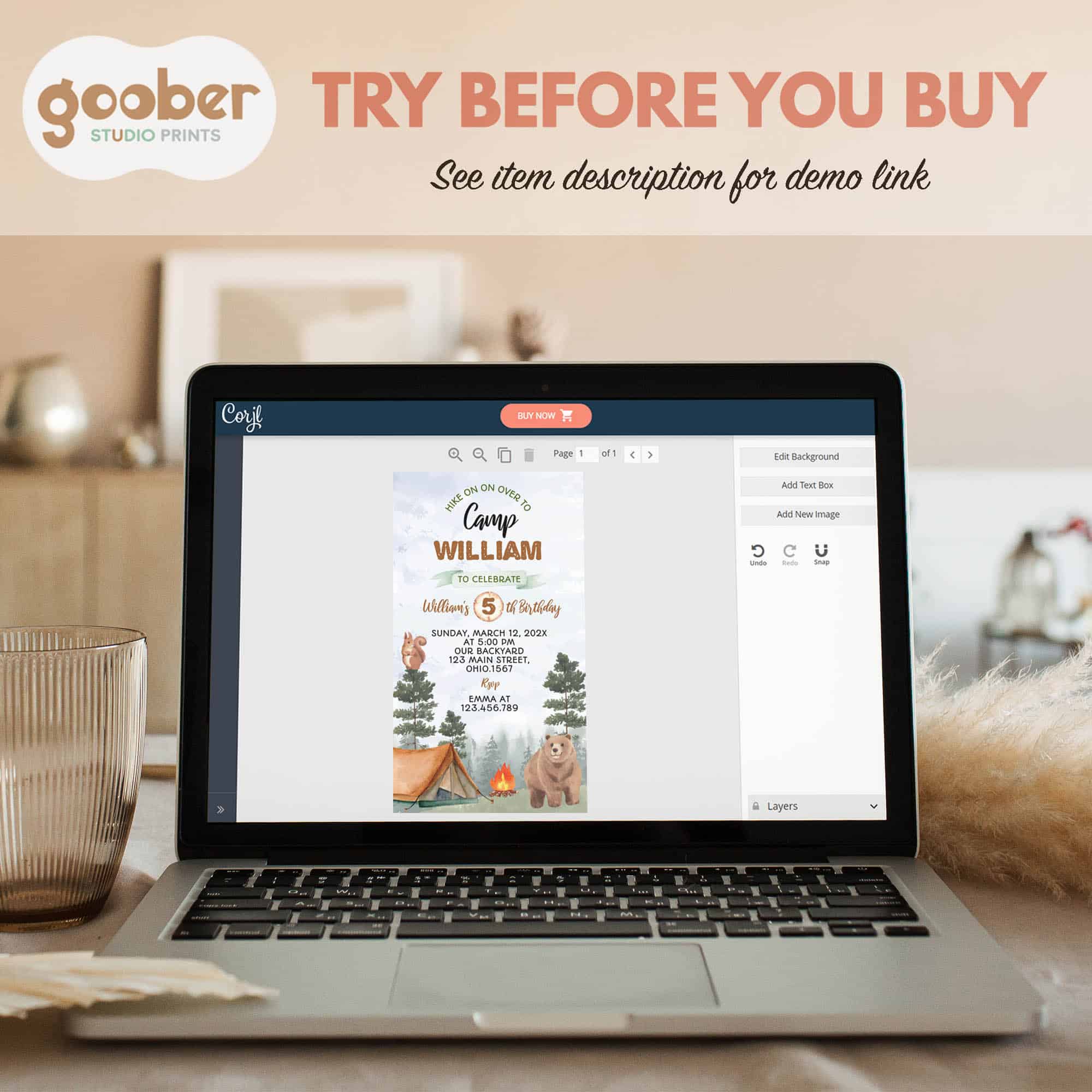 An access link to your editable camping birthday evite design will be sent to your e-mail address. The link allows you to edit, save and download your design as JPG or PDF file. The design is created for 2 sizes: 1080x1920px (good for most smartphones) and 1125x2436px (good for current generation smartphones). We’re happy to answer any questions through our contact page.