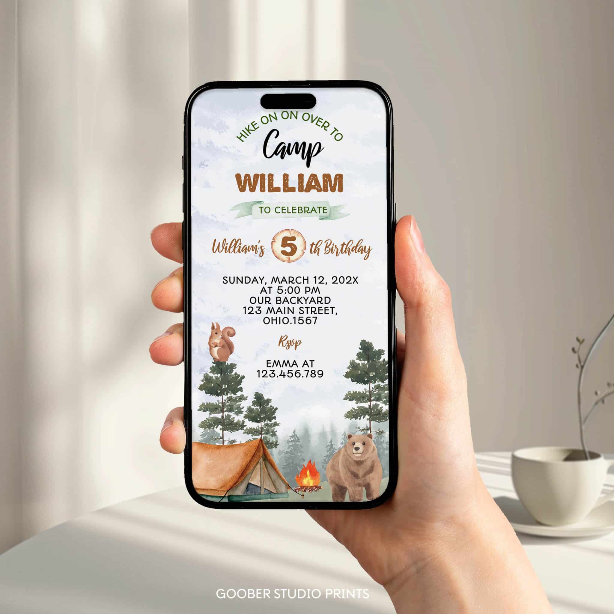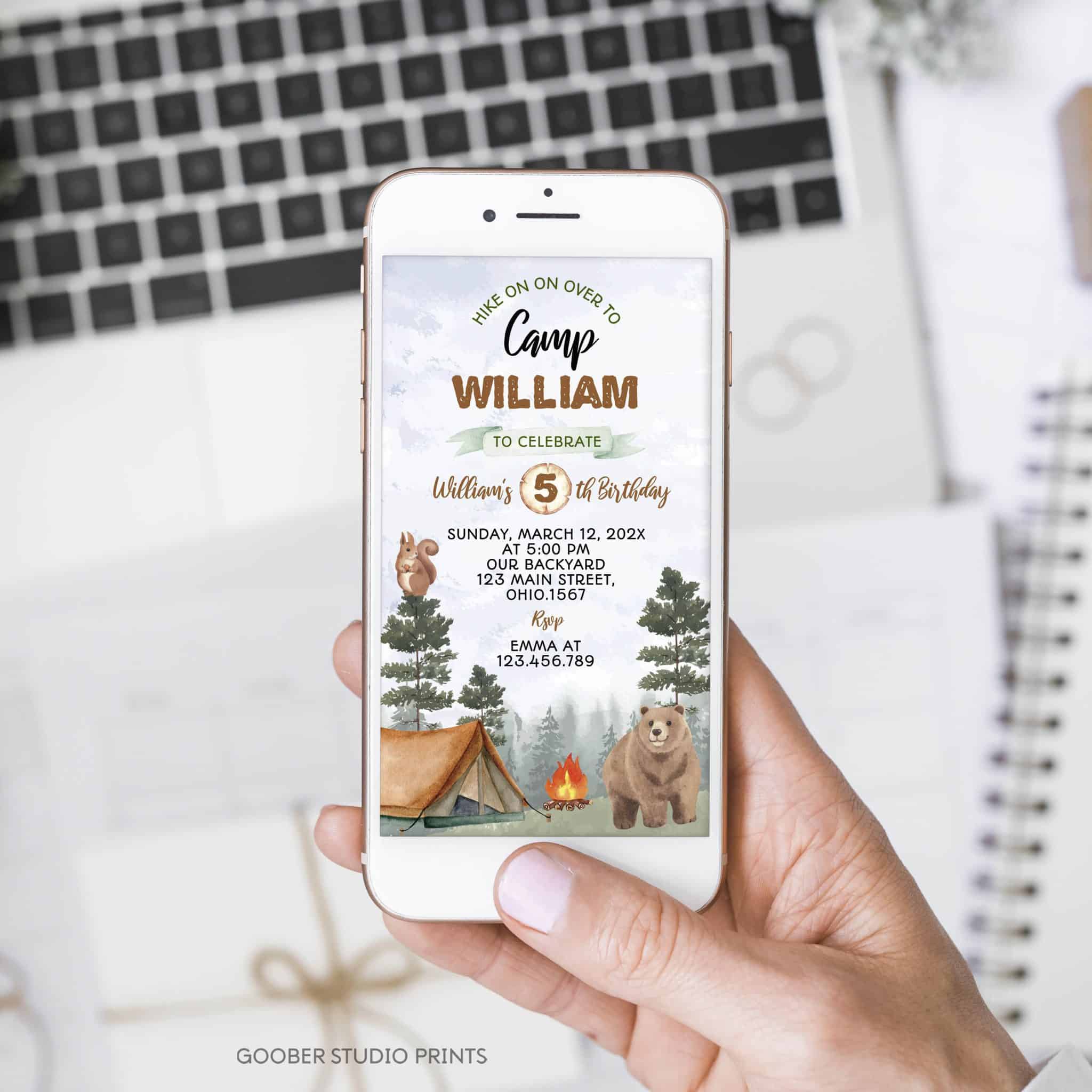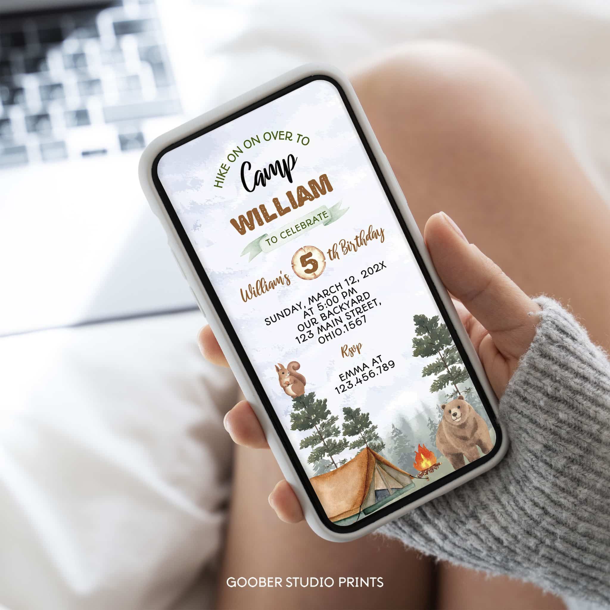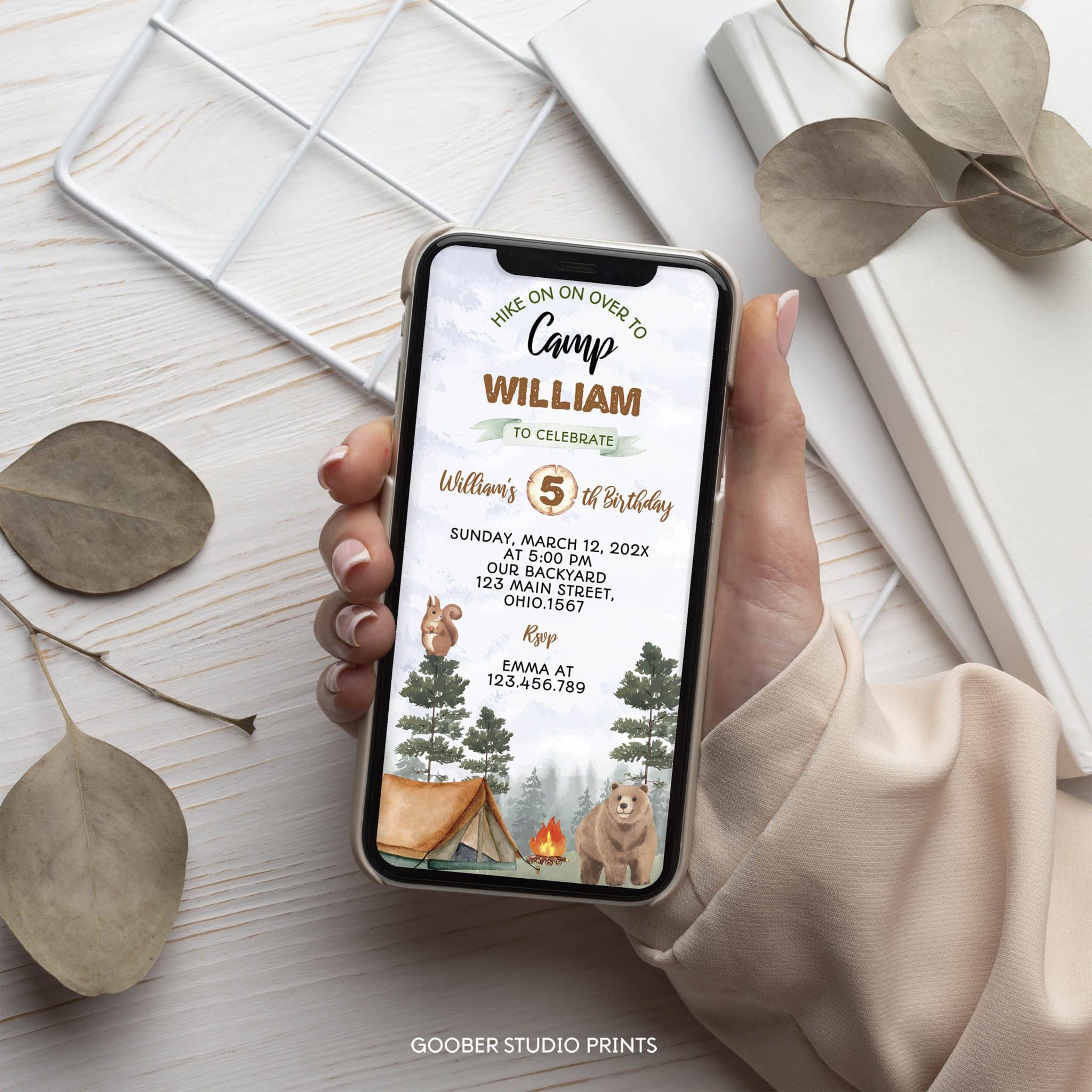 Celebrate your little adventurer’s big day with our camping theme party birthday evite! Featuring cute woodland animals, tents, and forest elements, this digital invitation is perfect for a rustic boy birthday celebration. Designed to match your camping party supplies, it sets the scene for a fun and cozy outdoor-inspired bash!