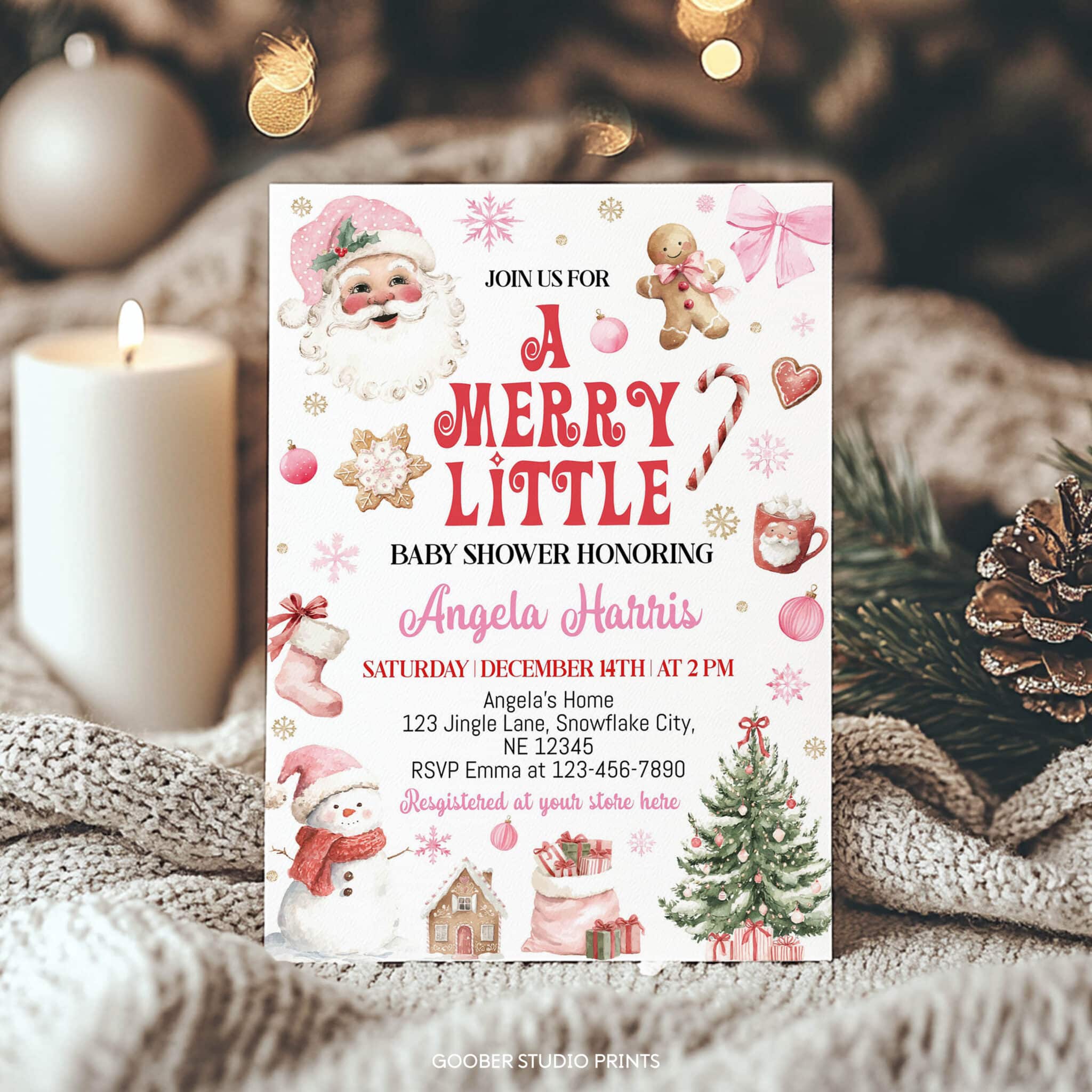 Welcome the season and celebrate your little one with our a merry little Christmas baby shower invitation! Perfect for a baby girl, this charming design features Santa Claus, a sweet snowman, and shimmering snowflakes surrounded by cozy holiday accents in pink and red with an adorable pink bow. Personalize it with your event details—date, time, location, and a heartfelt message—to make it truly yours. With its cheerful holiday charm and festive colors, it’s the perfect way to invite loved ones to a magical Christmas baby shower celebration!