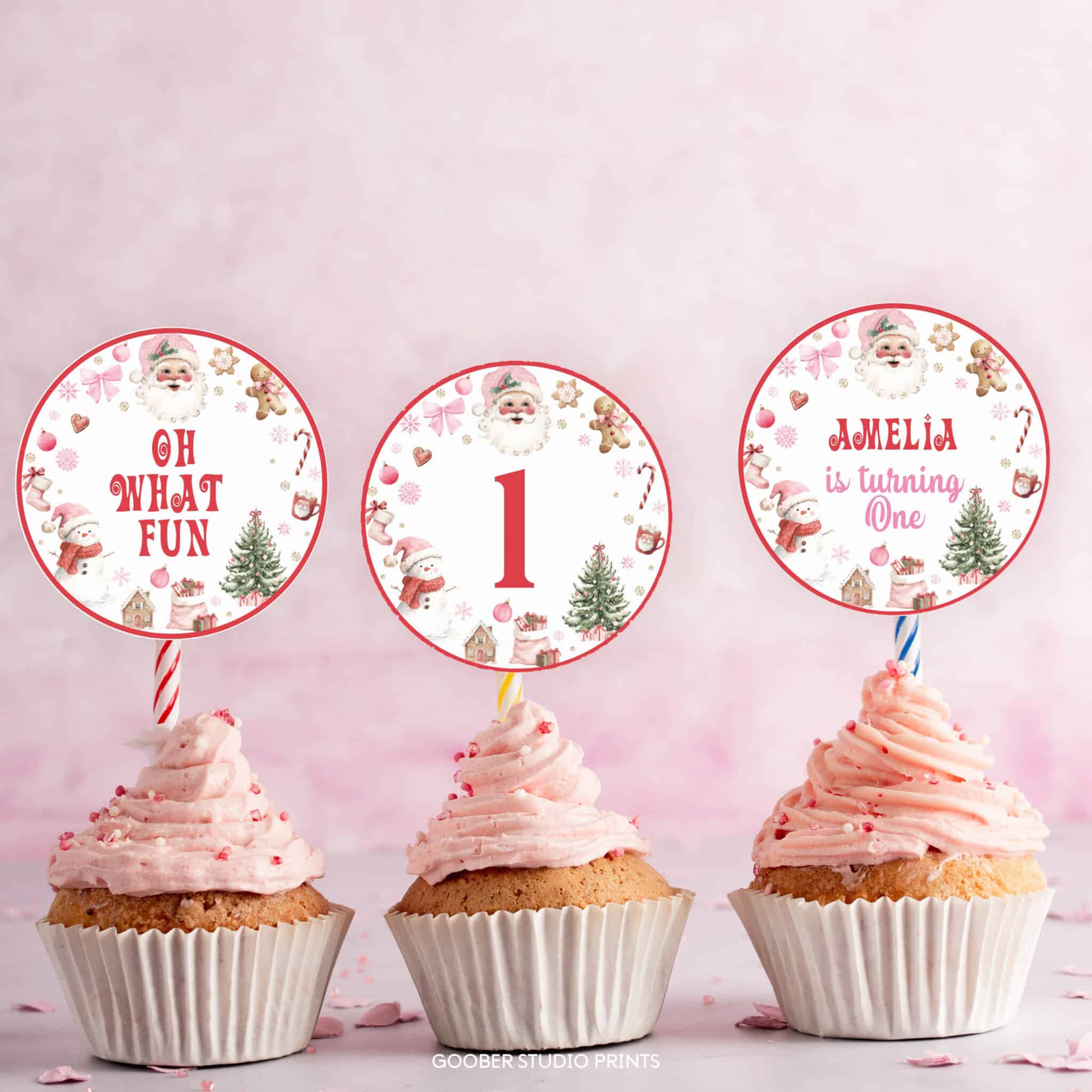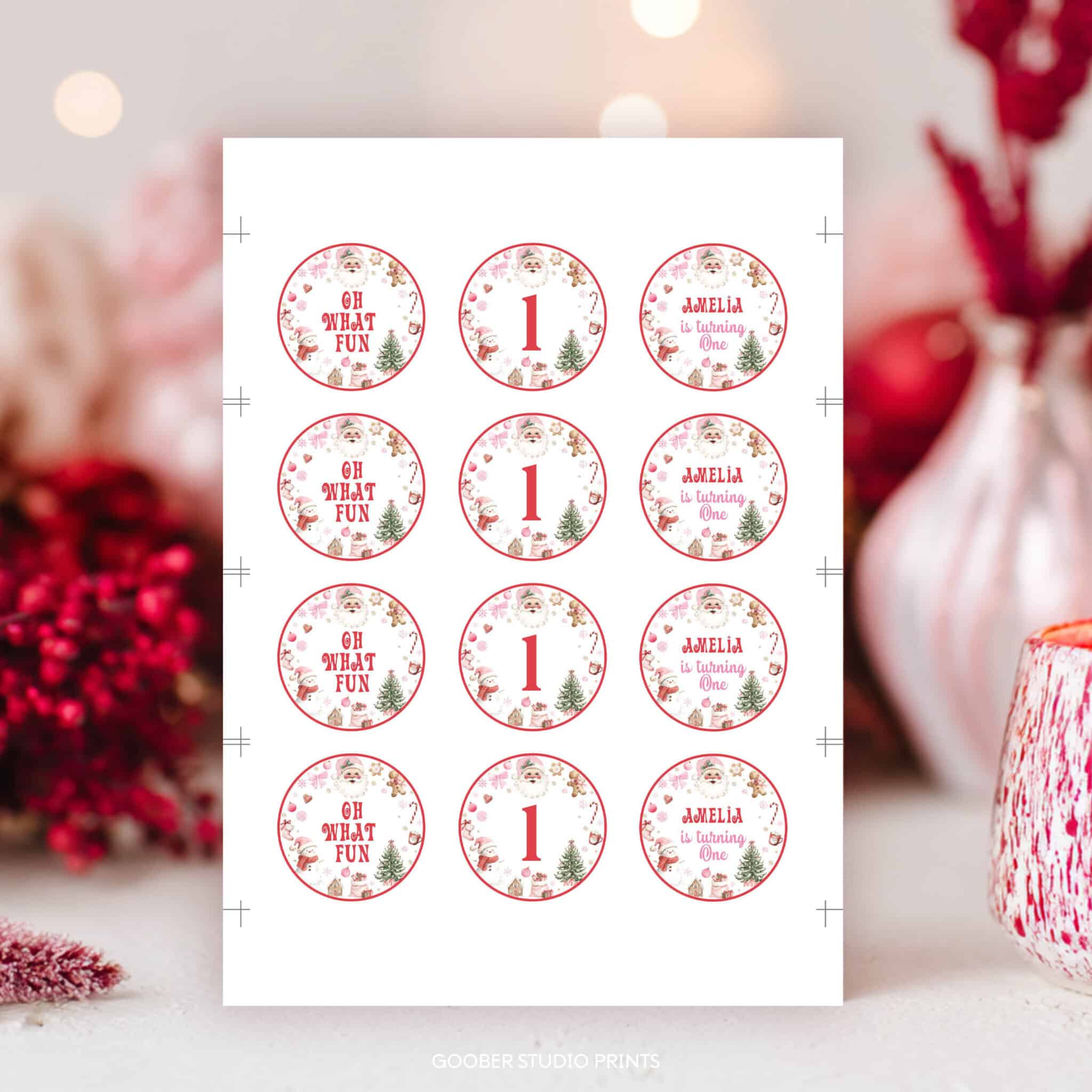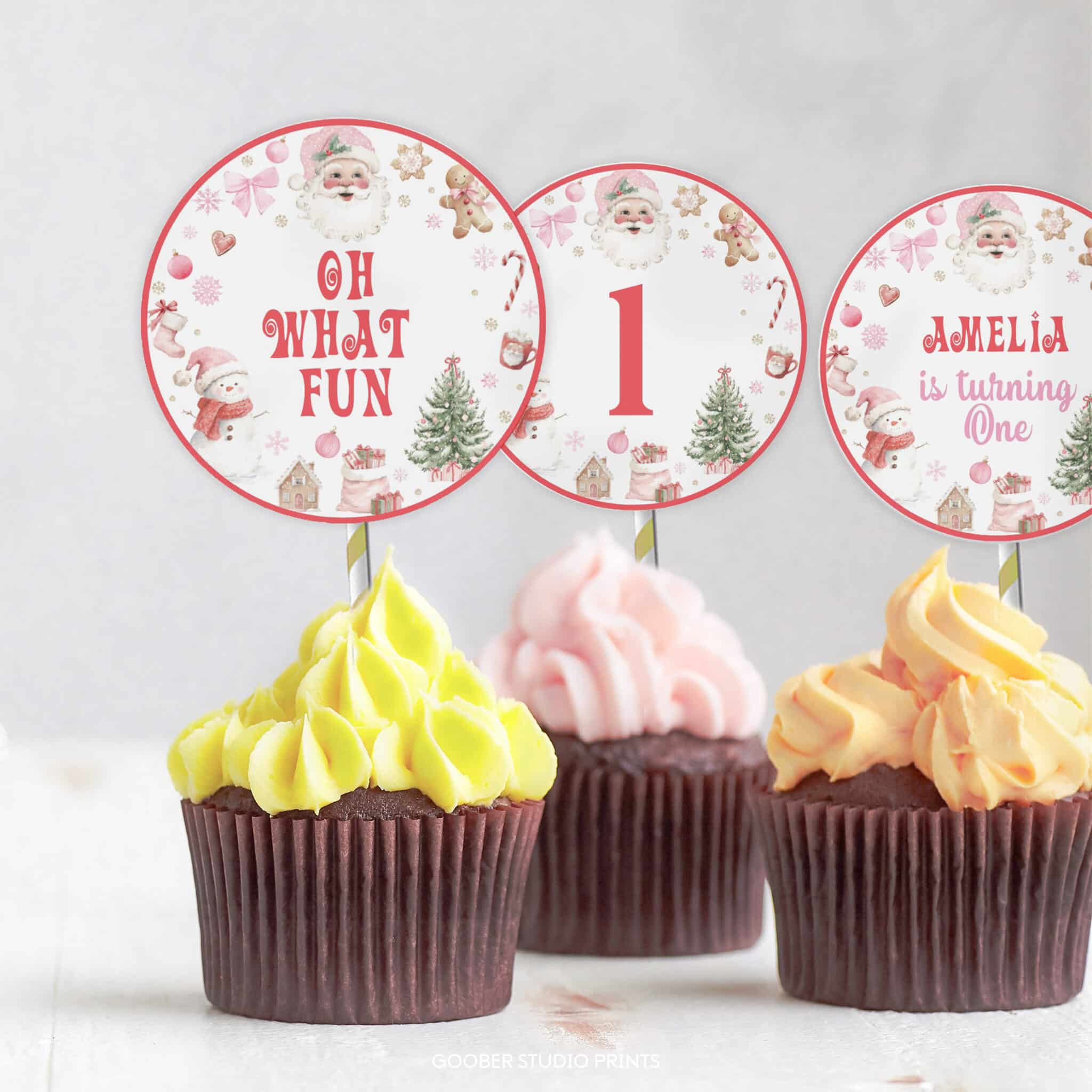 Top off your holiday treats with our oh what fun Christmas birthday cupcake toppers! Perfect for a girl birthday celebration, these adorable toppers feature Santa Claus, sparkling snowflakes, and cozy holiday accents in pink and red with a sweet pink bow. Personalize with your child’s name and age to make them extra special. Easy to print at home on standard cardstock, they’re perfect for cupcakes, cake pops, muffins, and more. A fun and budget-friendly way to add cheerful holiday magic to your Santa Claus birthday celebration!