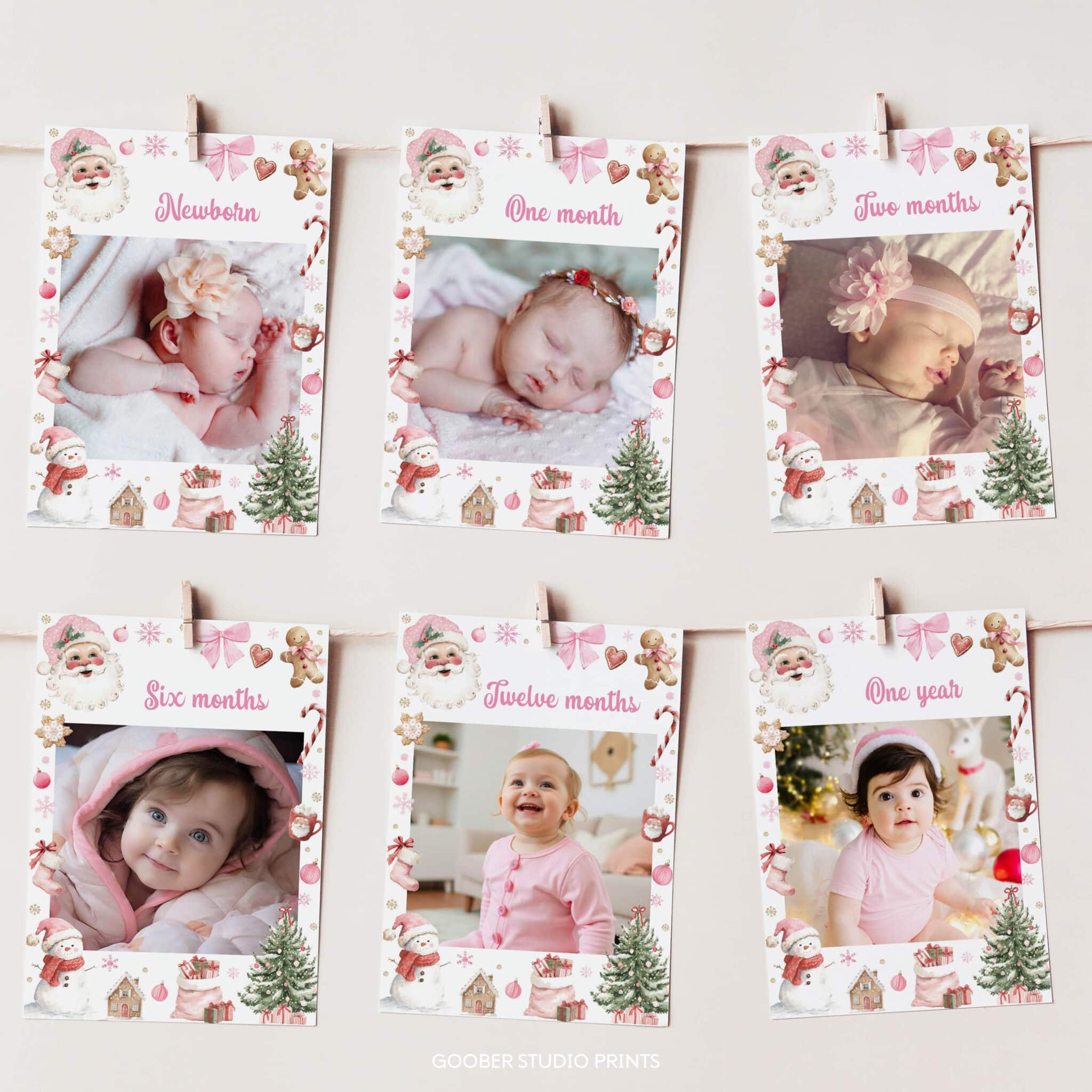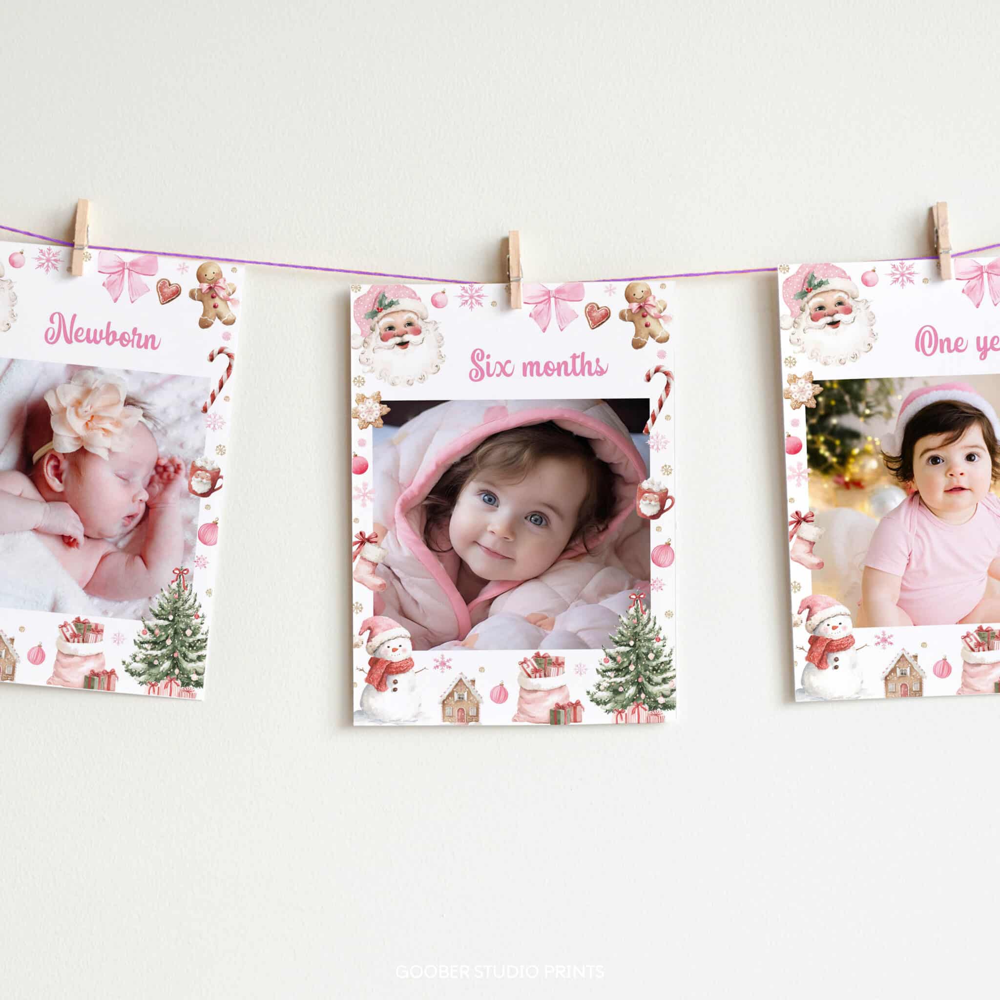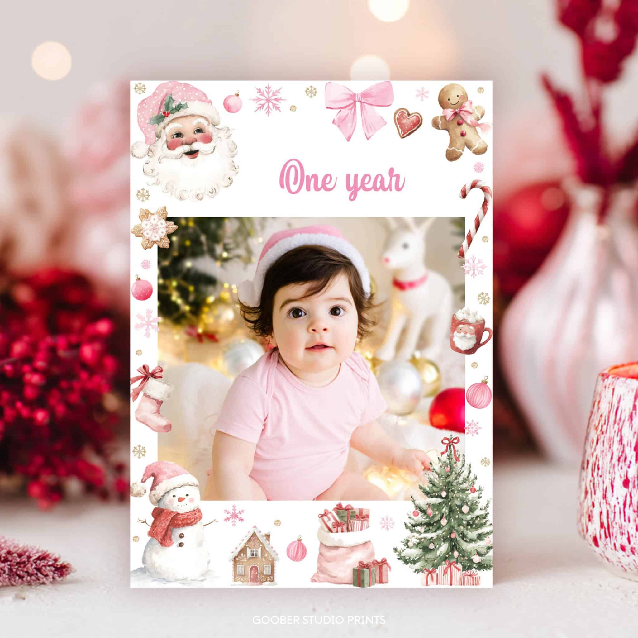 Mark your baby girl’s oh what fun Christmas birthday in style with our festive Santa Claus birthday photo banner! Featuring Santa Claus, sparkling snowflakes, and cozy holiday accents in pink and red with a sweet pink bow, this banner includes space for 12 monthly photos, your child’s name, and age. Perfect for a girl birthday celebration, it’s easy to customize and print at home on standard 5×7-inch paper. A heartwarming way to showcase your little one’s first year and create a cherished keepsake from your Christmas birthday celebration!
