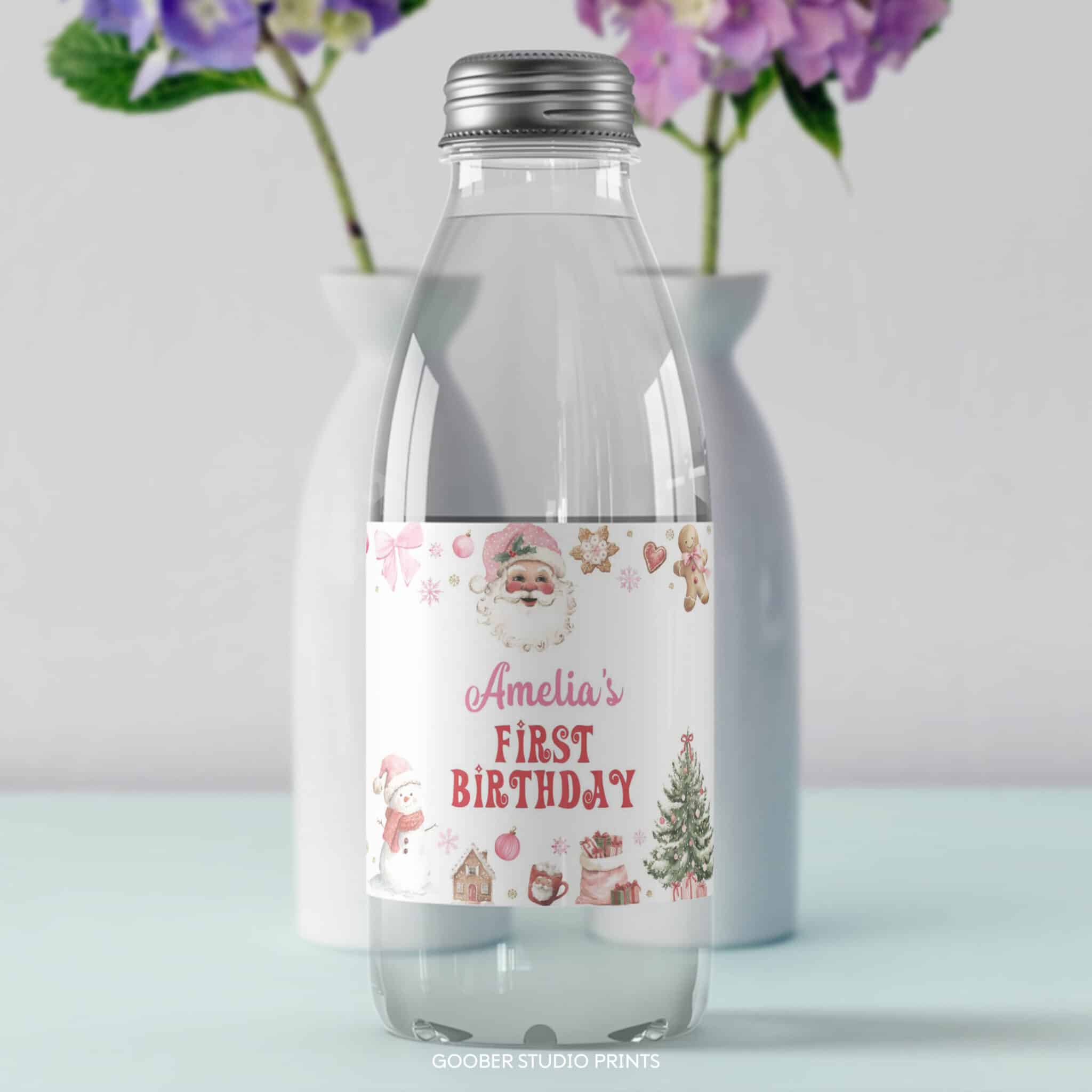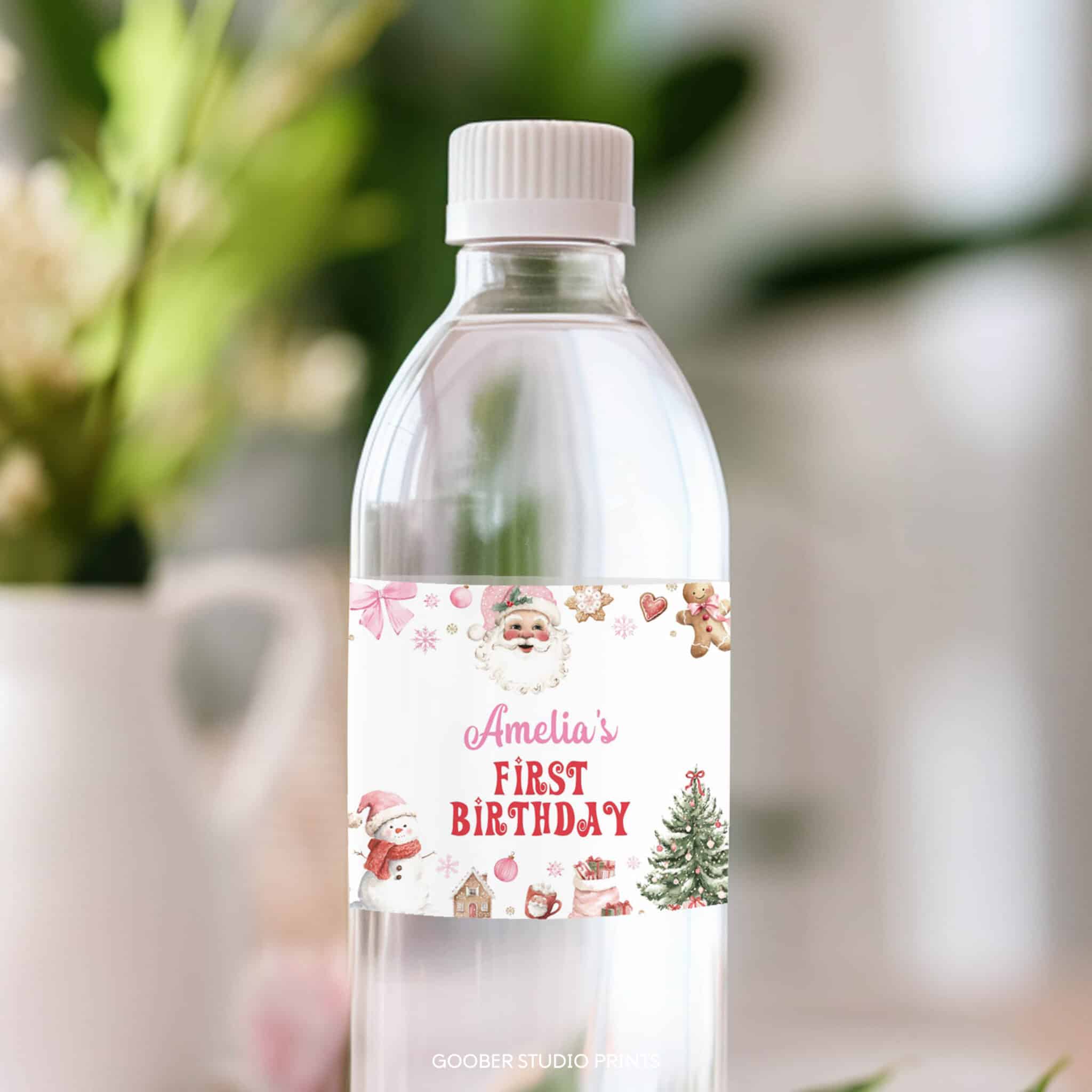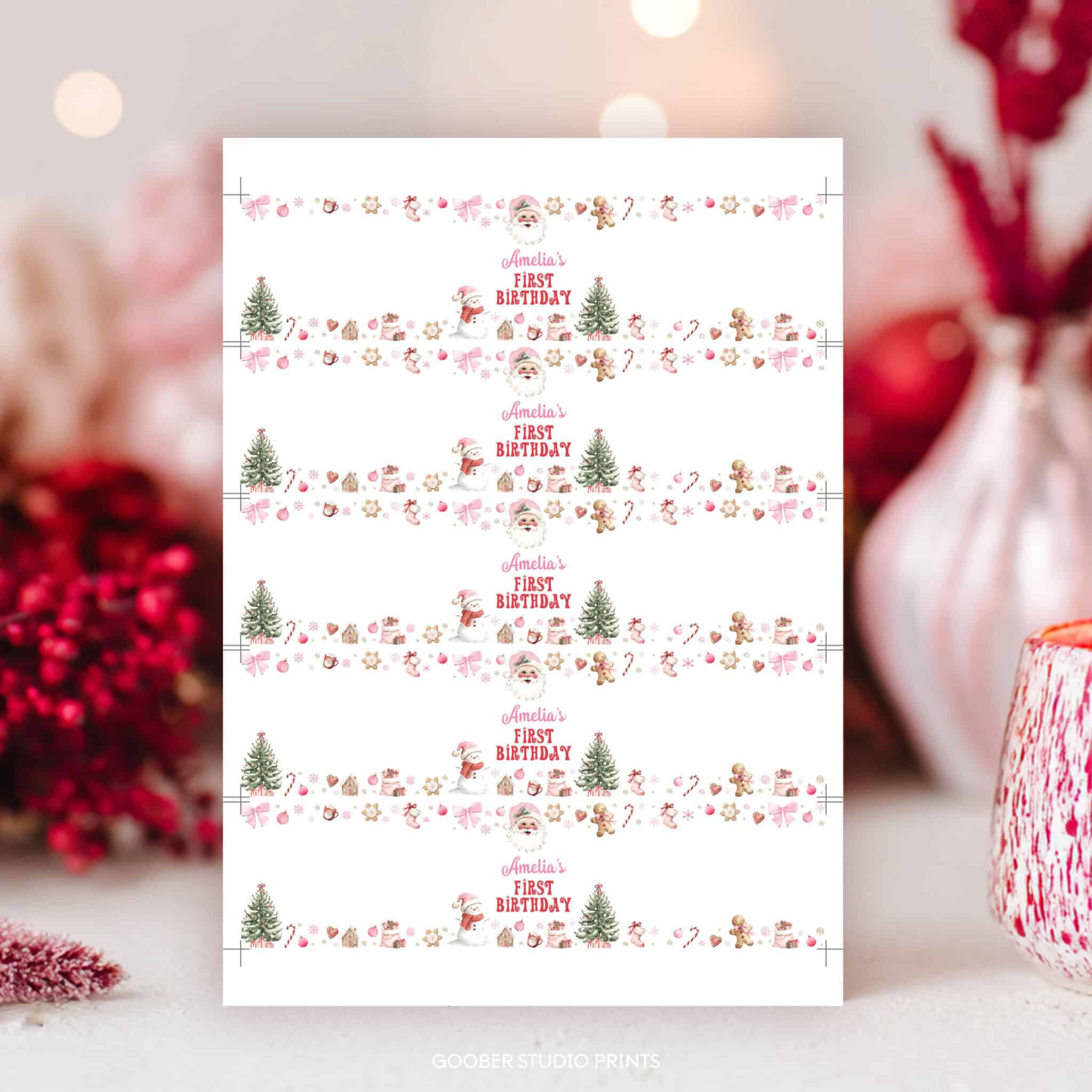 Add an oh what fun festive touch to your party drinks with our Christmas birthday water bottle labels! Perfect for a girl birthday celebration, these cheerful labels feature Santa Claus, twinkling snowflakes, and cozy holiday accents in pink and red with a sweet pink bow. Personalize with your child’s name and age for an extra-special touch. Designed to fit standard 8.5″x2″ bottles and easy to print at home, they’re a joyful and budget-friendly addition to your Santa Claus birthday or oh what fun Christmas birthday decorations!