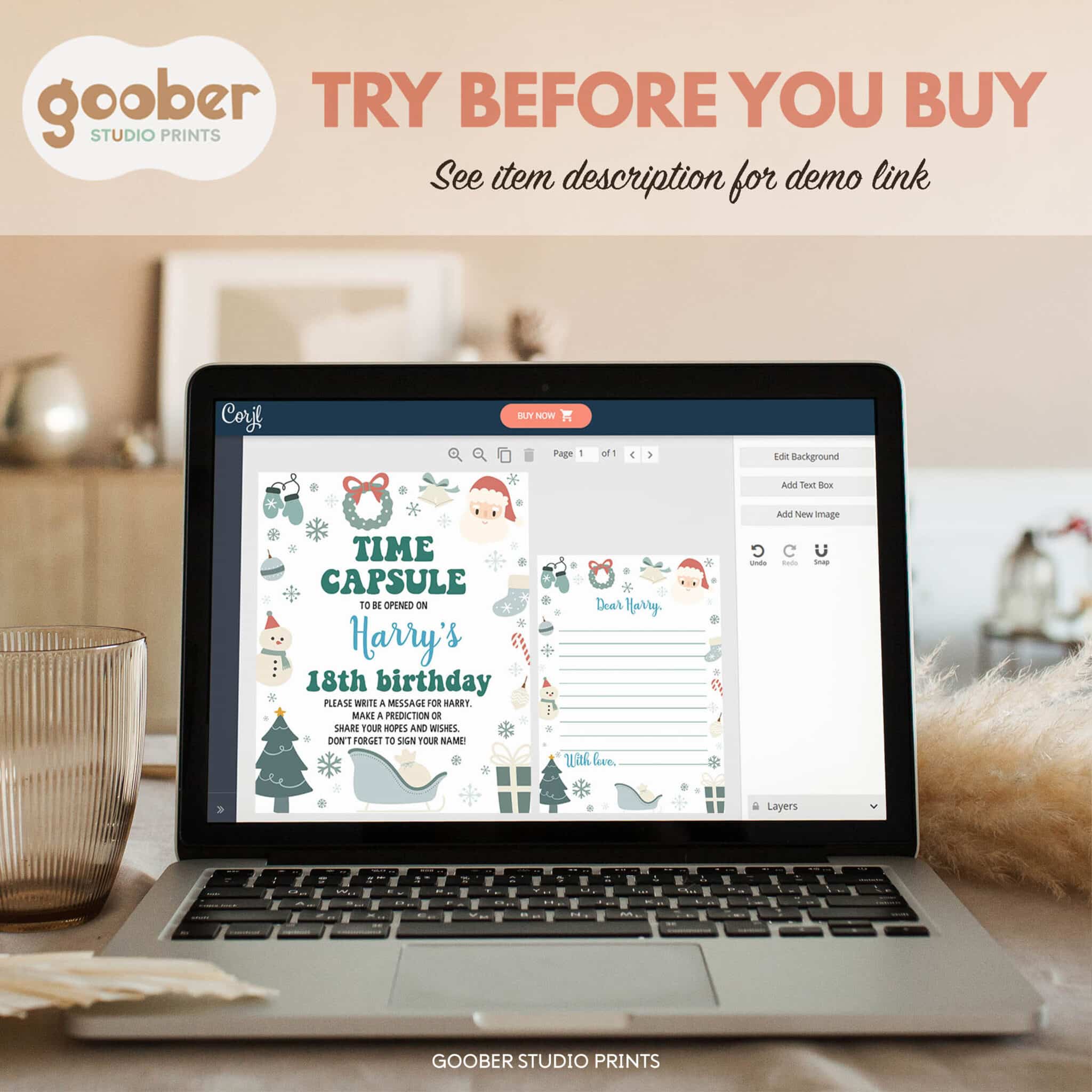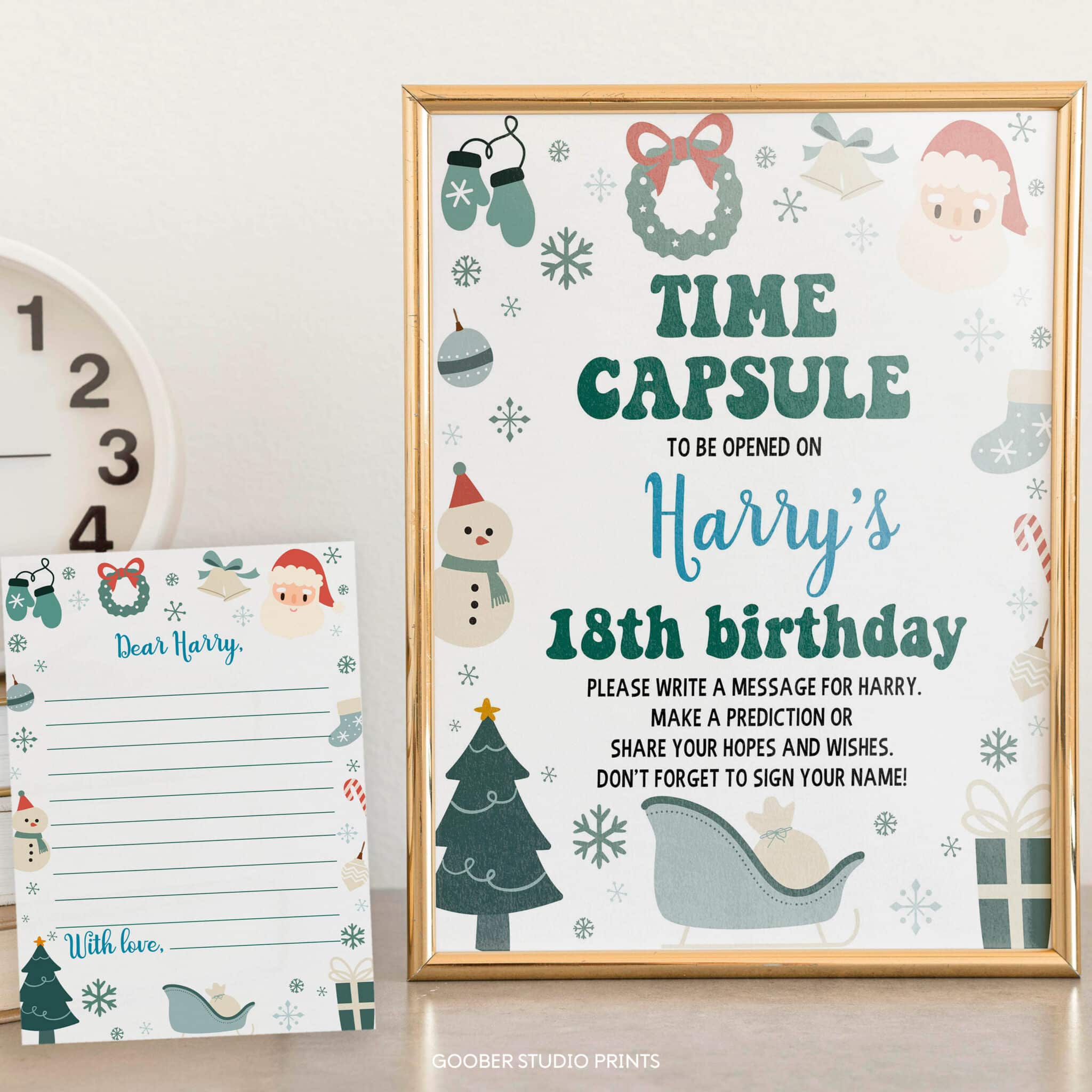 Create lasting oh what fun memories with our Christmas winter birthday time capsule set! Perfect for a boy birthday celebration, this festive set features Santa, sparkling snowflakes, and cozy Christmas accents in a soft watercolor design. It includes a time capsule sign and matching cards for guests to share heartfelt wishes, memories, and predictions for your little one’s future. A meaningful addition to your Christmas winter birthday party, this keepsake can be sealed and treasured for years to come—capturing the magic of your baby boy’s special day.
