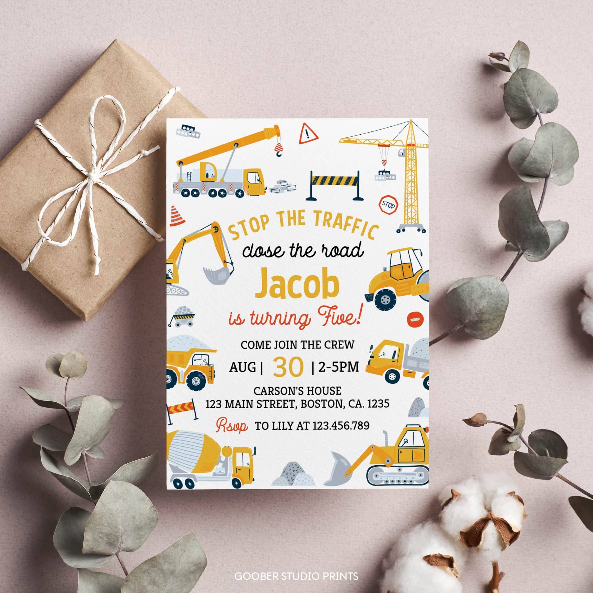 Break ground on an unforgettable celebration with our construction-themed birthday invitation! With vibrant dump truck designs and a fun worksite vibe, this invite is perfect for a boy birthday party. Easily customizable and printable at home, it’s the ideal way to kick off your construction themed party. Pair it with construction party favors and decorations to build a celebration full of excitement!