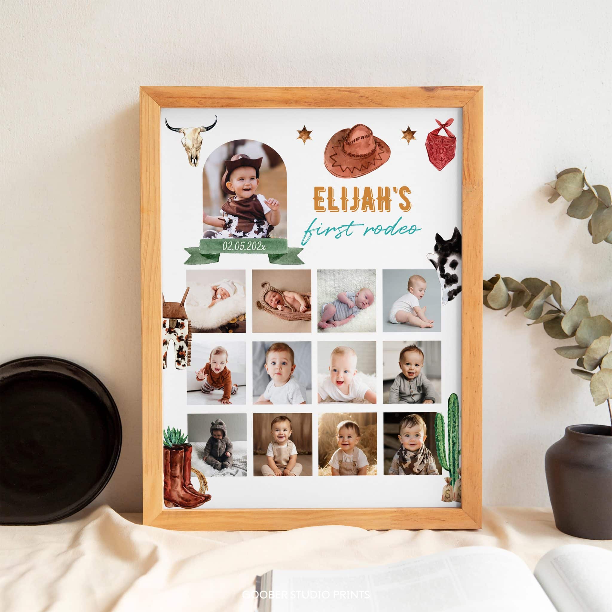An access link to your editable first rodeo birthday photo collage design will be sent to your e-mail address. The link allows you to edit, save and download your design as JPG or PDF file. The design is made for printing at 16×20 inches. We’re happy to answer any questions through our contact page.