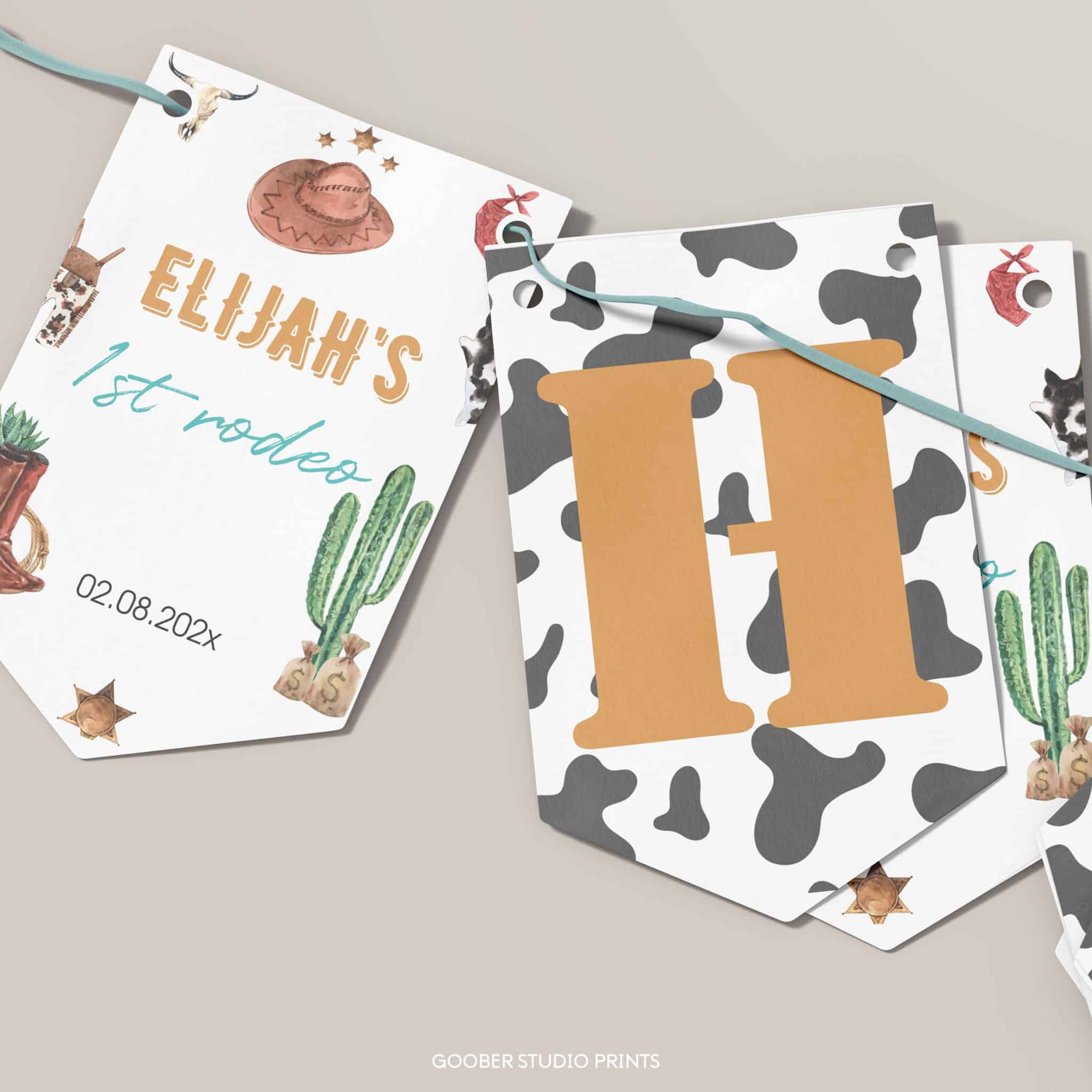 Saddle up for an unforgettable celebration with our first rodeo birthday banner! Featuring a charming cowboy design and bold, rustic lettering, this banner spells out “Happy Birthday” in a playful western theme. Perfect for a first rodeo or cowboy birthday party, it can be personalized with the birthday boy’s name and age. Print it at home on standard paper to add the perfect touch to your western theme party supplies!
