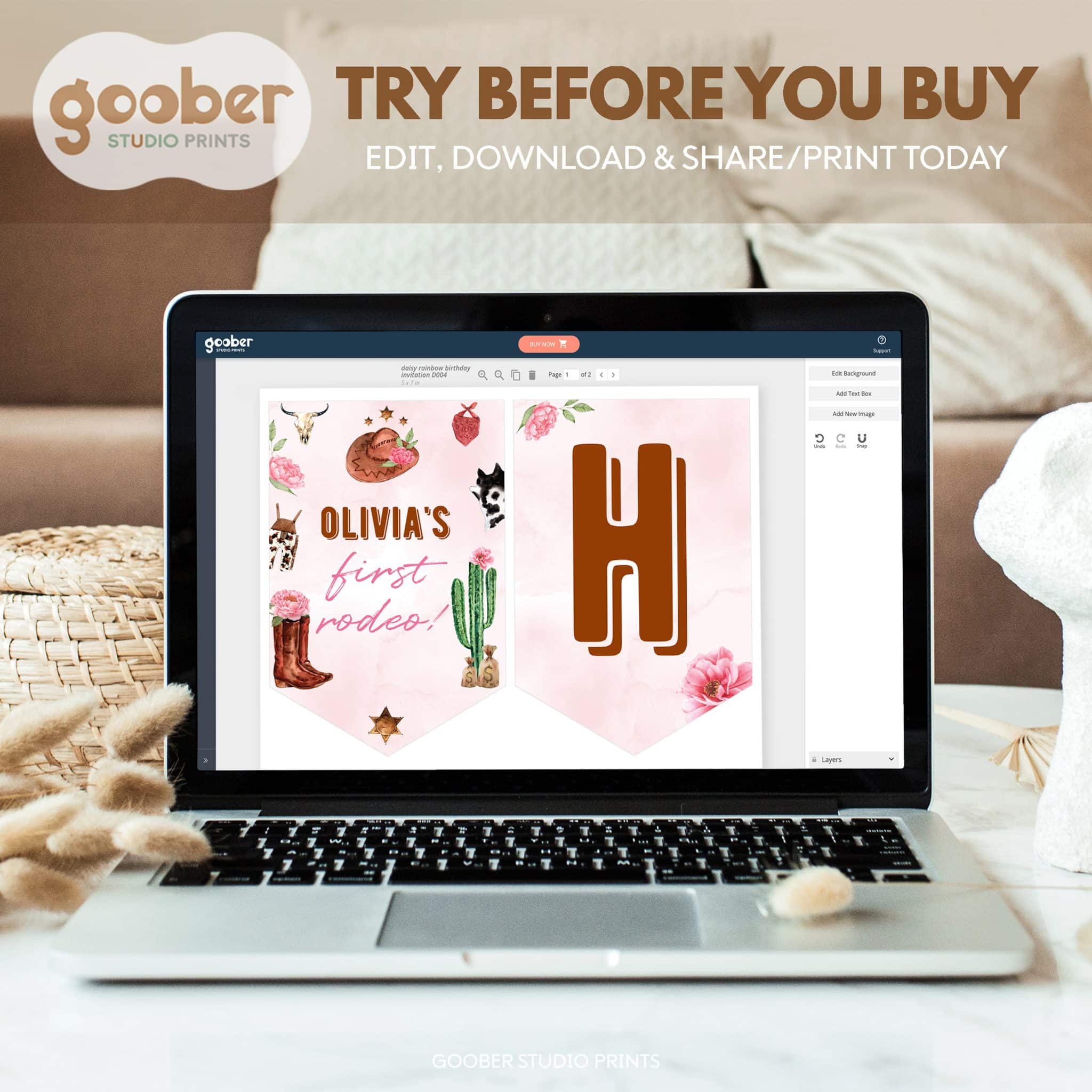 An access link to your editable first rodeo birthday banner design will be sent to your e-mail address. The link allows you to edit, save and download your design as JPG or PDF file. The design is made for printing at 8×5.2 inches. Two banners can be printed on one page of standard 8.5×11 inch paper. We’re happy to answer any questions through our contact page.
