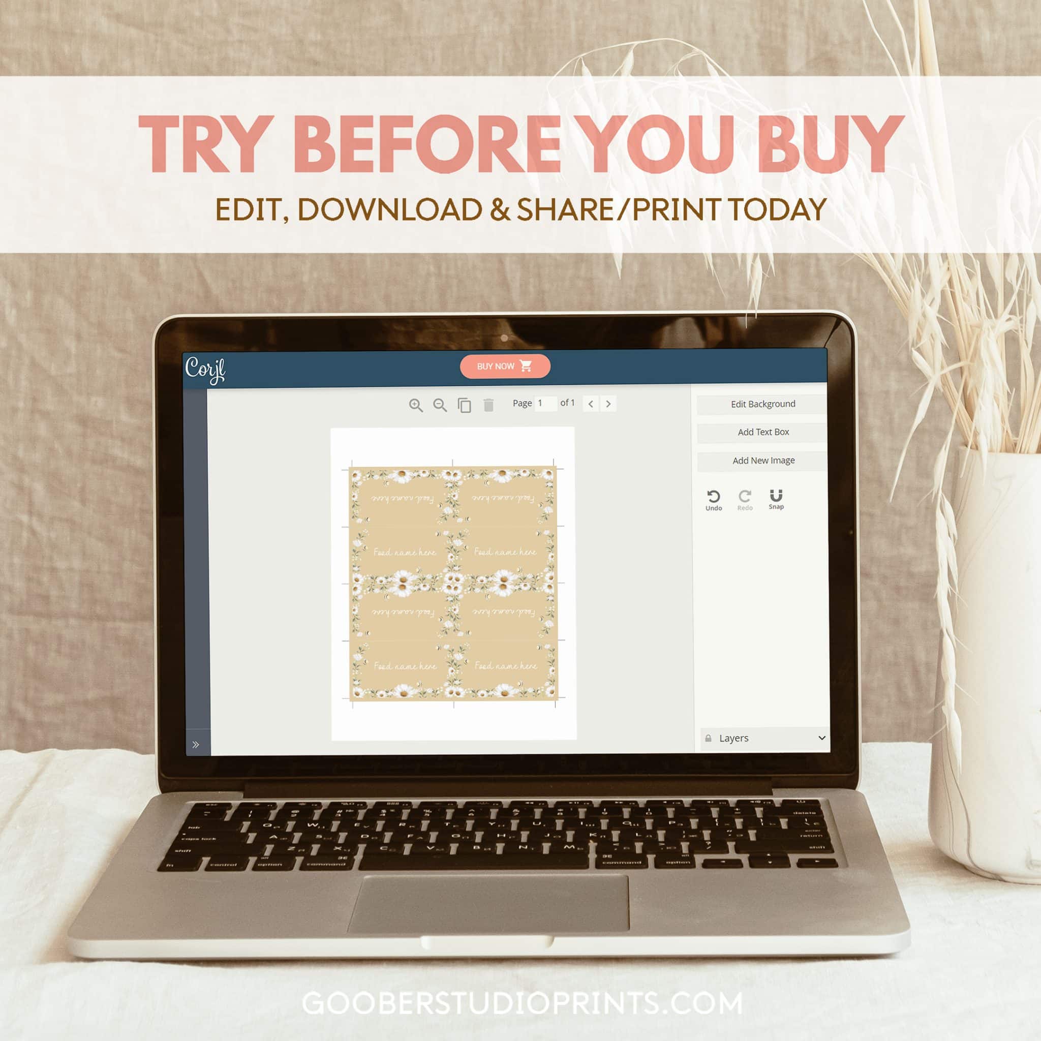 - After you place an order you will receive an email from Corjl to access your editable template. Please remember to provide your email at checkout.