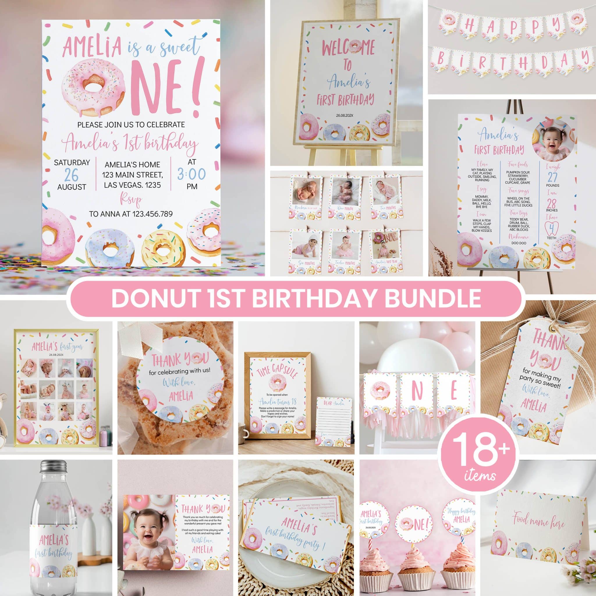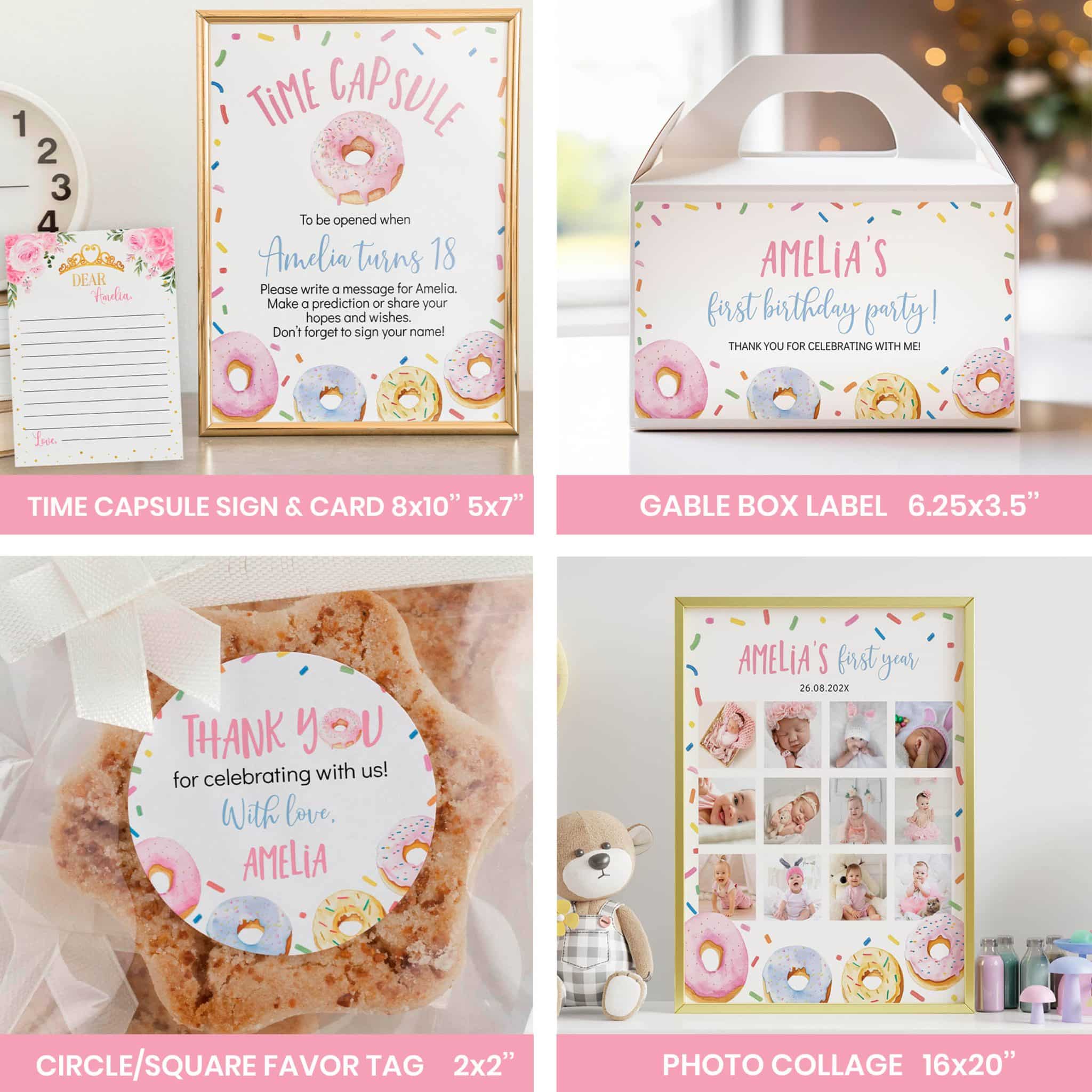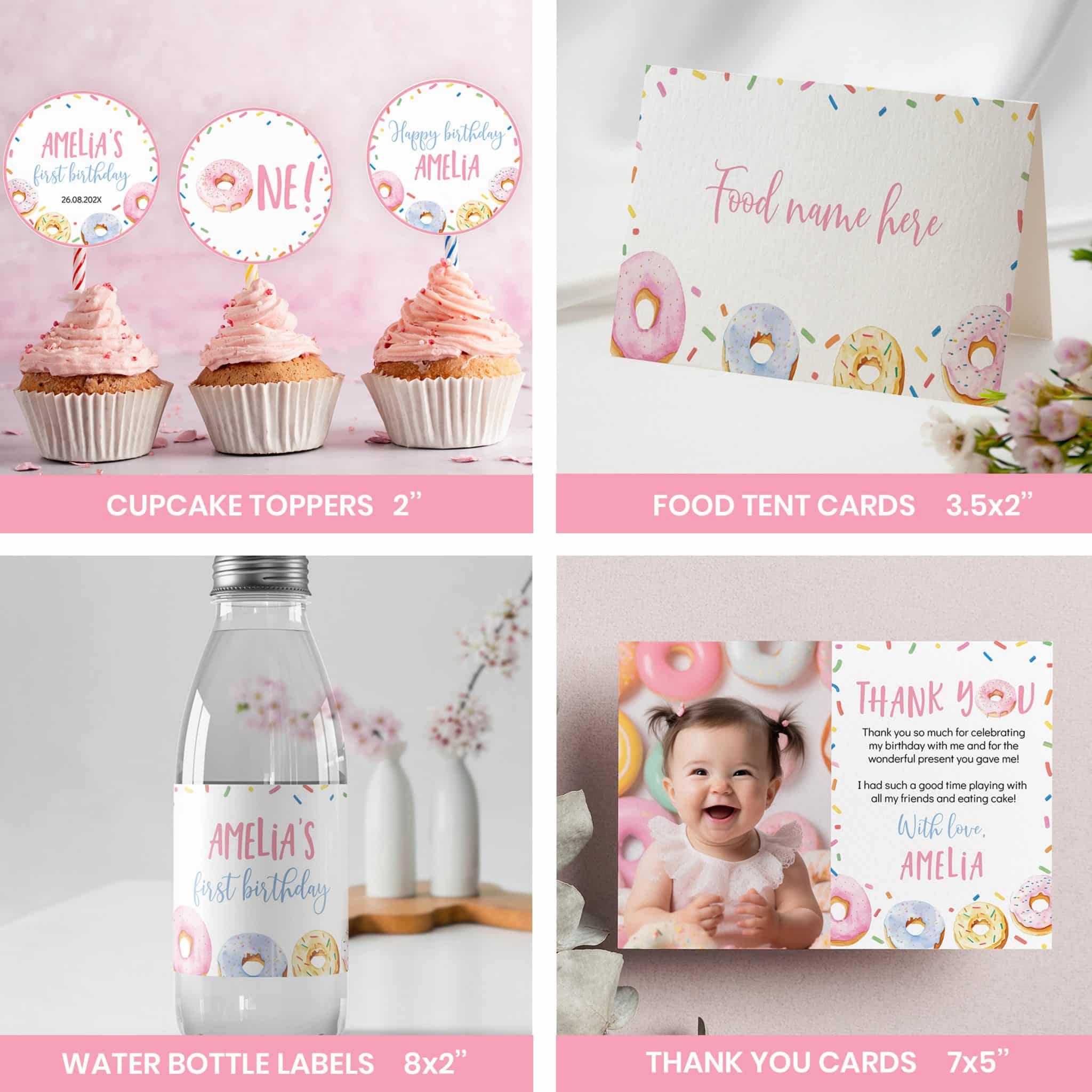 An access link to your editable donut birthday bundle set will be sent to your e-mail address. The link allows you to edit, save and download your designs as JPG or PDF files. All the included designs and their sizes are: