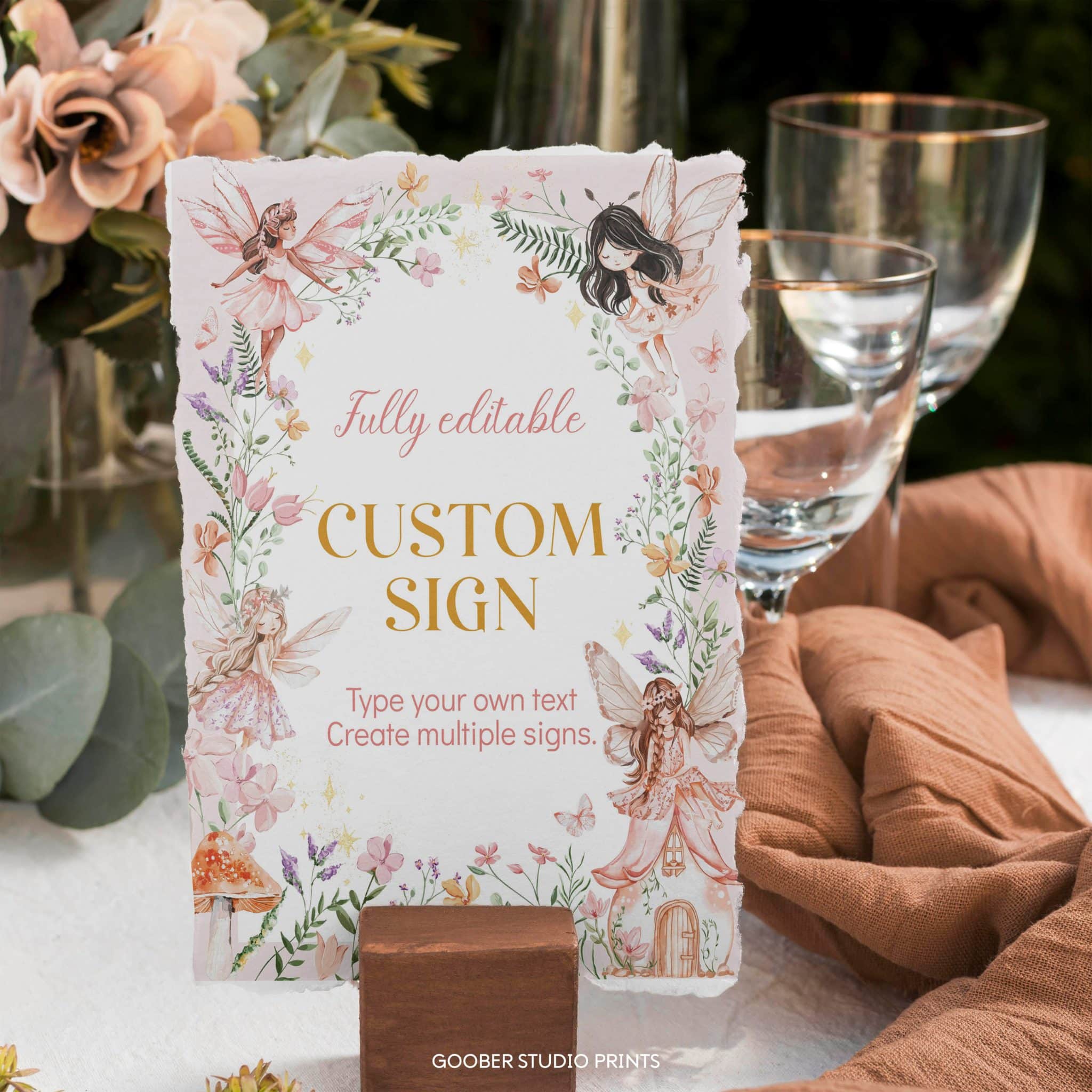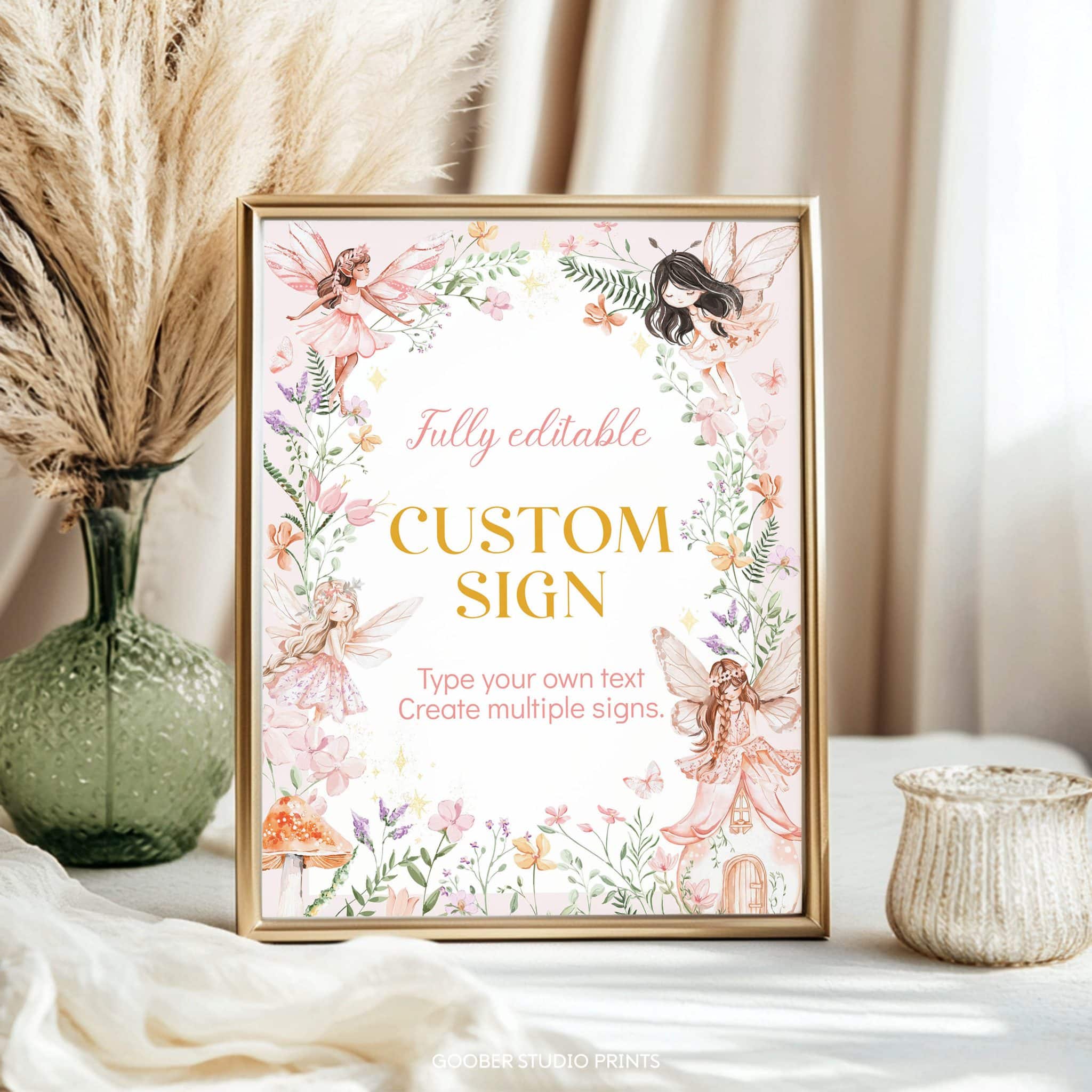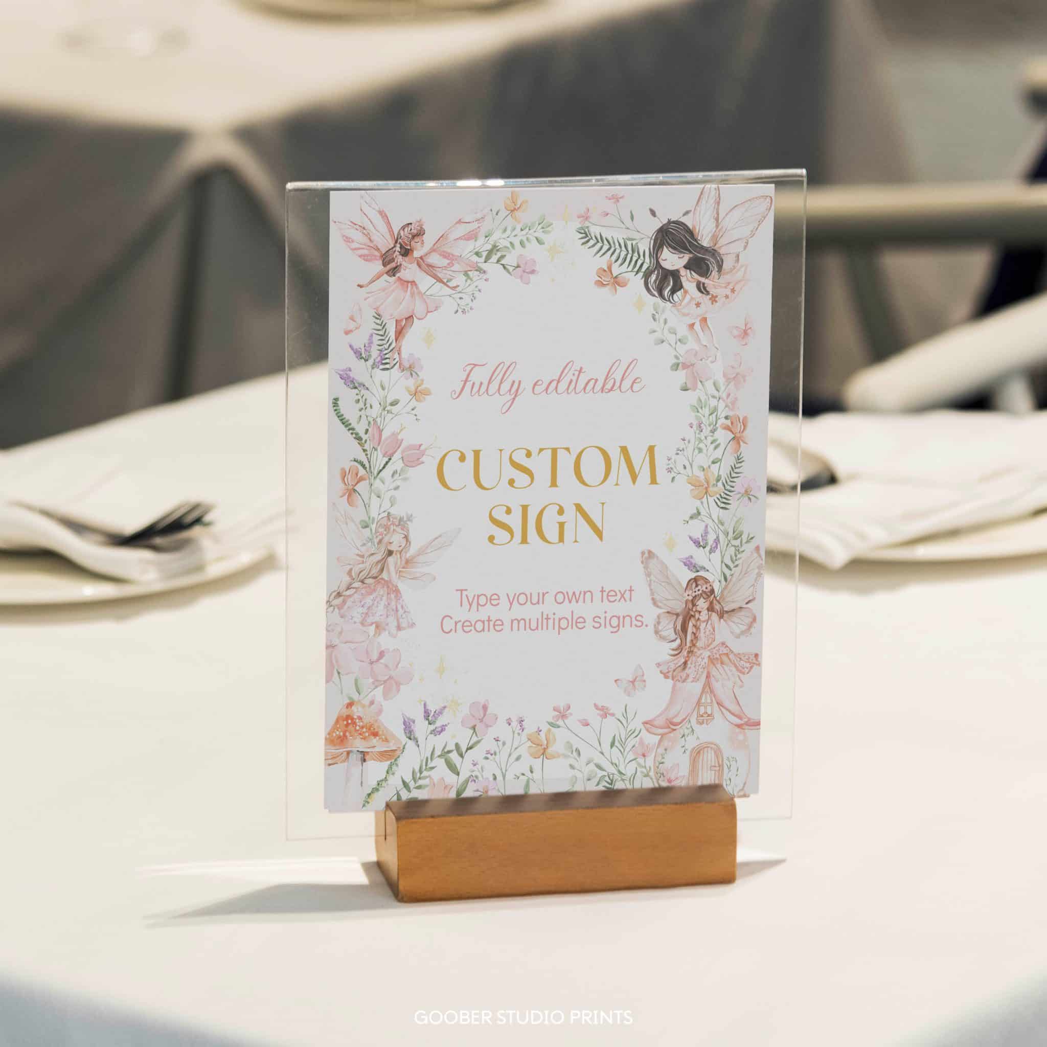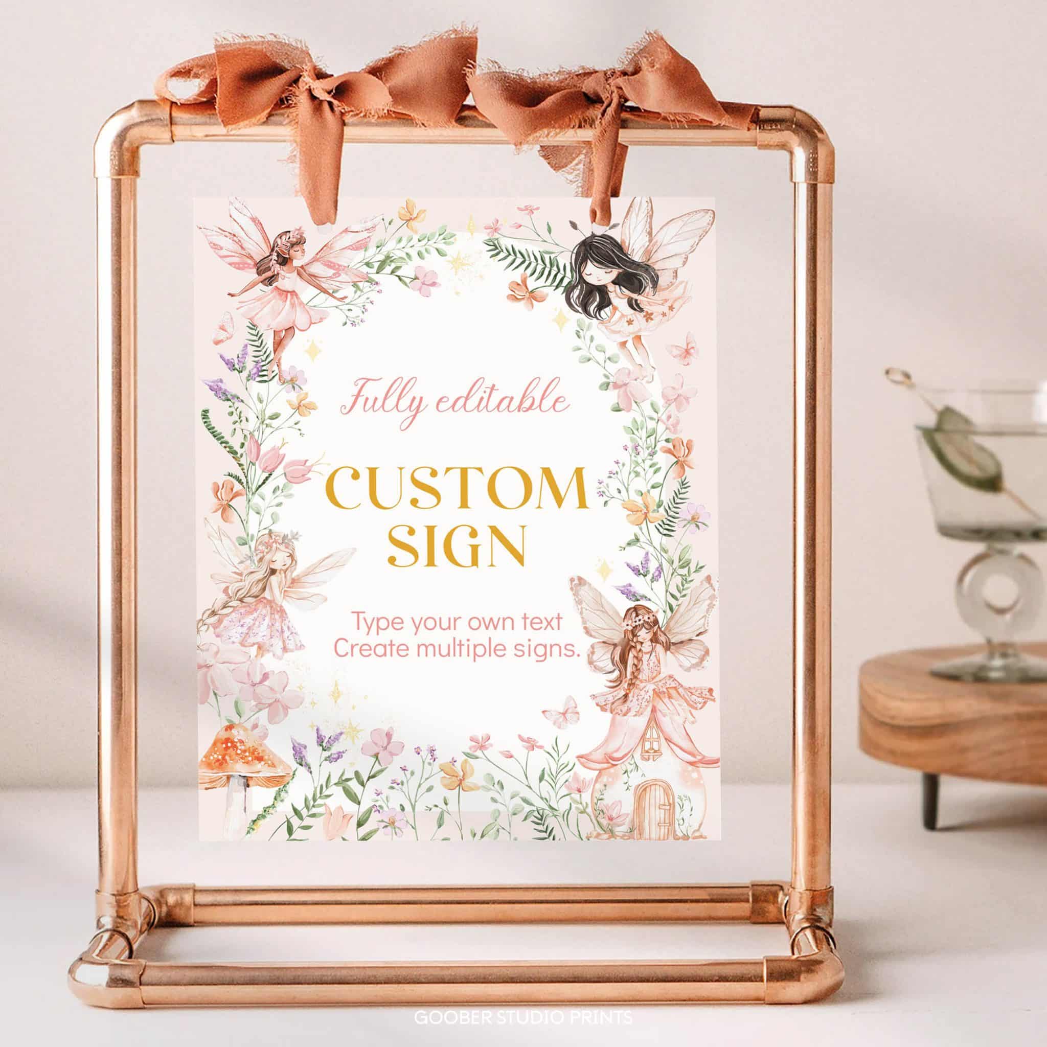 Create a magical enchanted forest atmosphere with our fairytale-inspired custom sign! Fully customizable with any text, name, or age, this 8×10-inch design features whimsical fairies, delicate floral accents, and soft pink hues—perfect for a spring garden celebration. Use it as a welcome sign, photo prop, or backdrop to add a charming personal touch to your fairy-themed birthday party!