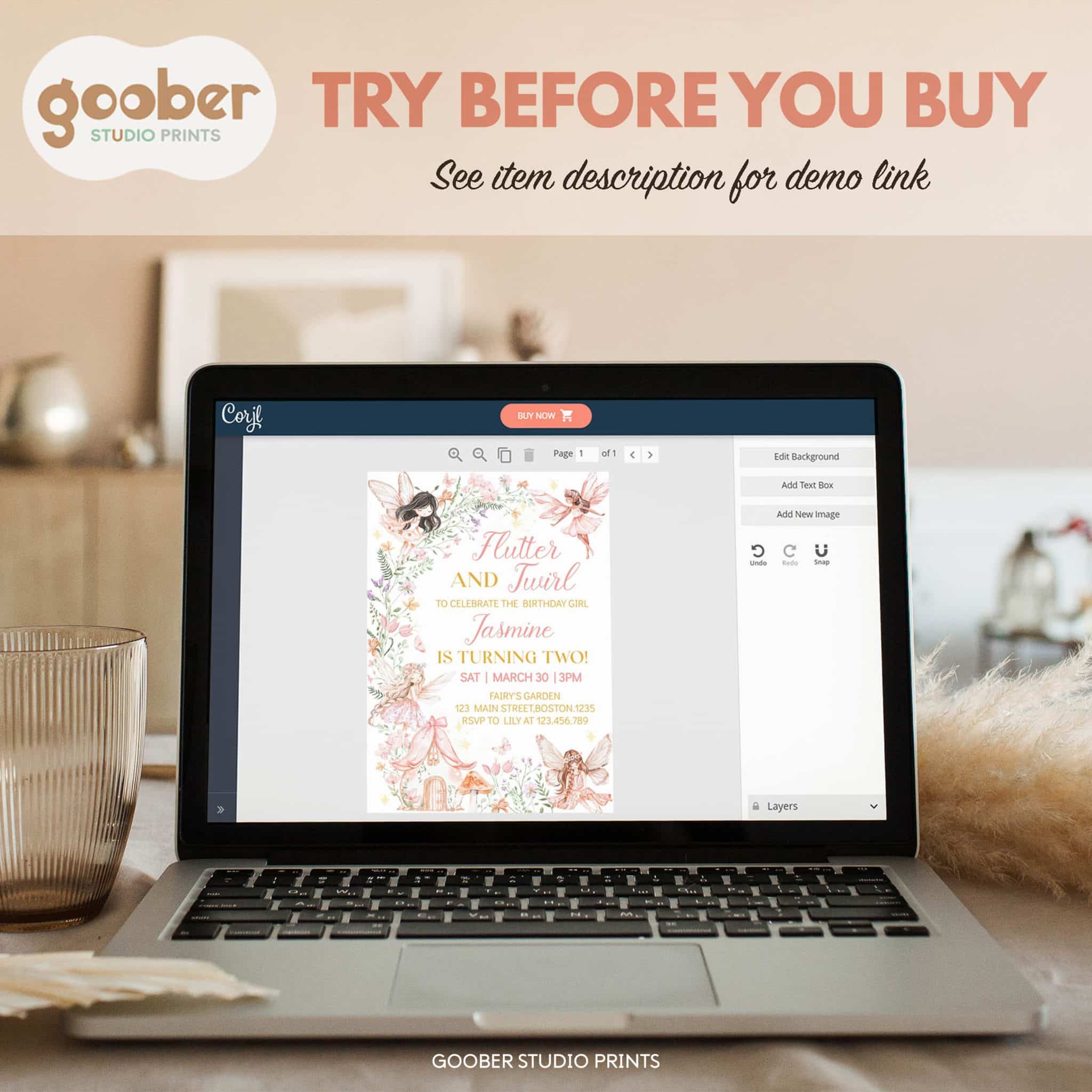 An access link to your editable fairy birthday invite design will be sent to your e-mail address. The link allows you to edit, save and download your design as JPG or PDF file. The printable birthday invitation is made for printing at 5×7 inches. We’re happy to answer any questions through our contact page.