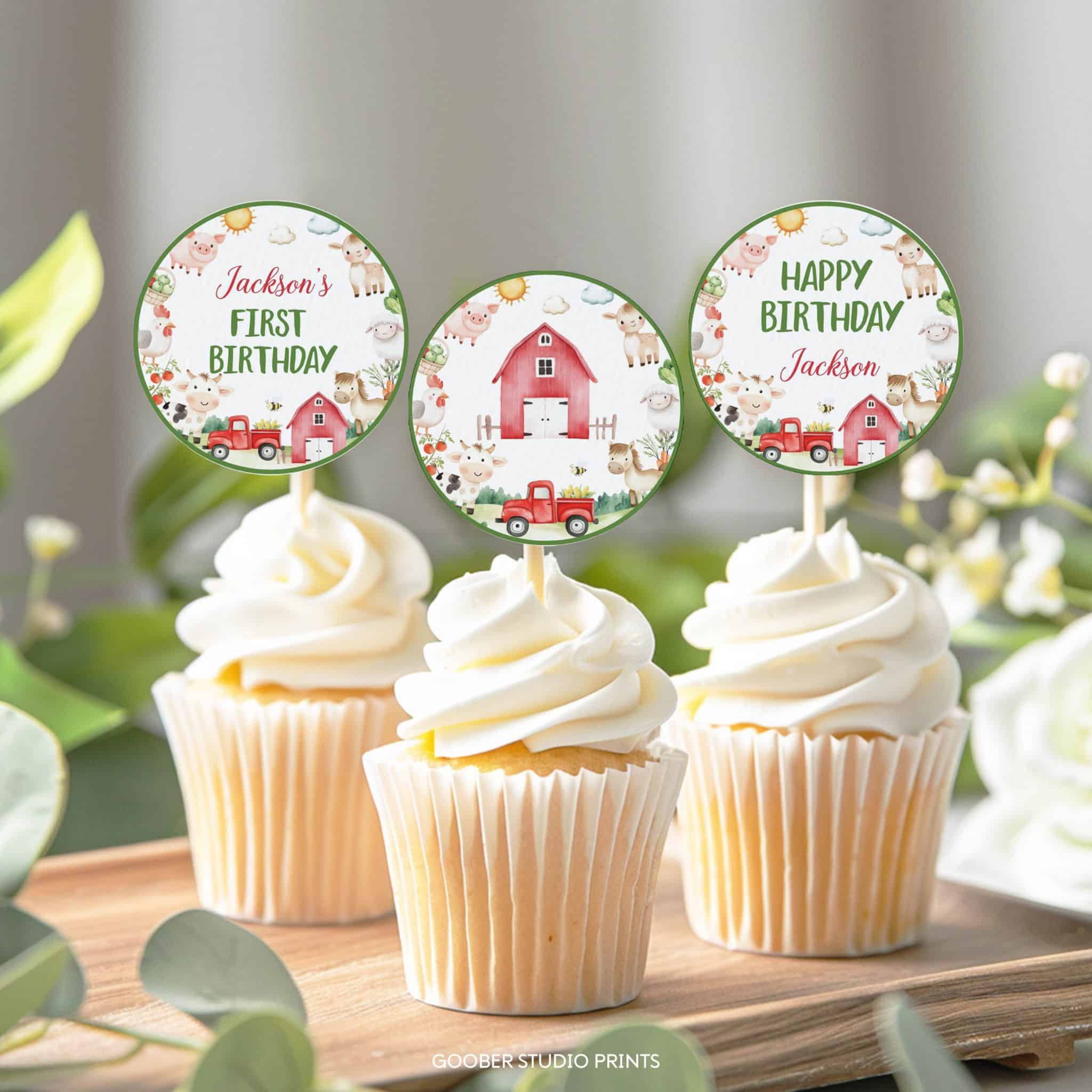 Add a fun farmyard touch to your treats with our farm animals cupcake toppers! Featuring cute barnyard animals and classic red barn accents, they’re perfect for a petting zoo party, barnyard bash, or boy birthday party. Personalize with your child’s name and age, print at home, and use on cupcakes or cake pops to match your farm-themed birthday party decorations with playful charm!