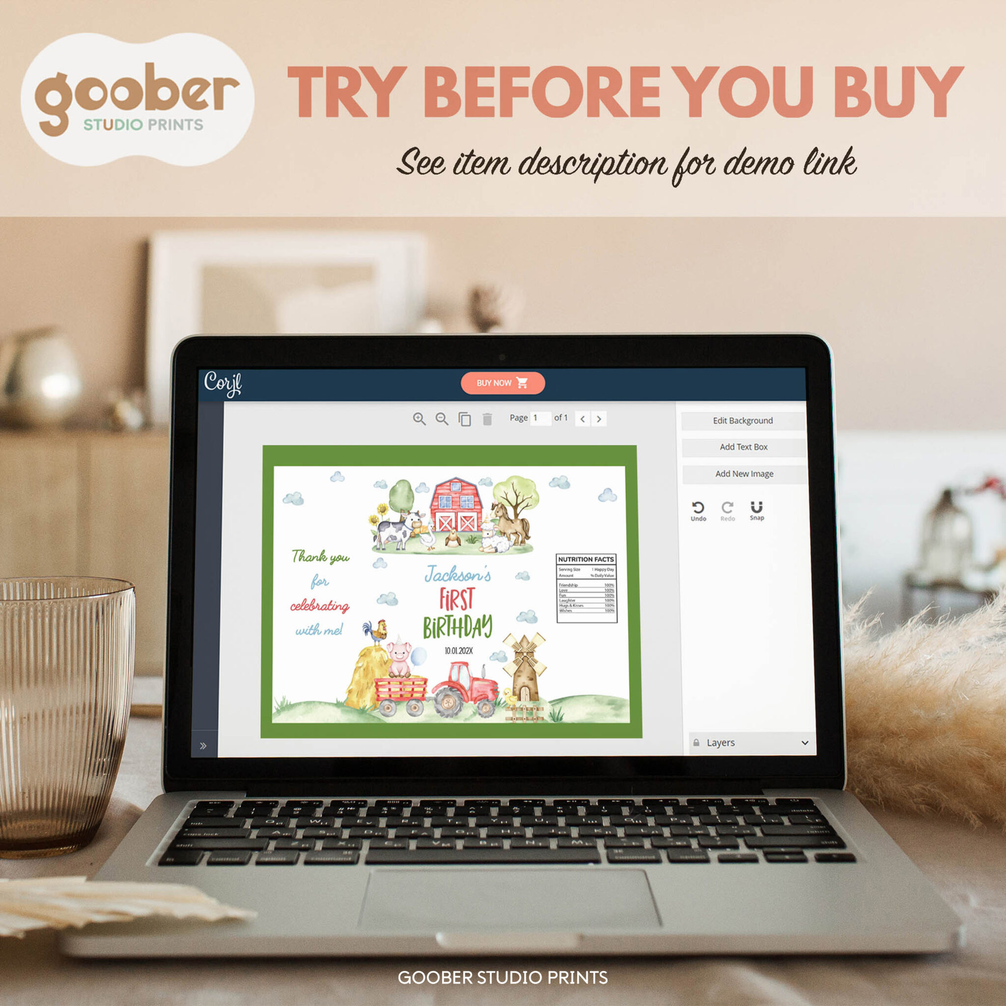 - After you place an order you will receive an email from Corjl to access your editable farm birthday party template. Please remember to provide your email at checkout.