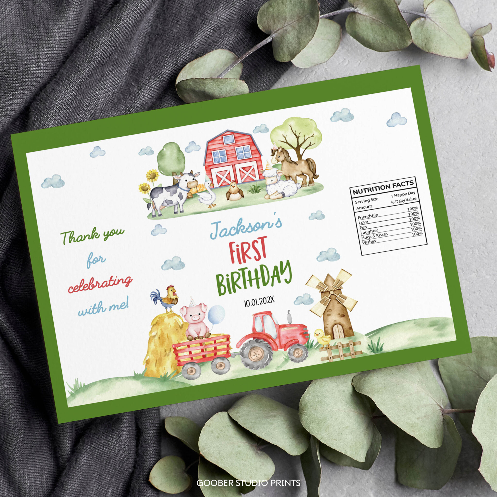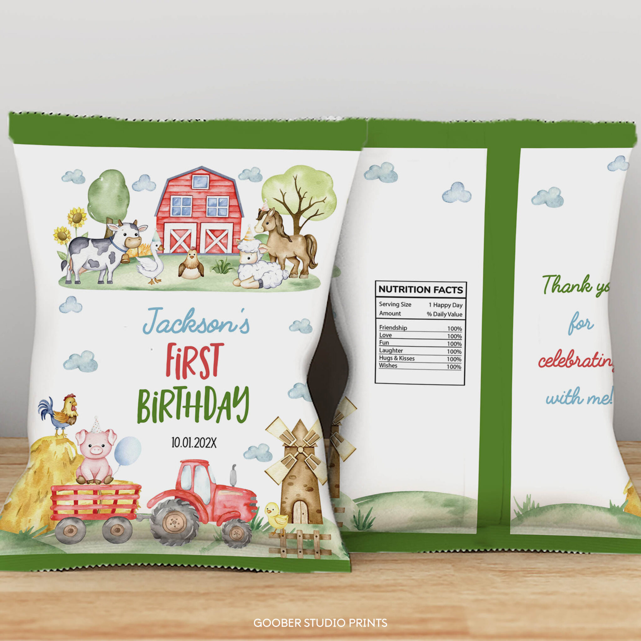 An access link to your editable farm birthday chip bag designs will be sent to your e-mail address. The link allows you to edit, save and download your design as JPG or PDF file. The design is made for printing at 11×8.5″. We’re happy to answer any questions through our contact page.
