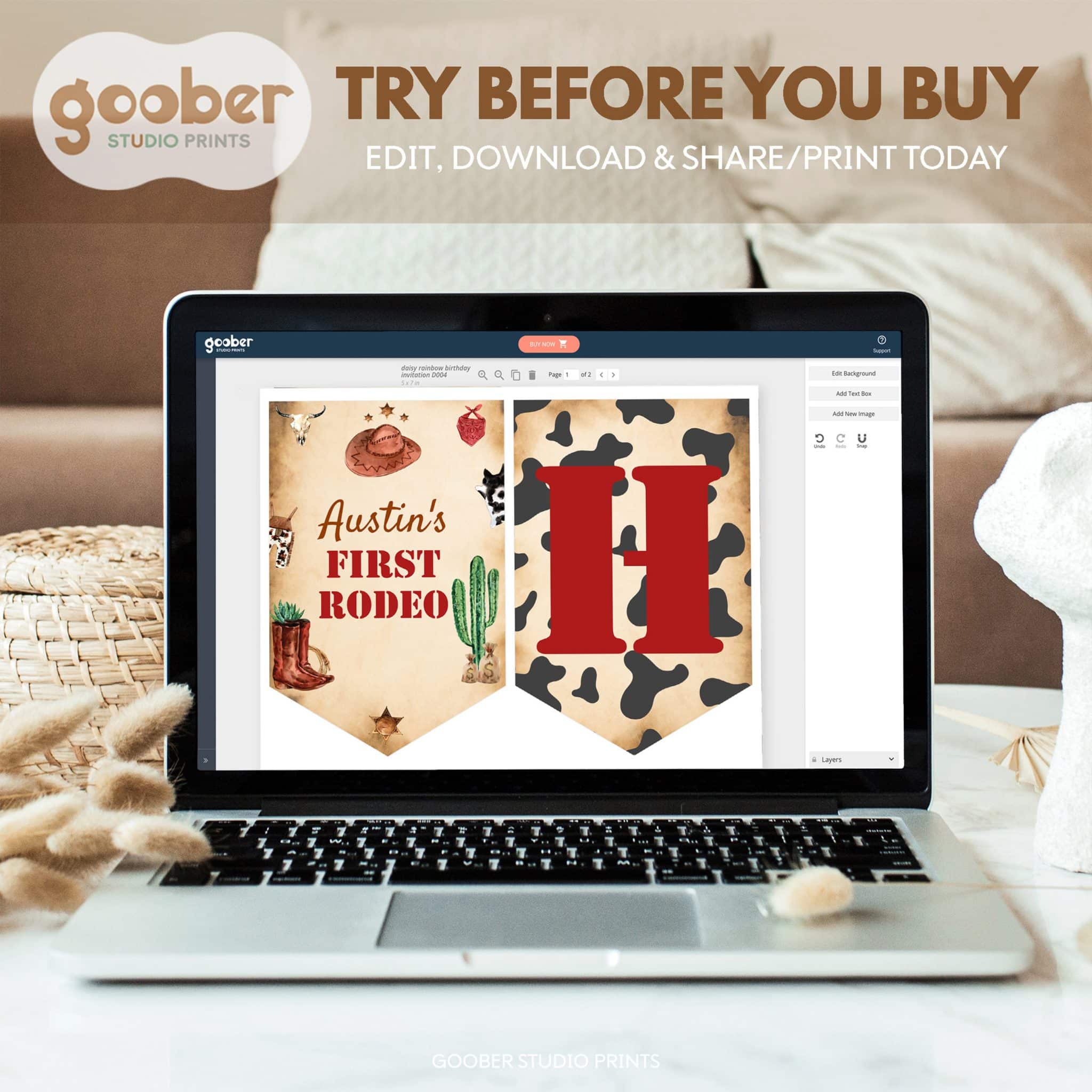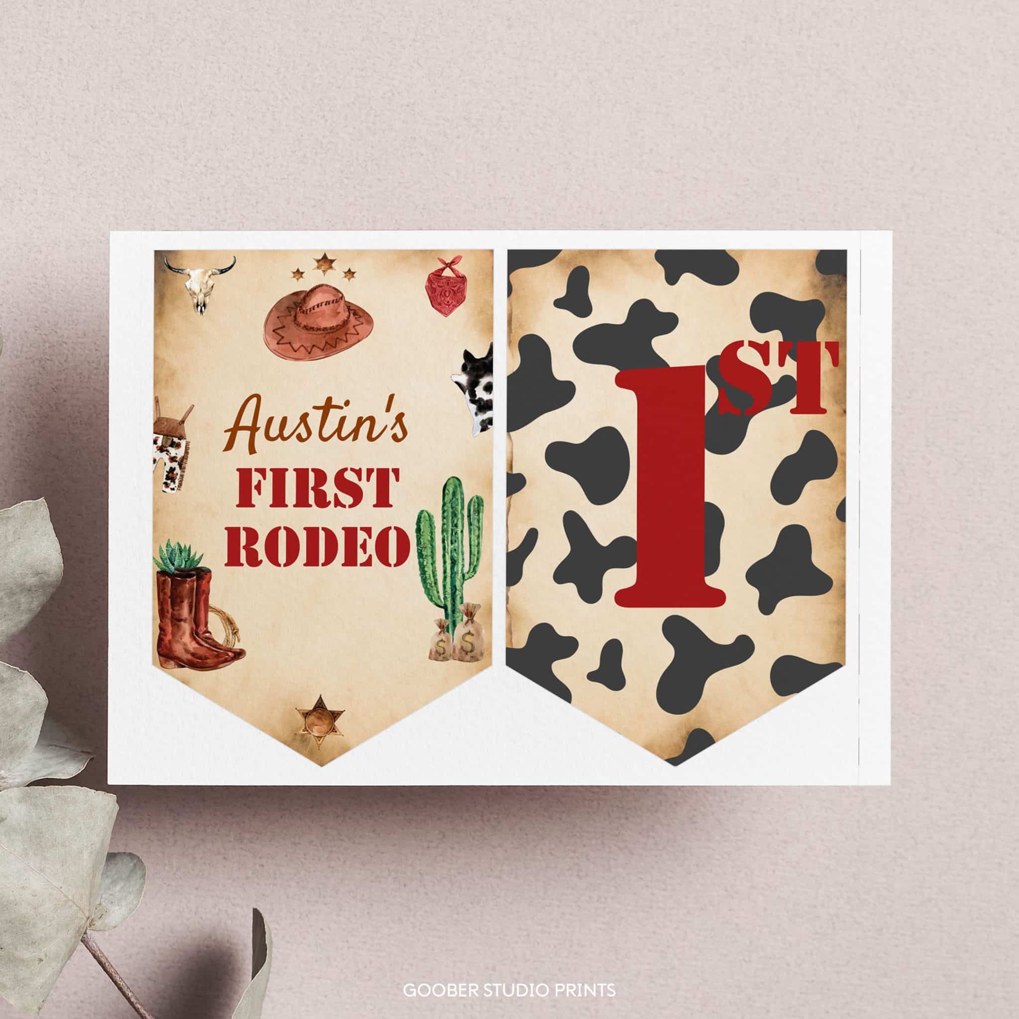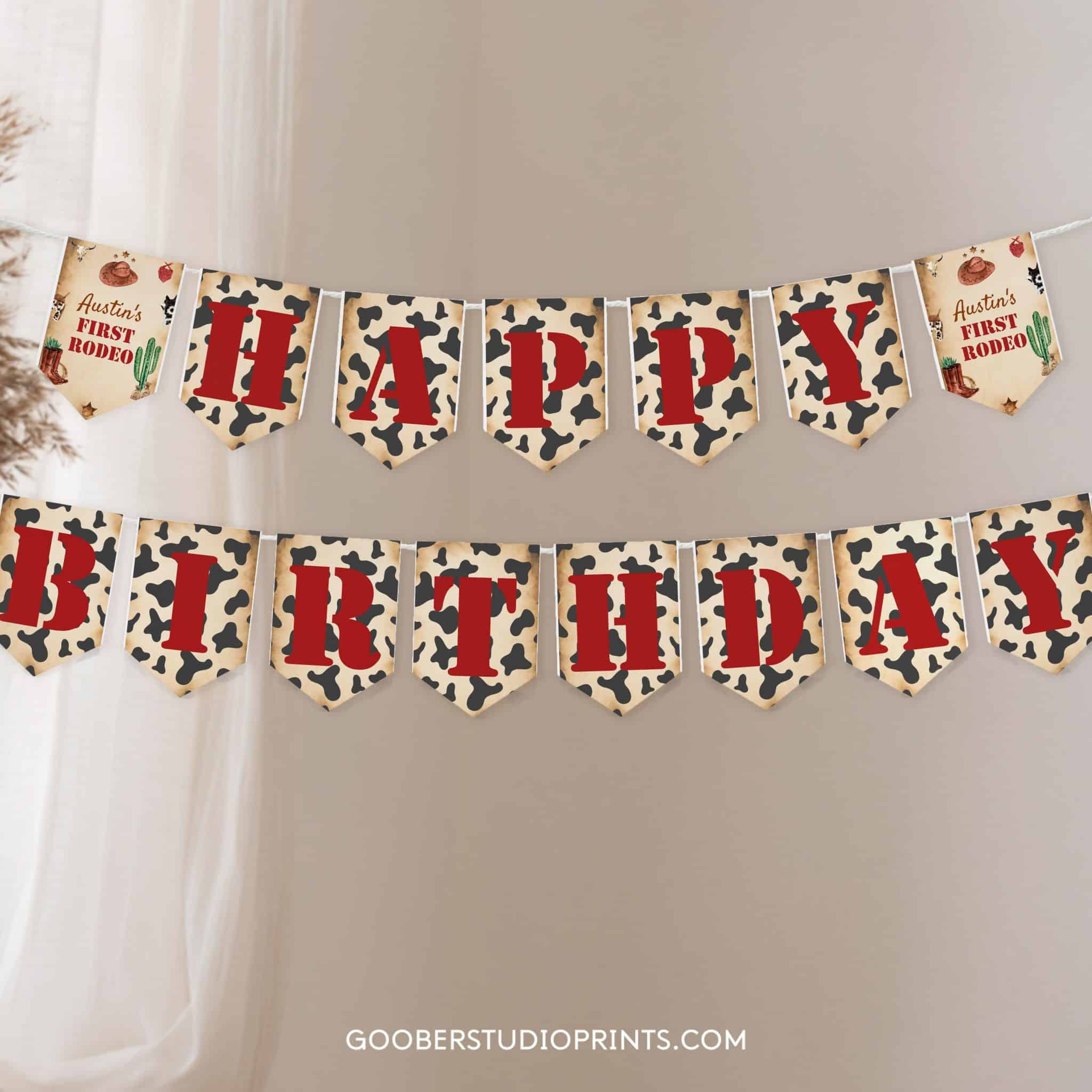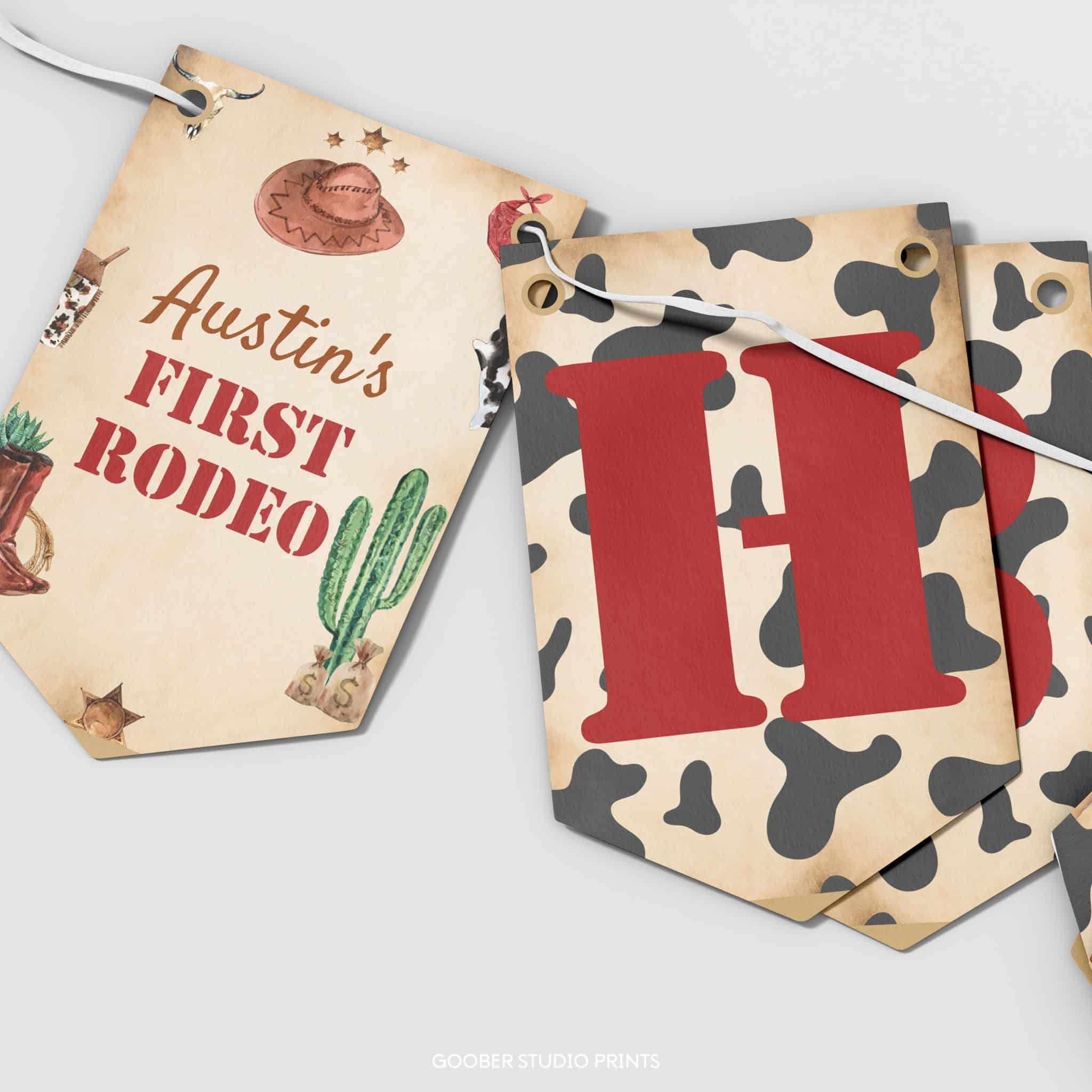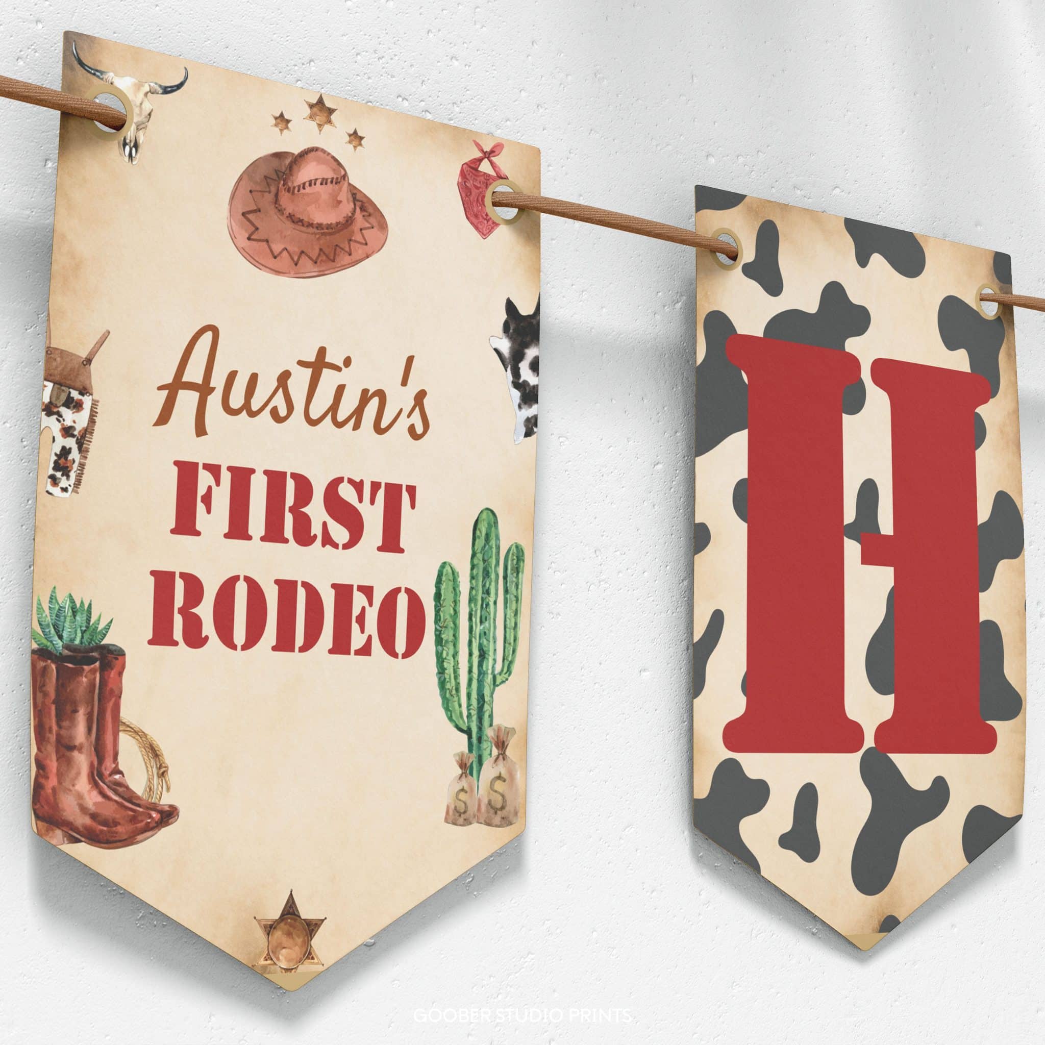 Saddle up for an unforgettable celebration with our first rodeo birthday banner! Featuring a charming cowboy design and bold, rustic lettering, this banner spells out “Happy Birthday” in a playful western theme. Perfect for a first rodeo or cowboy birthday party, it can be personalized with the birthday boy’s name and age. Print it at home on standard paper to add the perfect touch to your western theme party supplies!