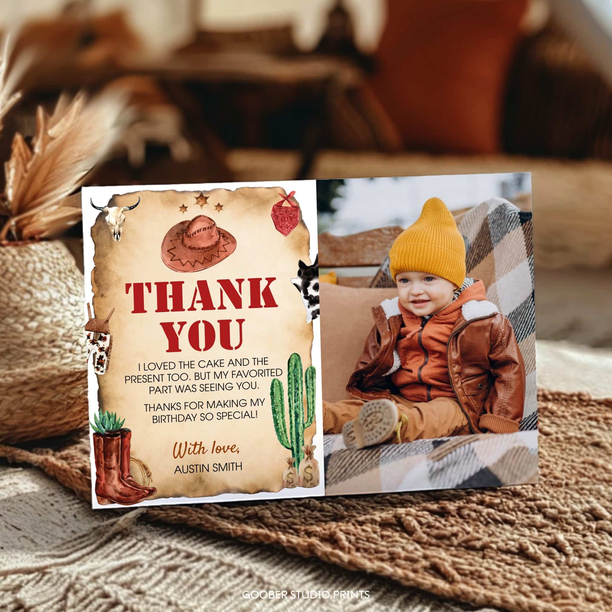 Show your appreciation with our first rodeo cowboy-themed birthday thank you cards! Featuring playful cowboy motifs and rustic western accents, these cards include space for a personalized message to thank your guests. Easy to print at home on standard cardstock, they’re the perfect way to express gratitude for joining your little cowboy’s first rodeo celebration and for making his special day unforgettable with matching western theme party supplies!