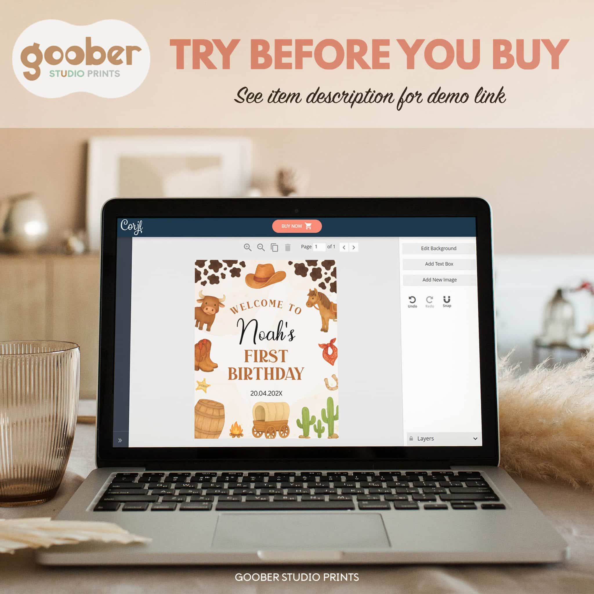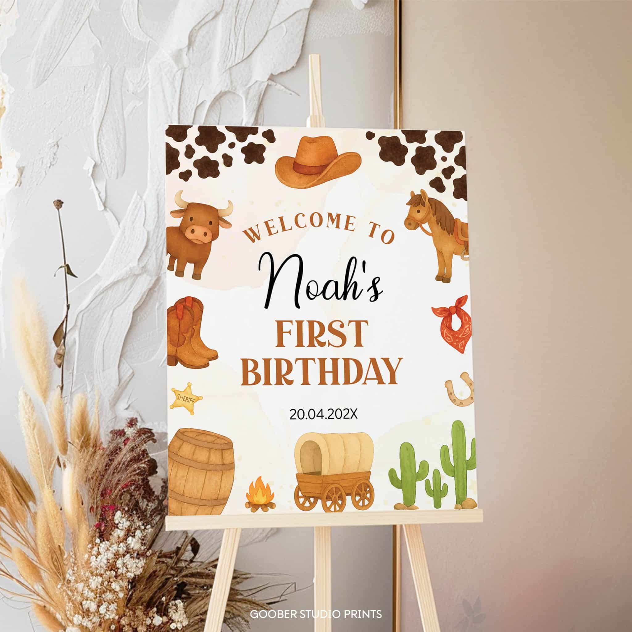 Welcome guests to your little cowboy’s first rodeo with our rustic cowboy-themed welcome sign! Featuring playful western motifs and rugged details, this sign can be personalized with your child’s name and age. It’s the perfect way to set the scene for a memorable first rodeo birthday, especially when paired with matching western theme party supplies.