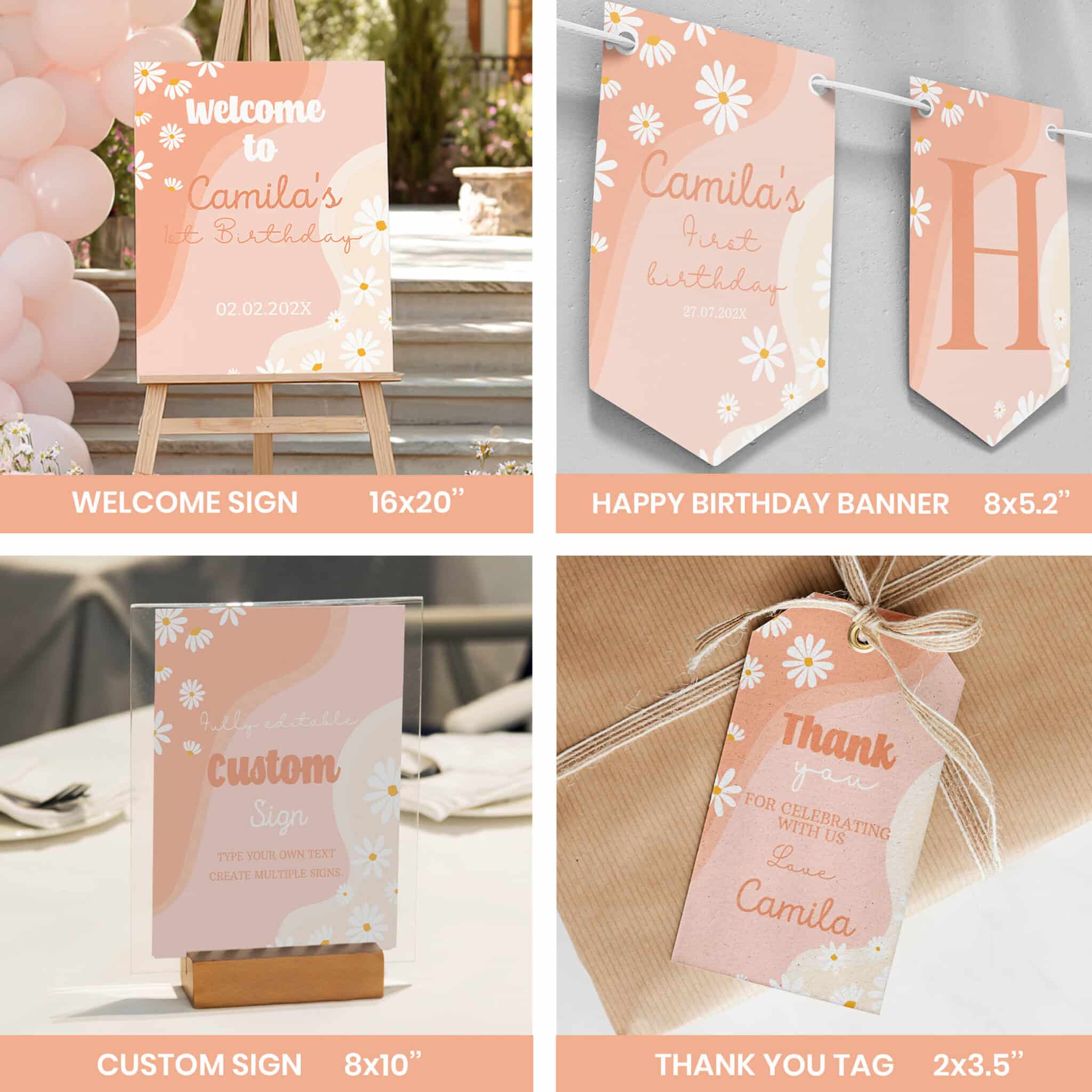 An access link to your editable groovy birthday bundle set will be sent to your e-mail address. The link allows you to edit, save and download your designs as JPG or PDF files. All the included designs and their sizes are: