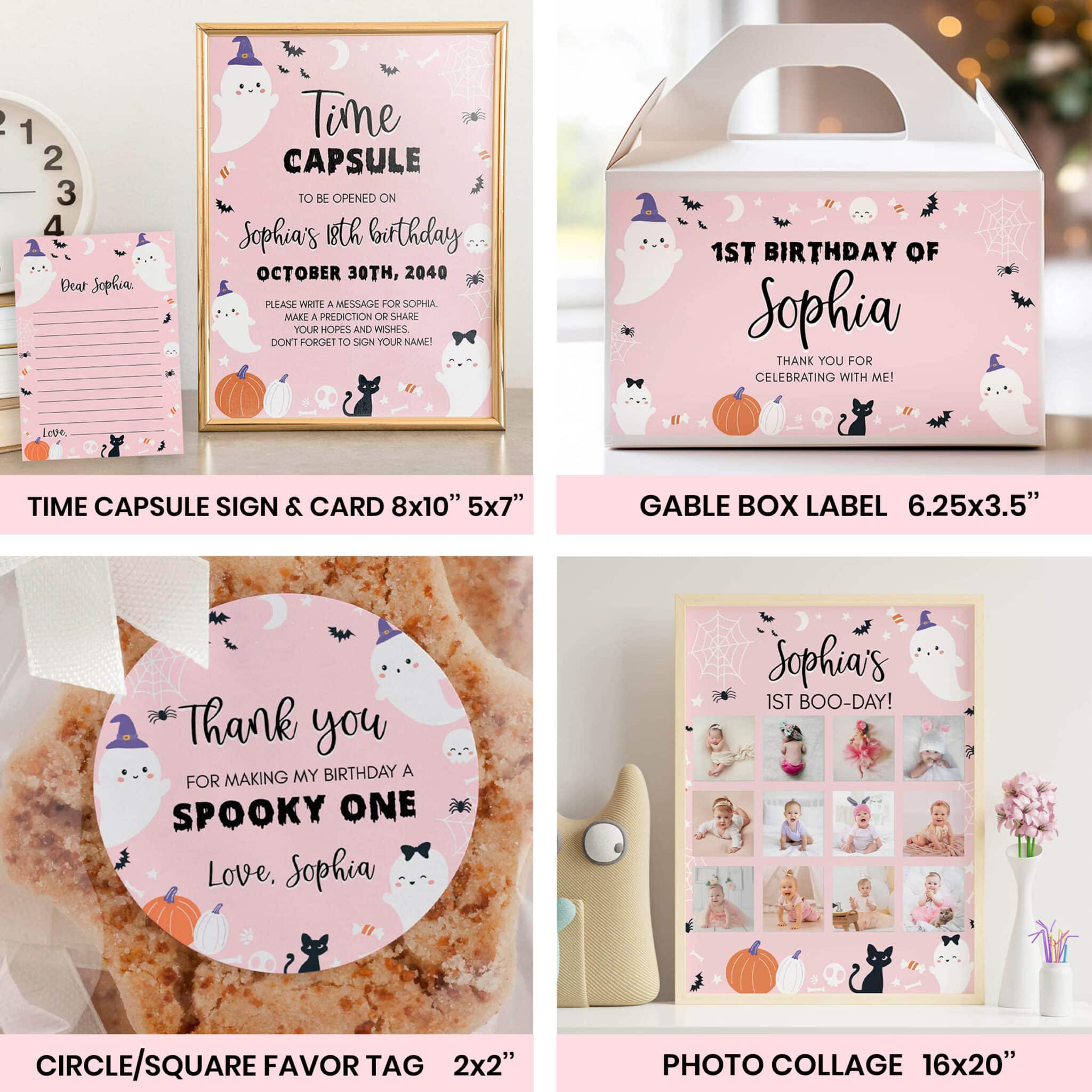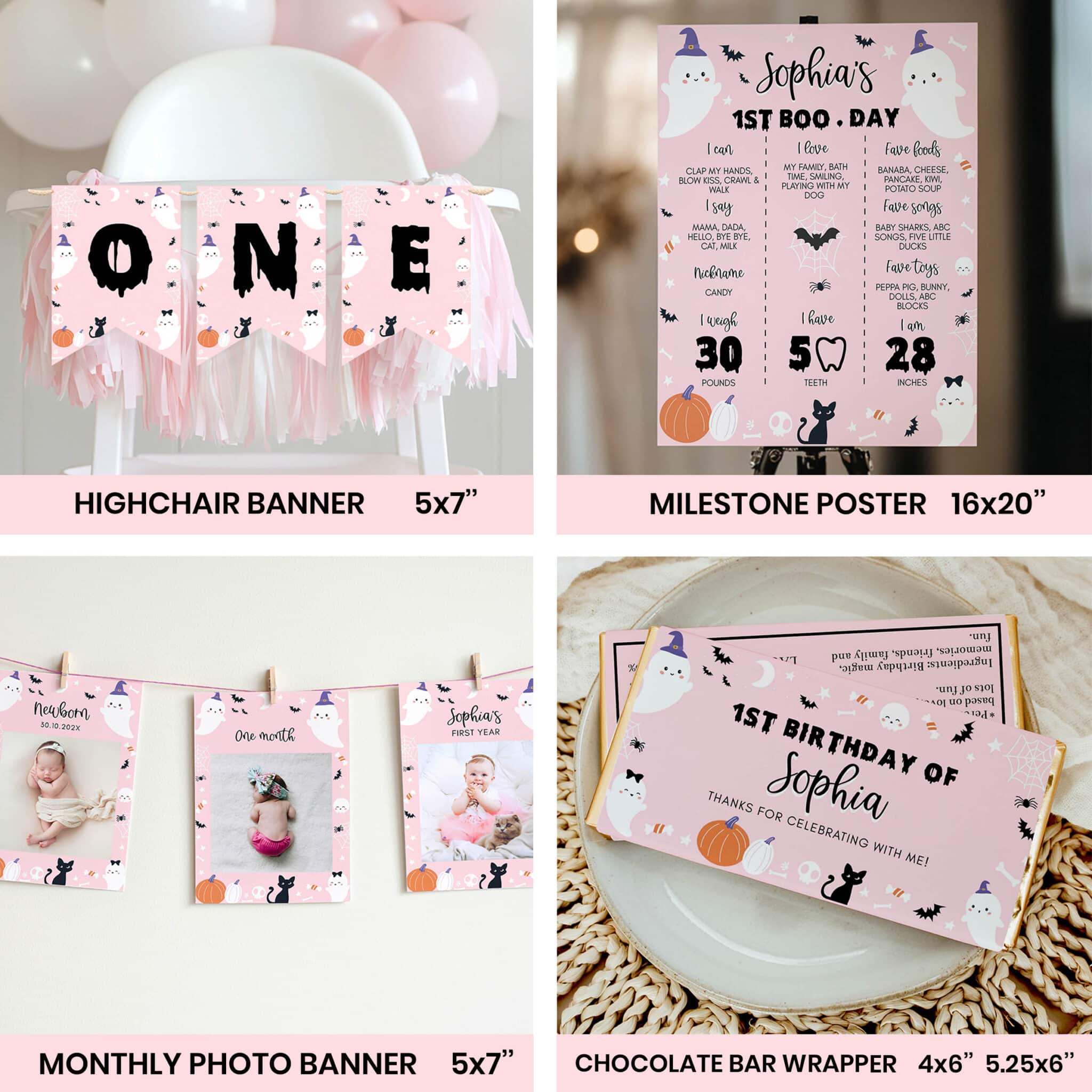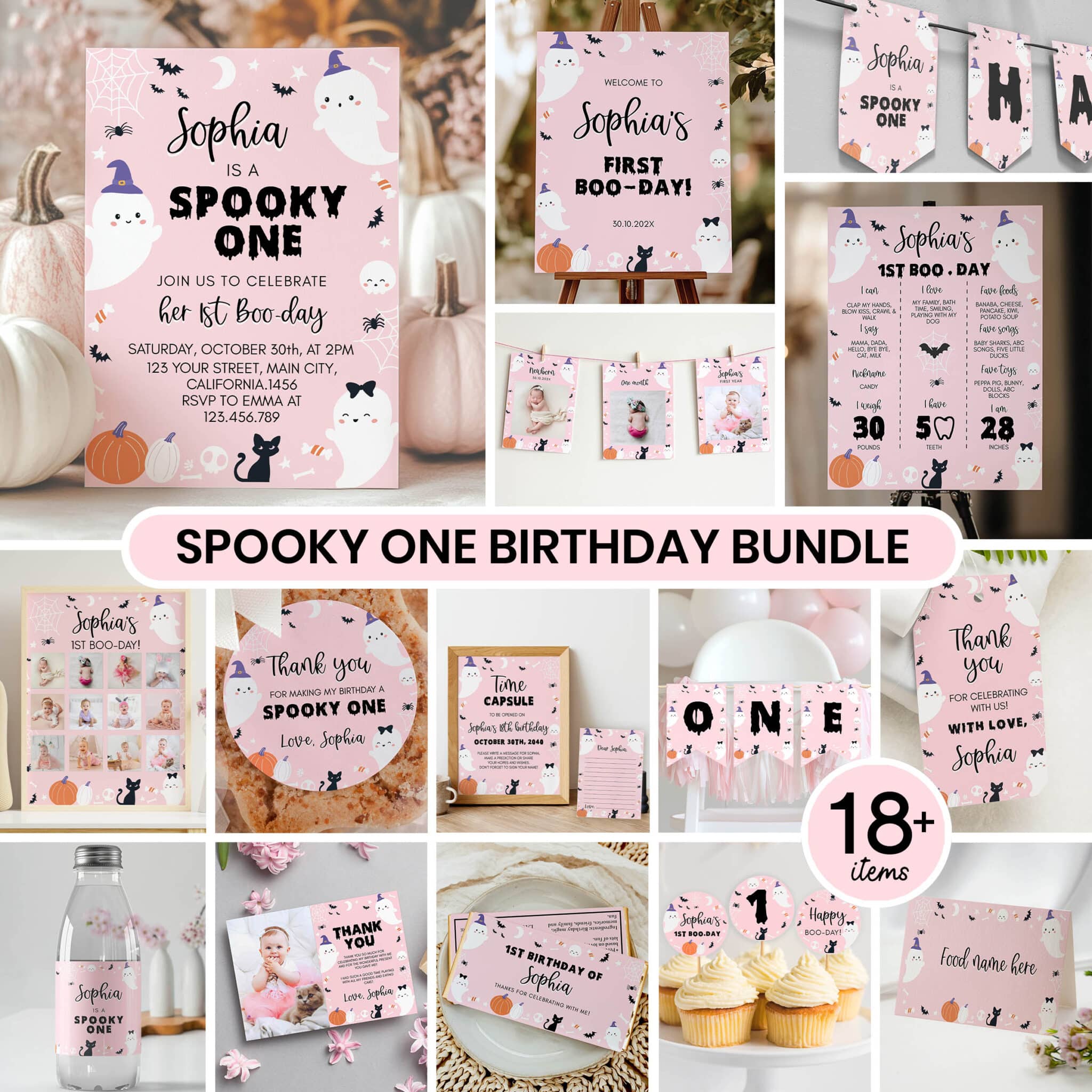 Celebrate in style with our spooky one halloween birthday party ghost bundle! Perfect for a girl birthday, this all-in-one set features adorable ghosts, pumpkins, and festive Halloween details. It includes invitations, banners, cupcake toppers, favor tags, and more—all customizable with your child’s name, age, and party details. A fun and easy way to bring your spooky one halloween birthday celebration together—see everything included below!