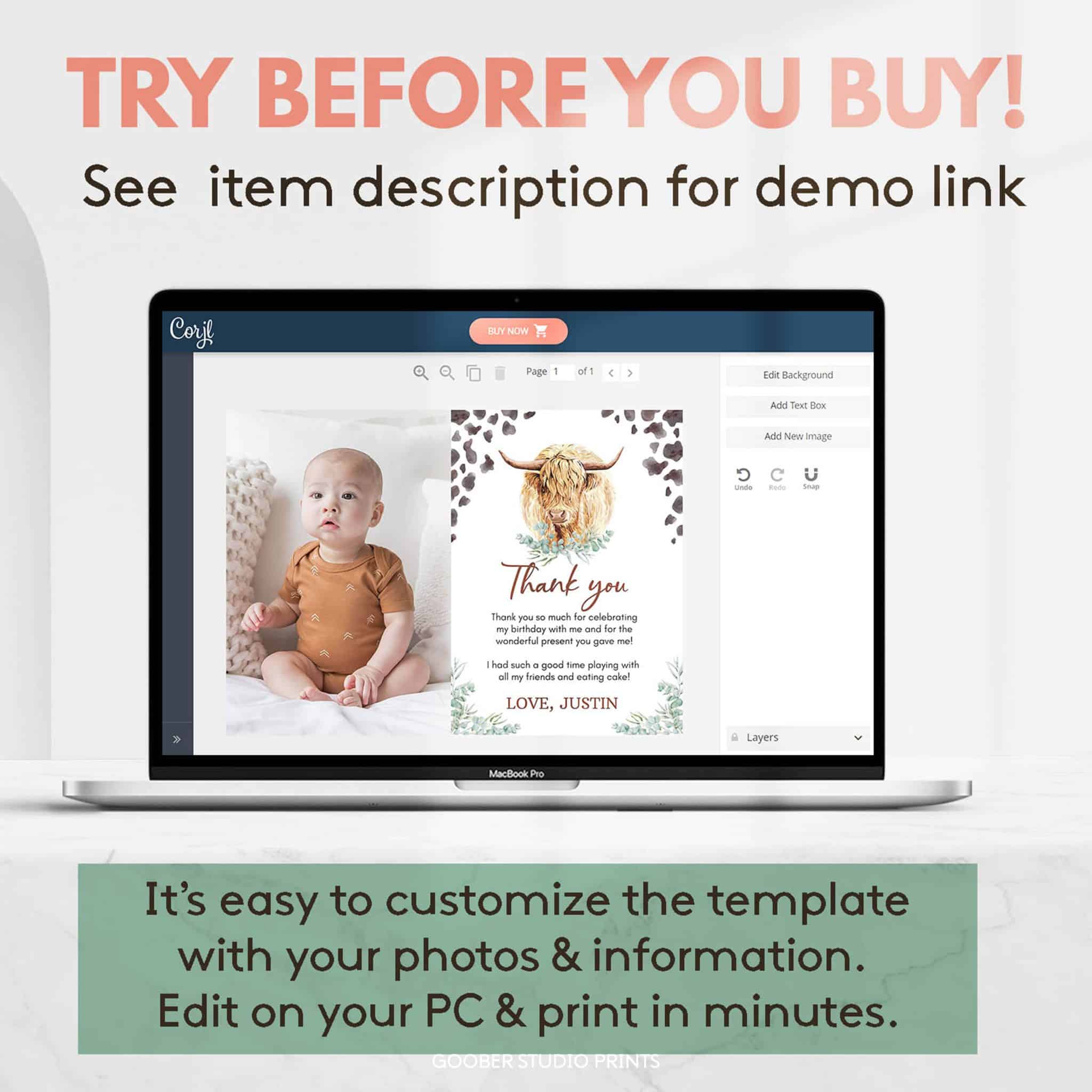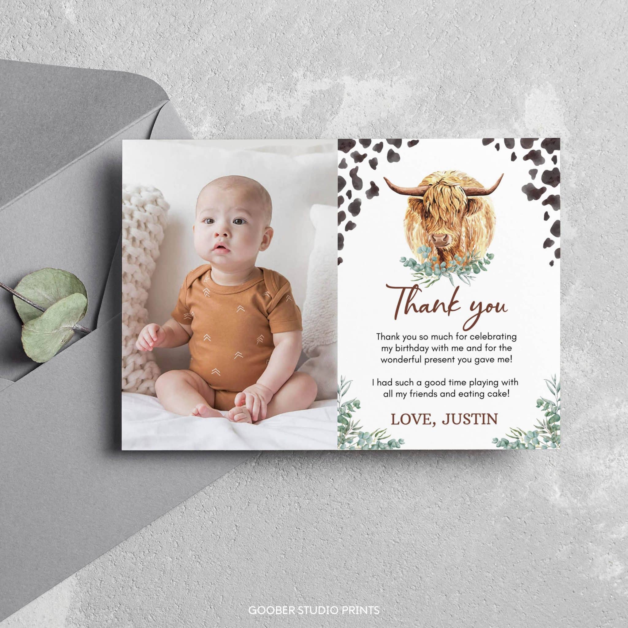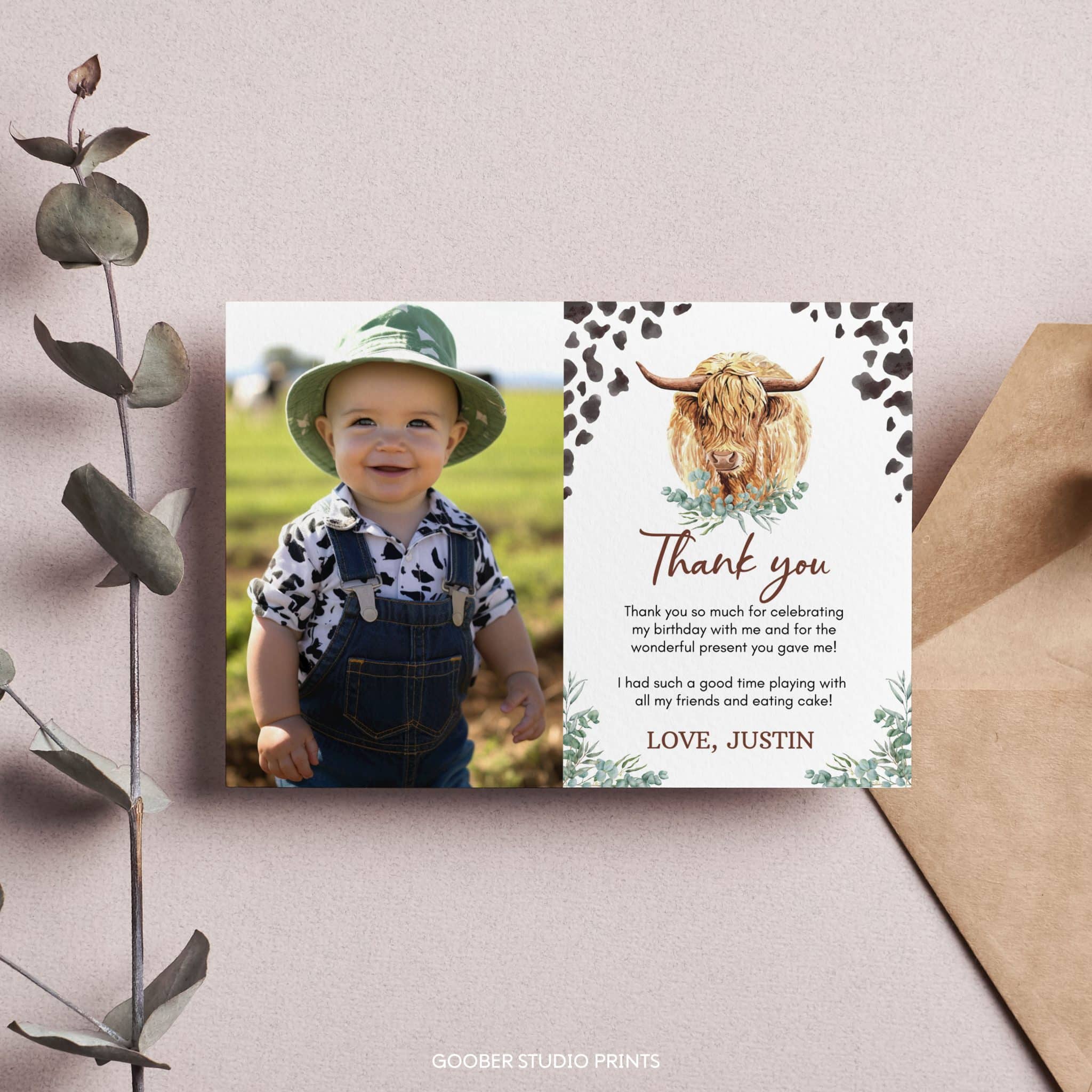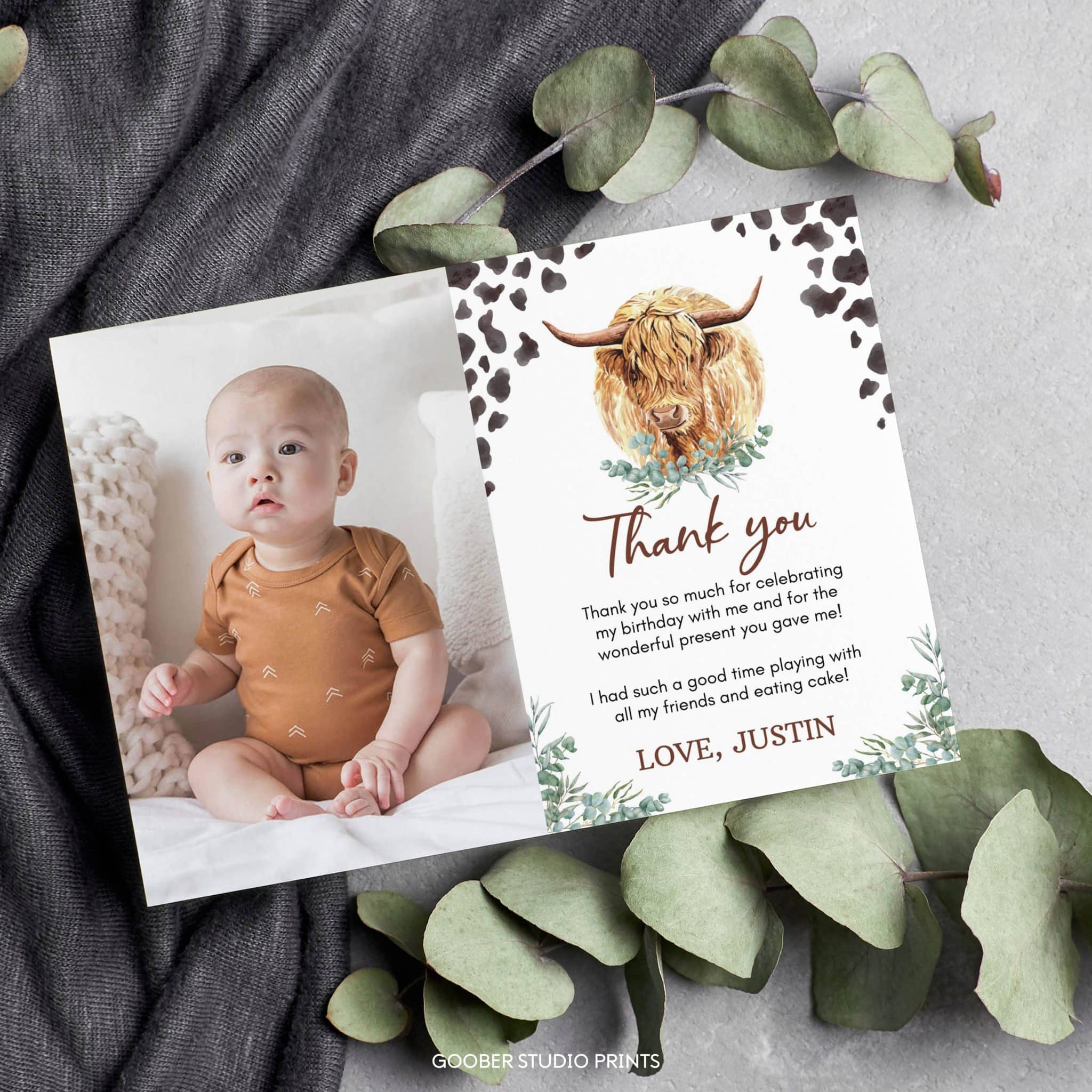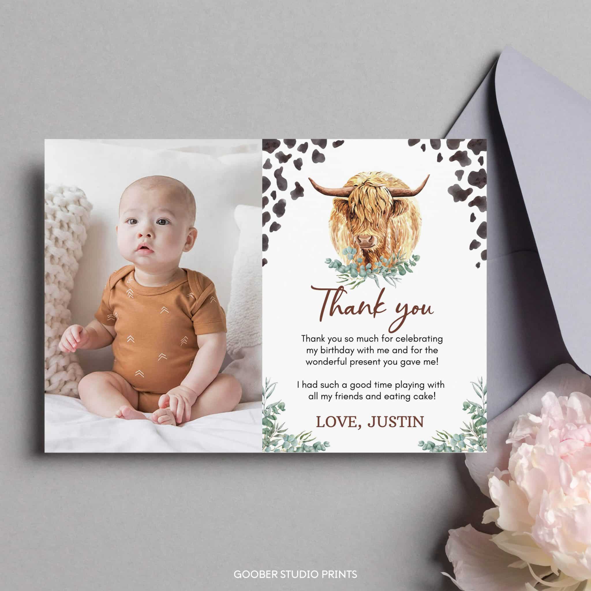 Show your appreciation with our highland cow-themed birthday thank you cards! Featuring adorable highland cow designs, lush greenery accents, and playful cow print details, these cards offer space for a personalized message or thank-you note. Easy to print at home on standard cardstock, they’re the perfect way to thank your guests for celebrating your little one’s ‘holy cow’ boy birthday and making his farm-themed party unforgettable with their love and thoughtful contributions!