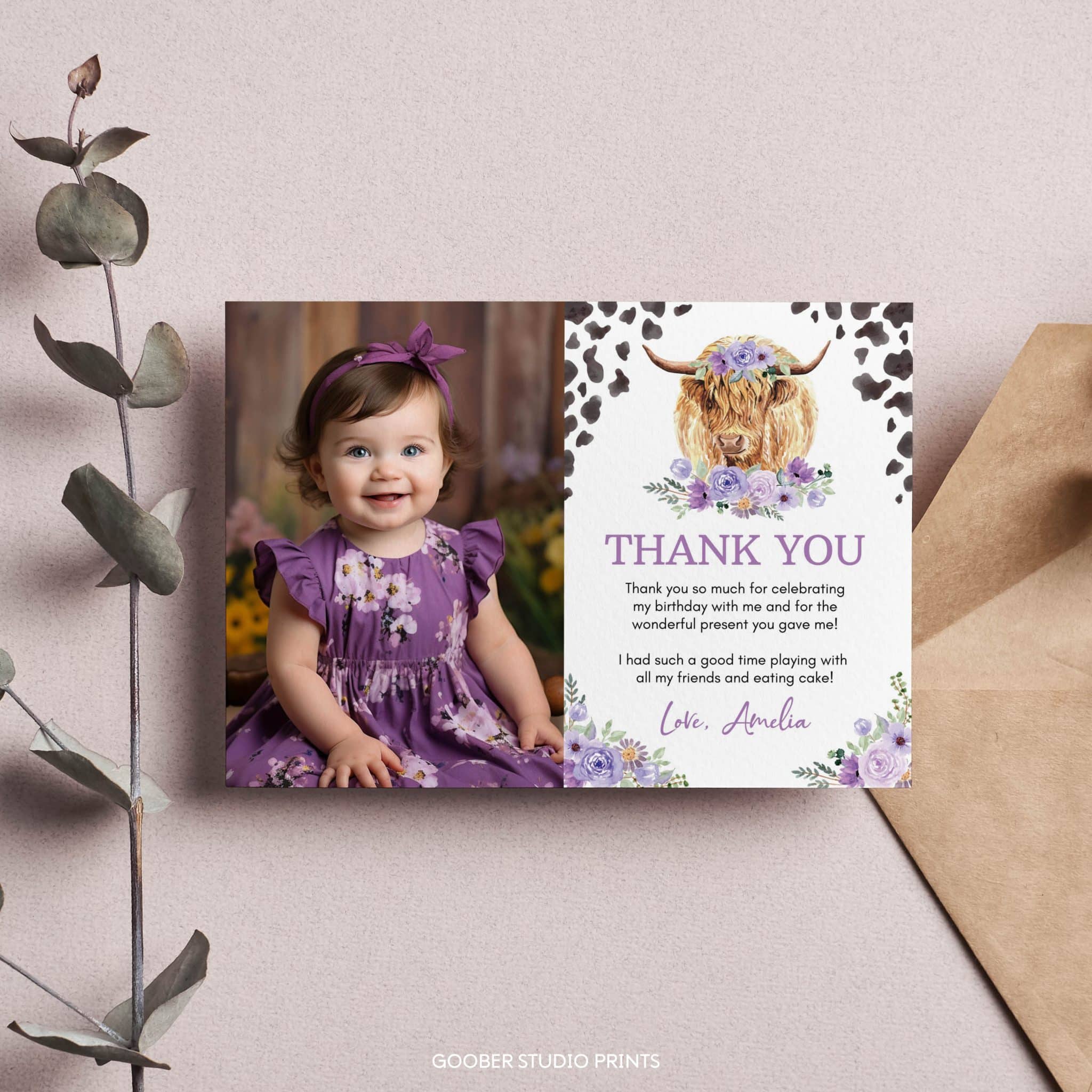 Show your appreciation with our highland cow-themed birthday thank you cards! Featuring adorable highland cow designs, purple floral accents, and playful cow print details, these cards offer space for a personalized message or thank-you note. Easy to print at home on standard cardstock, they’re the perfect way to thank your guests for celebrating your little one’s ‘holy cow’ girl birthday and making her farm-themed party unforgettable with their love and thoughtful contributions!