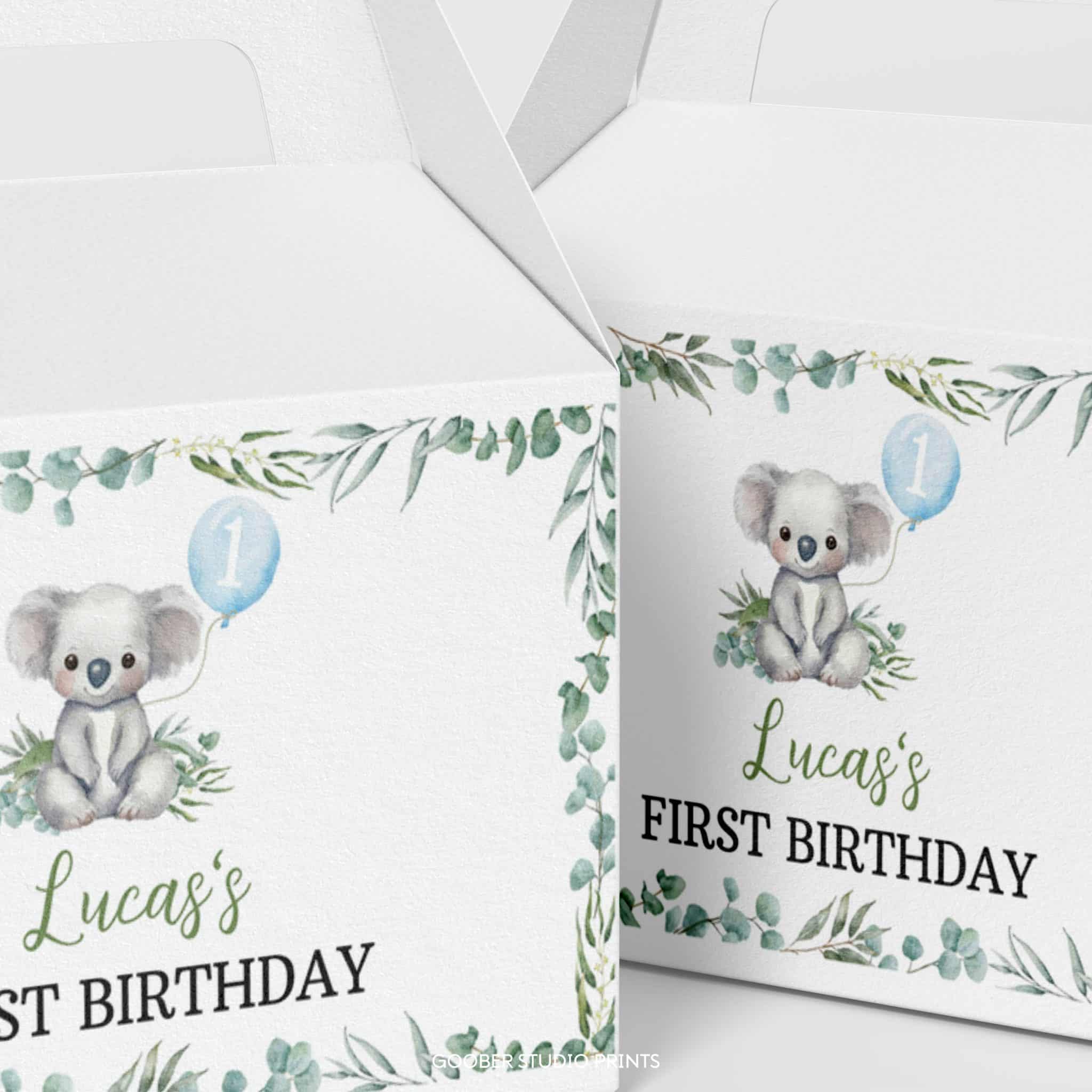 Add a charming touch to your party favors with our happy birthday koala bear gable box labels! Featuring an adorable watercolor koala and soft greenery accents, these labels can be personalized with the birthday boy’s name and age. Easily printable at home on standard paper, they attach effortlessly to gable boxes, transforming them into unique and personalized koala themed birthday treats for your baby boy’s special celebration, perfectly complementing your koala birthday decorations.