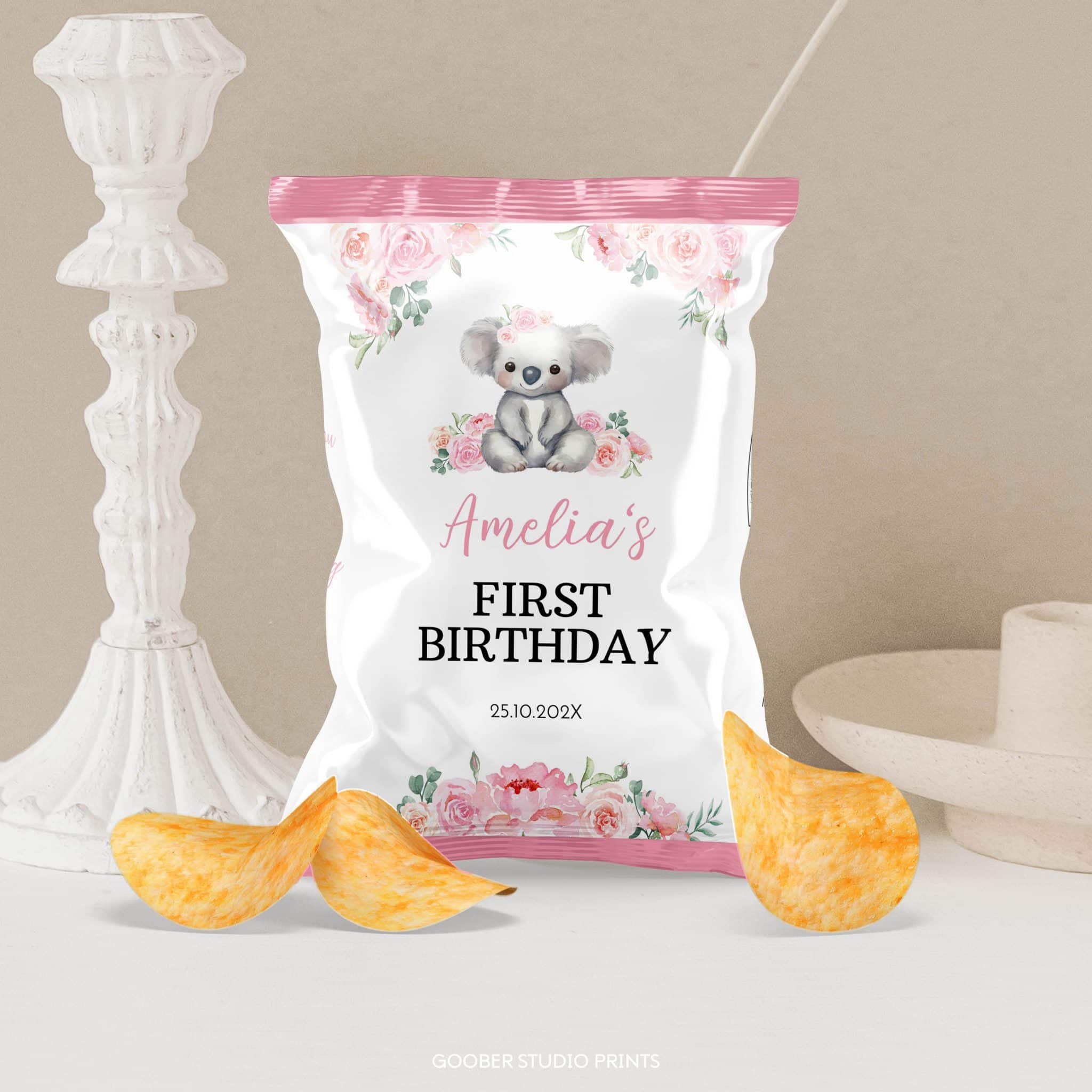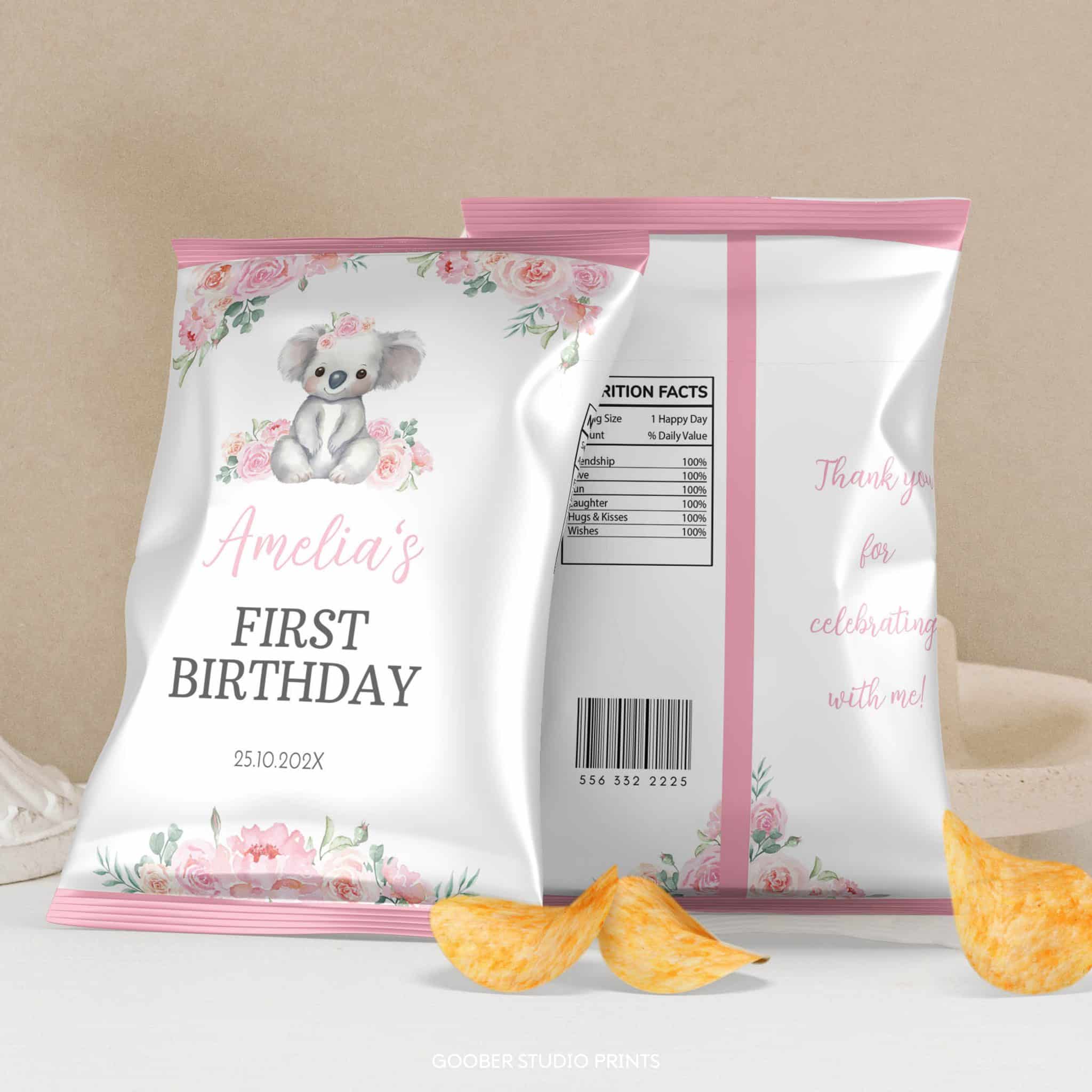 Make your girl’s birthday extra special with our happy birthday koala bear printable chip bag! Featuring a sweet watercolor koala with soft greenery and pink floral accents, this design adds a charming touch to your koala themed birthday party. Personalize it with the birthday girl’s name and age, then print and assemble at home for a fun and festive party favor that perfectly complements your koala birthday decorations.