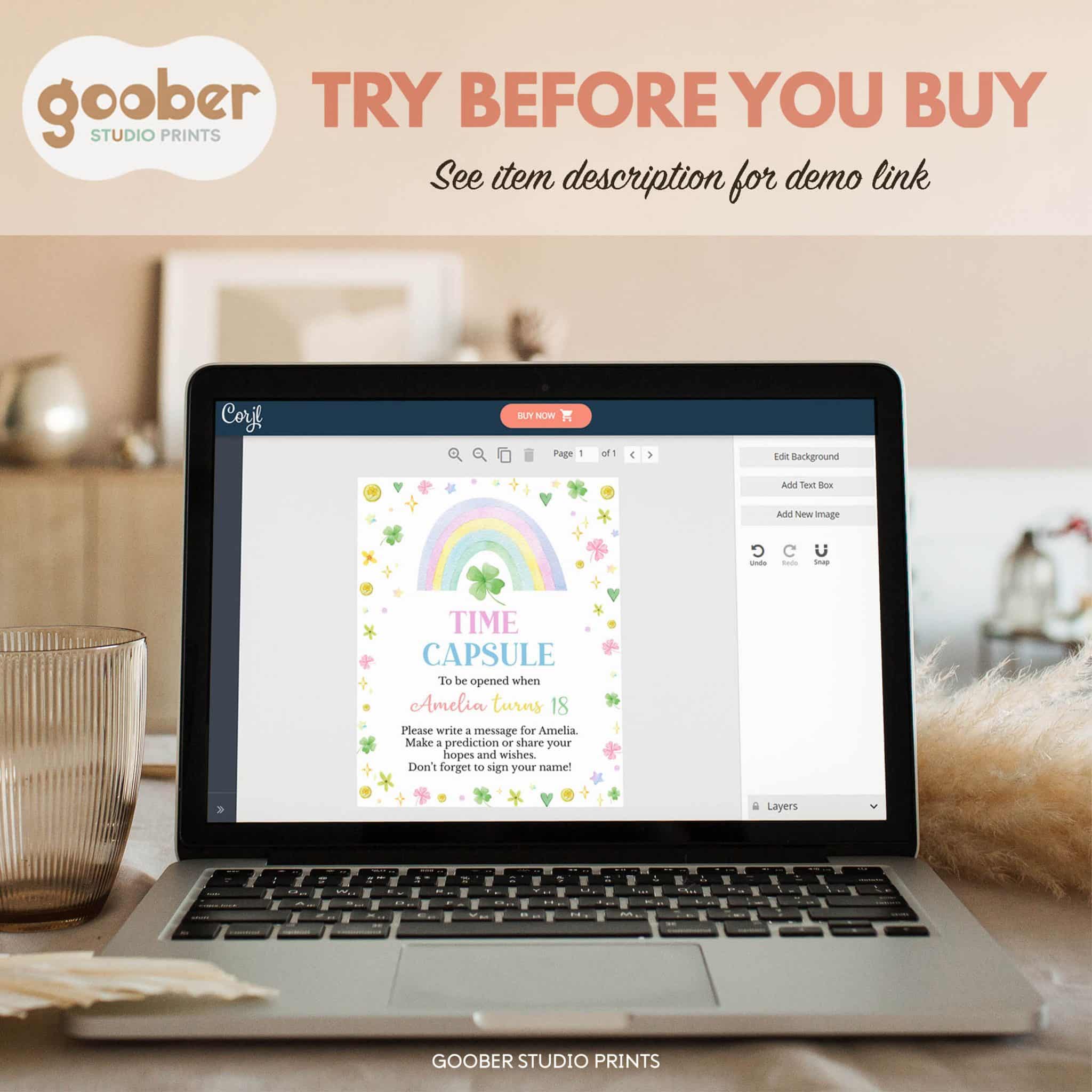 An access link to your editable lucky one birthday time capsule sign and card will be sent to your e-mail address. The link allows you to edit, save and download your design as JPG or PDF file. The time capsule sign is made for printing at 8×10 inches, and the card is 5×7 inches.  We’re happy to answer any questions through our contact page.