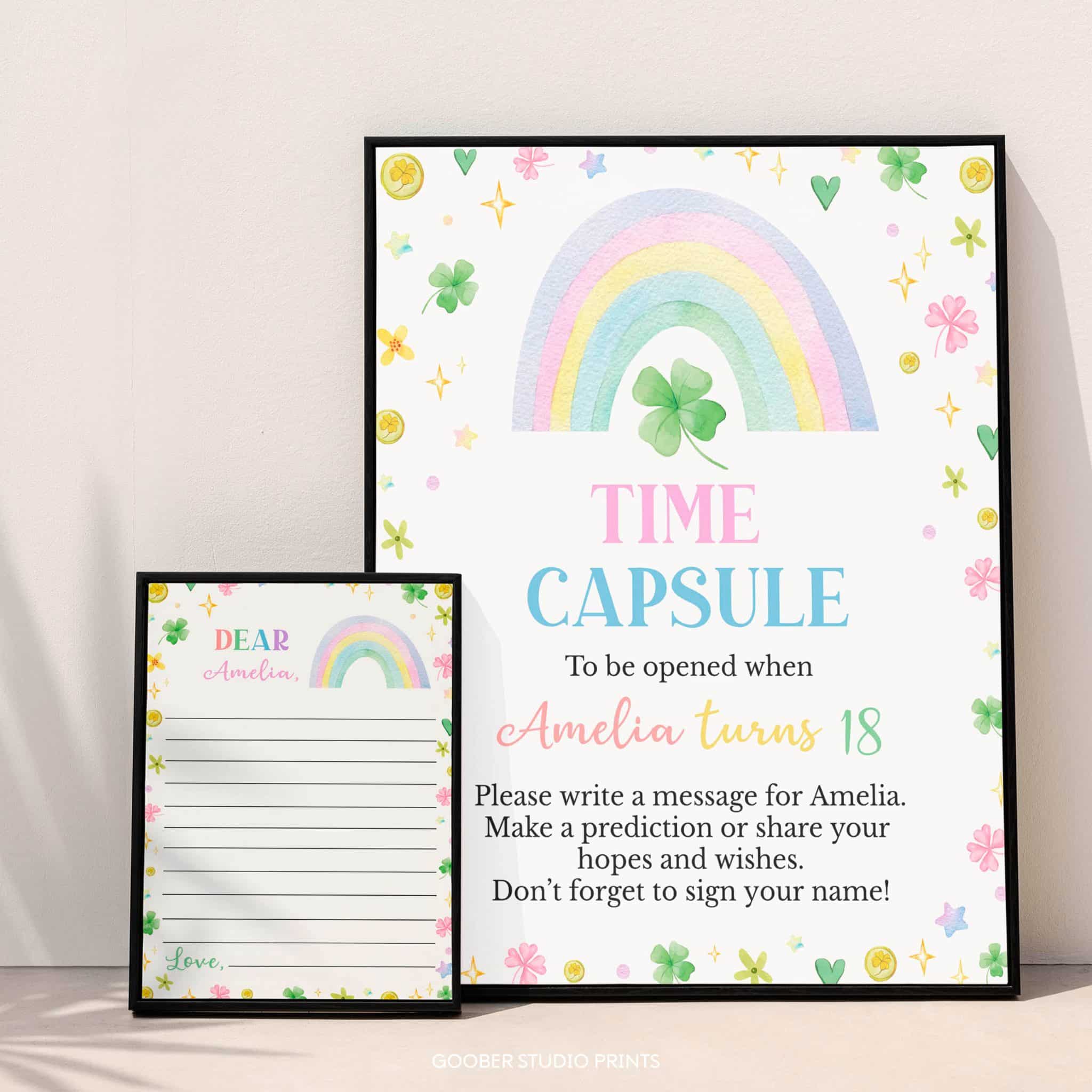 Create lasting memories with our lucky one-themed birthday time capsule set! This delightful set features playful rainbows, charming four-leaf clovers, and vibrant green accents, including a time capsule sign and matching cards for guests to share wishes, memories, and predictions for your little girl’s future. Perfect for displaying at a St. Patrick’s Day themed birthday party, the set can be sealed as a treasured keepsake to be opened on a special future date.
