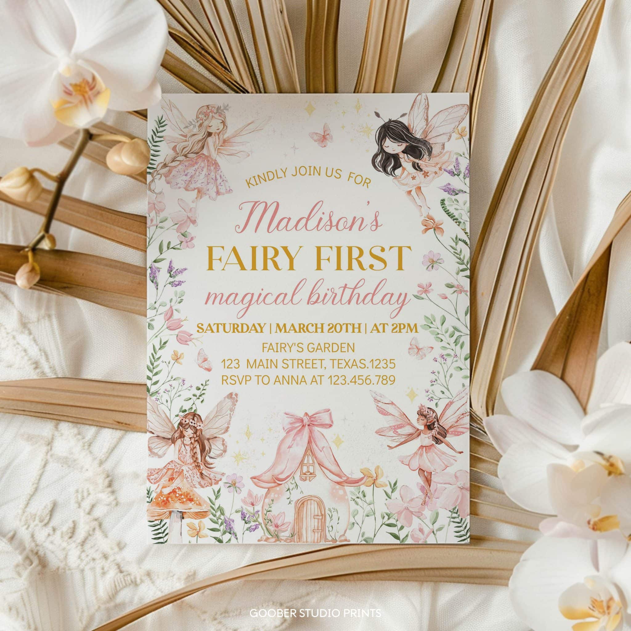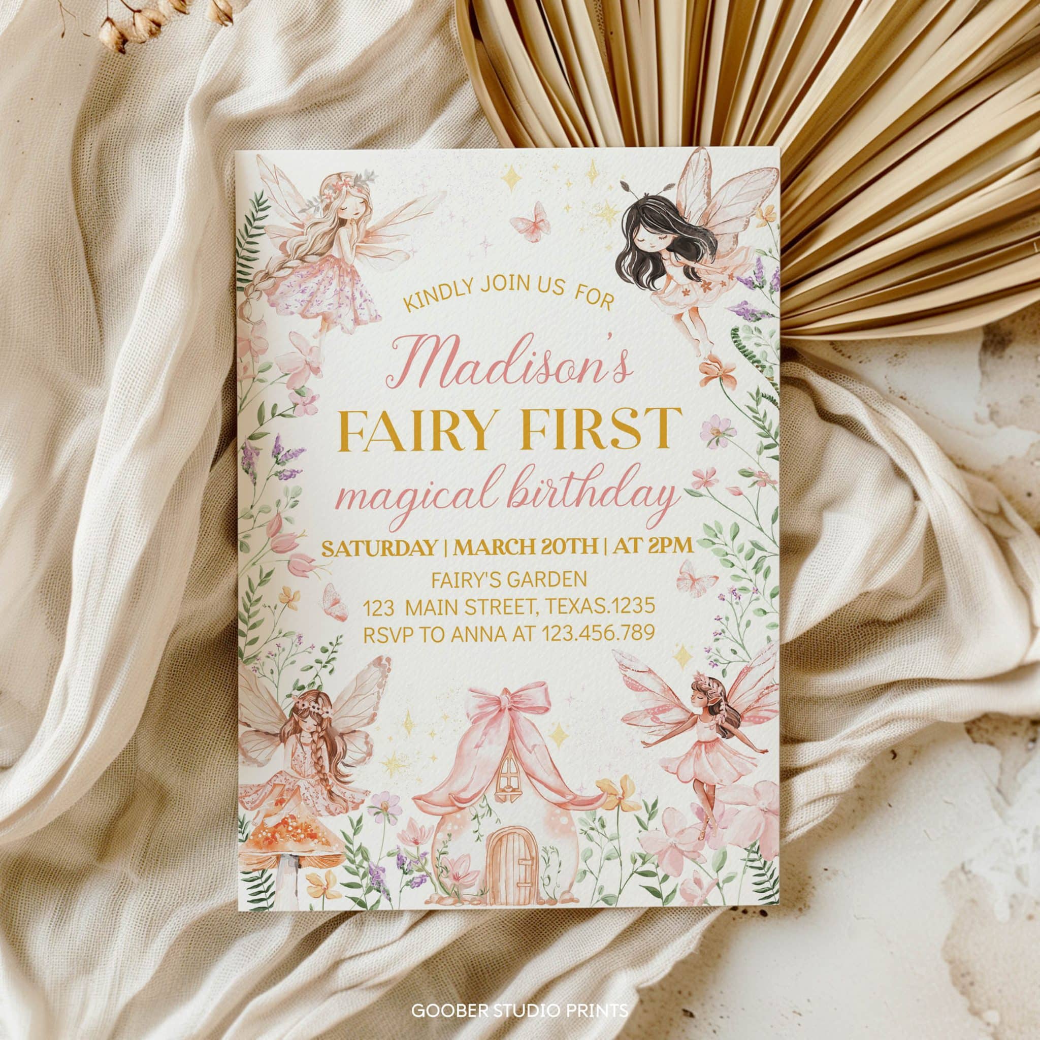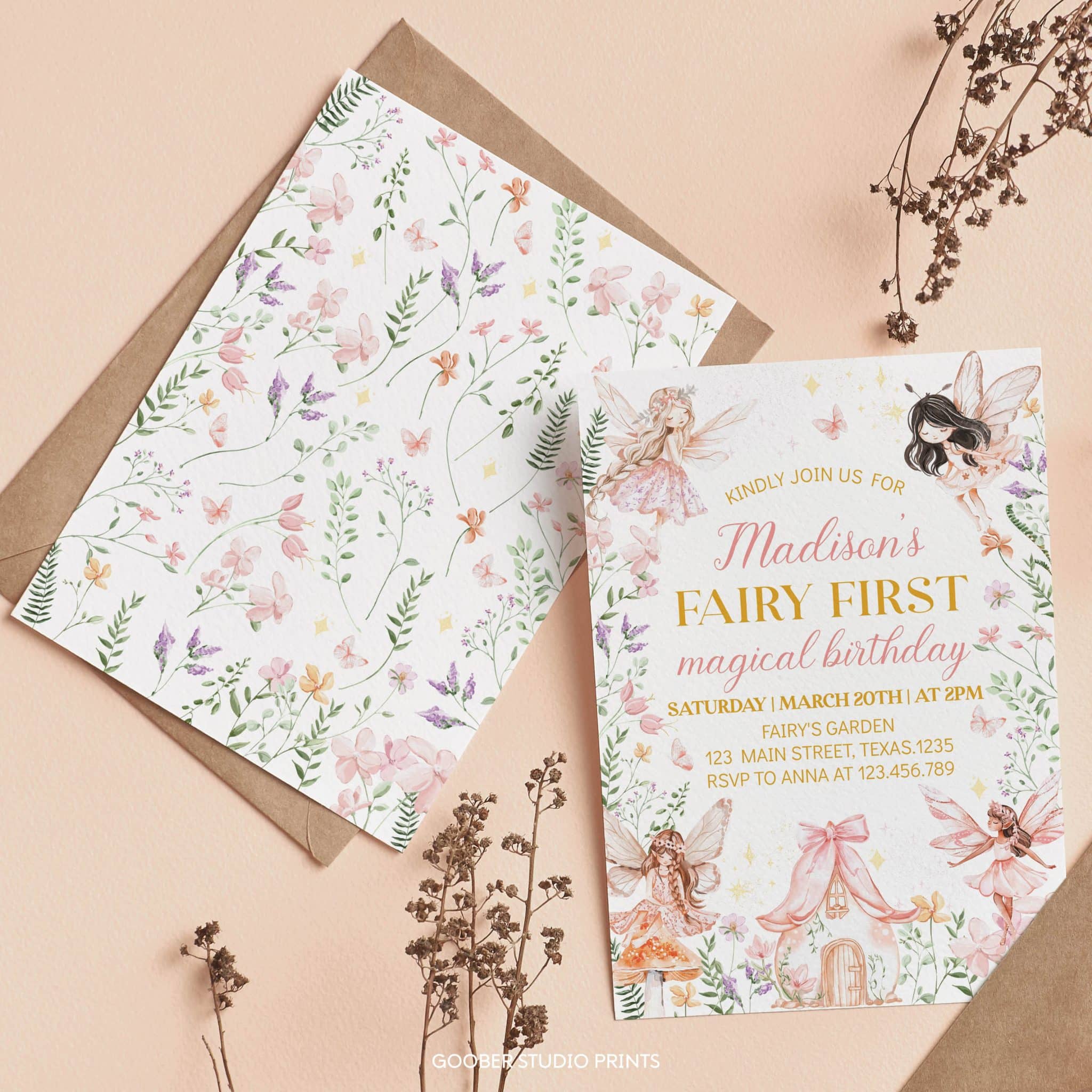 Step into a fairytale with our enchanted forest fairy first birthday invitation! Adorned with whimsical fairies, floral accents, and soft pink hues, this charming design sets the perfect tone for a magical spring garden celebration. With ample space to personalize all the party details, it’s both beautiful and practical. Designed for easy at-home printing, this invitation makes creating a dreamy, fairy-tale birthday effortless!