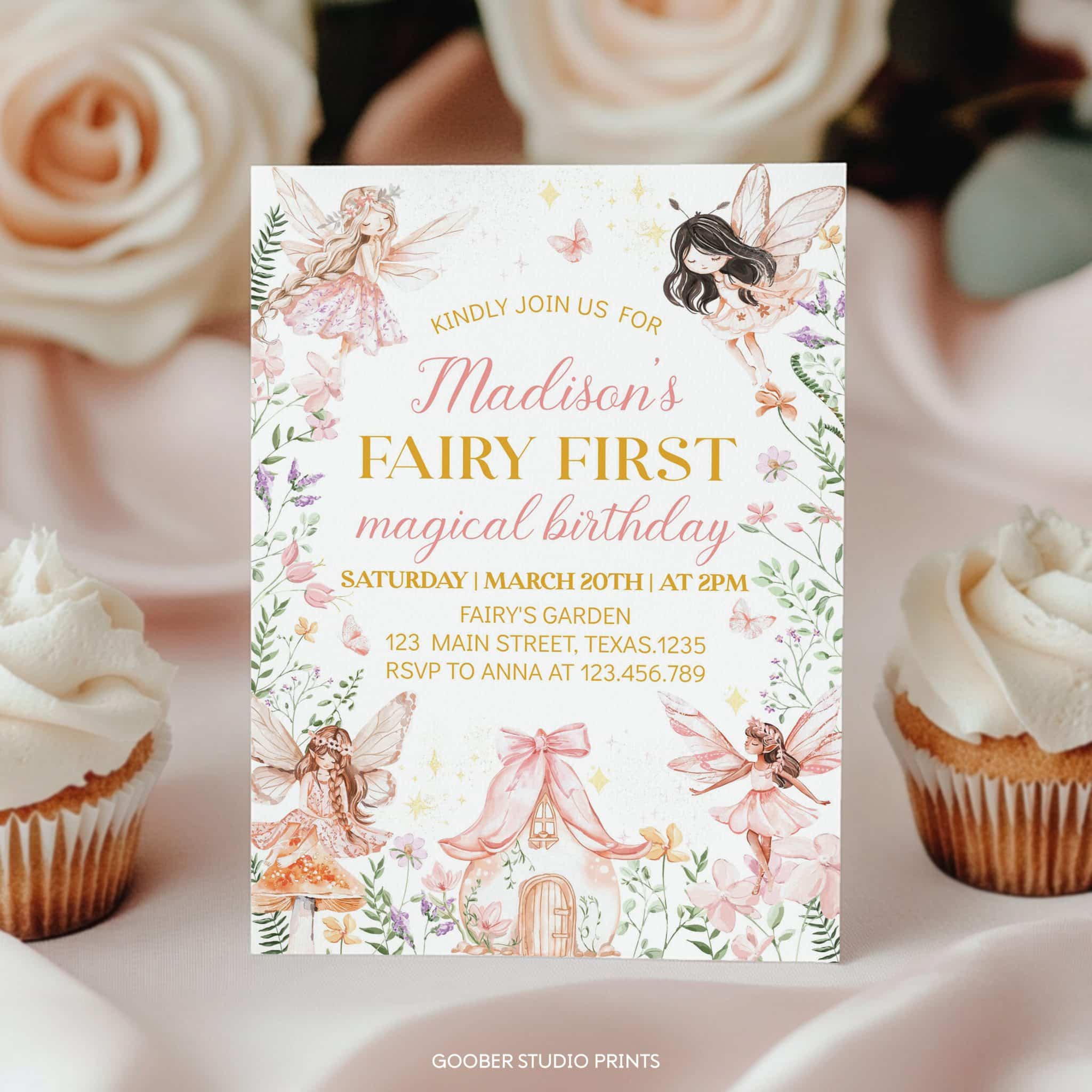 An access link to your editable fairy first birthday invite design will be sent to your e-mail address. The link allows you to edit, save and download your design as JPG or PDF file. The printable birthday invitation is made for printing at 5×7 inches. We’re happy to answer any questions through our contact page.
