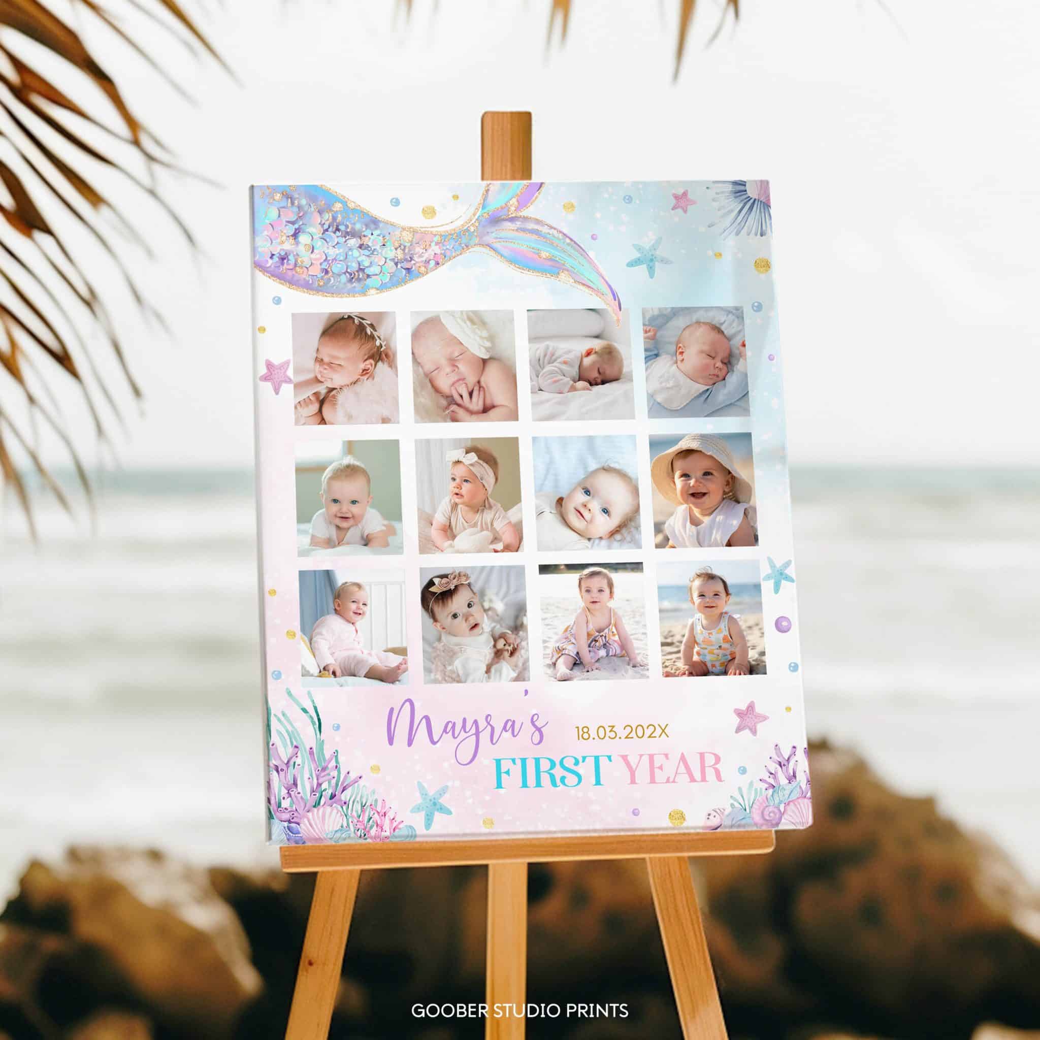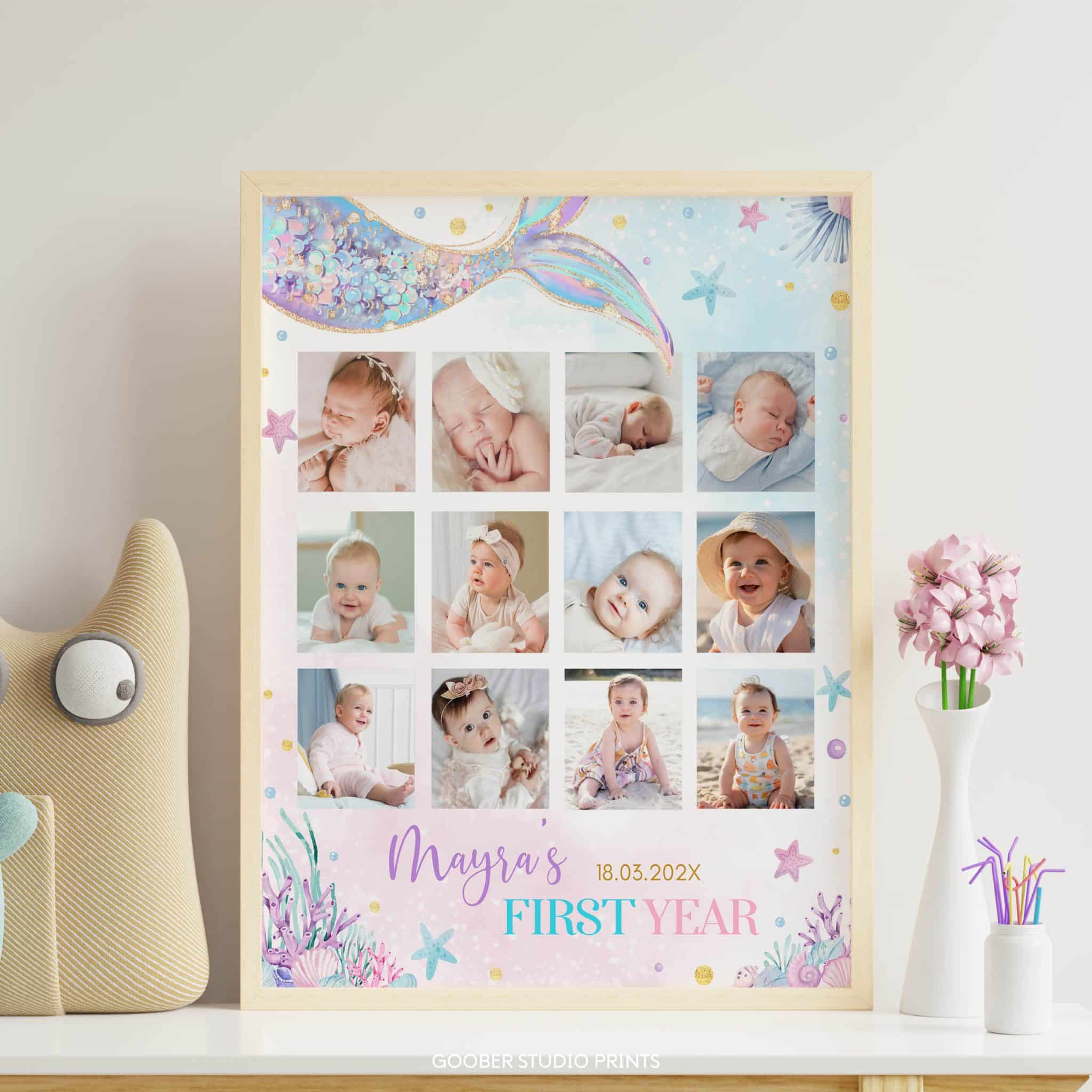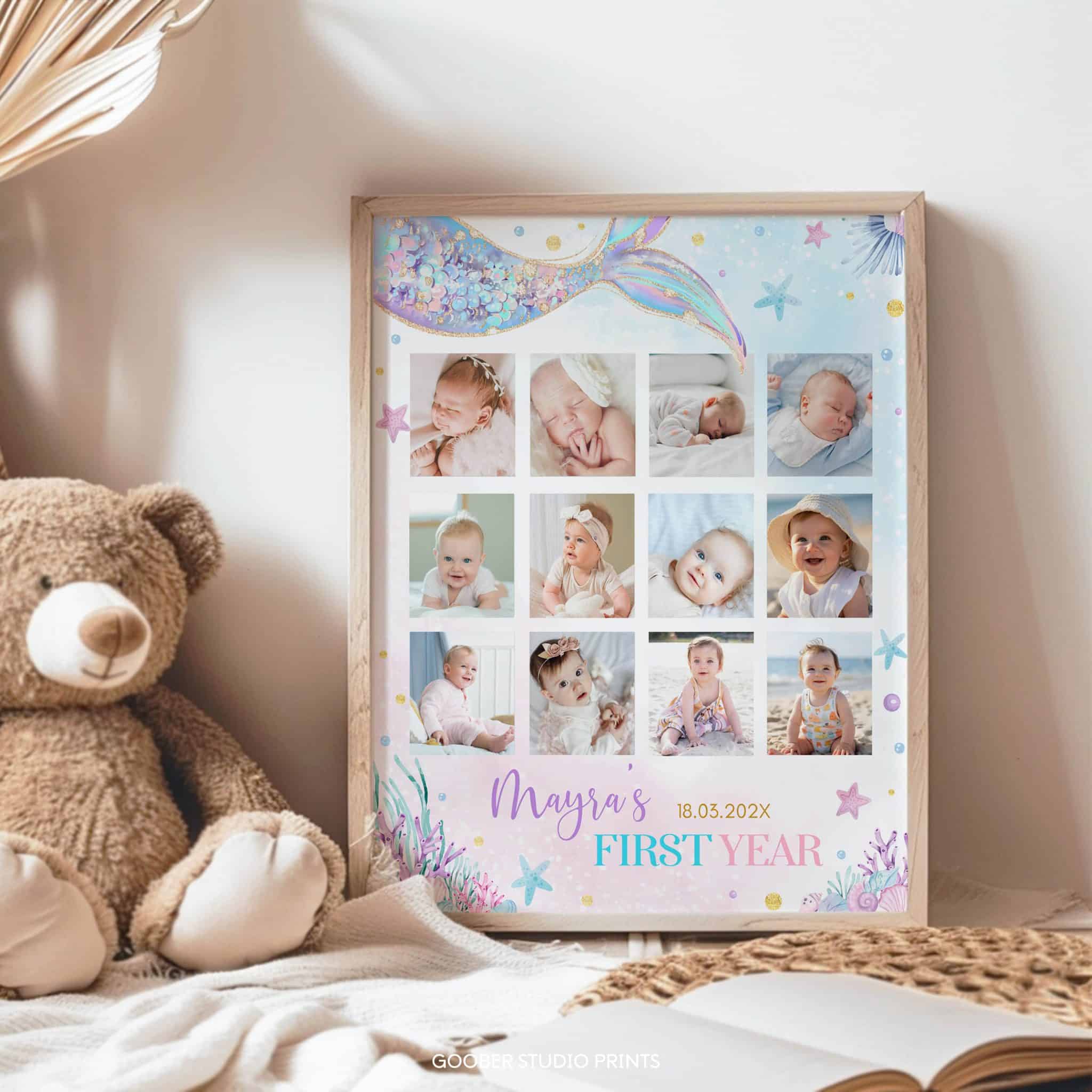 Preserve precious memories with our under the sea mermaid milestone photo collage! Featuring a pastel watercolor design with charming mermaid accents and sea creatures, this customizable layout is perfect for showcasing monthly photos from your baby girl’s first year. It also makes a thoughtful, personalized gift to celebrate her special milestones!