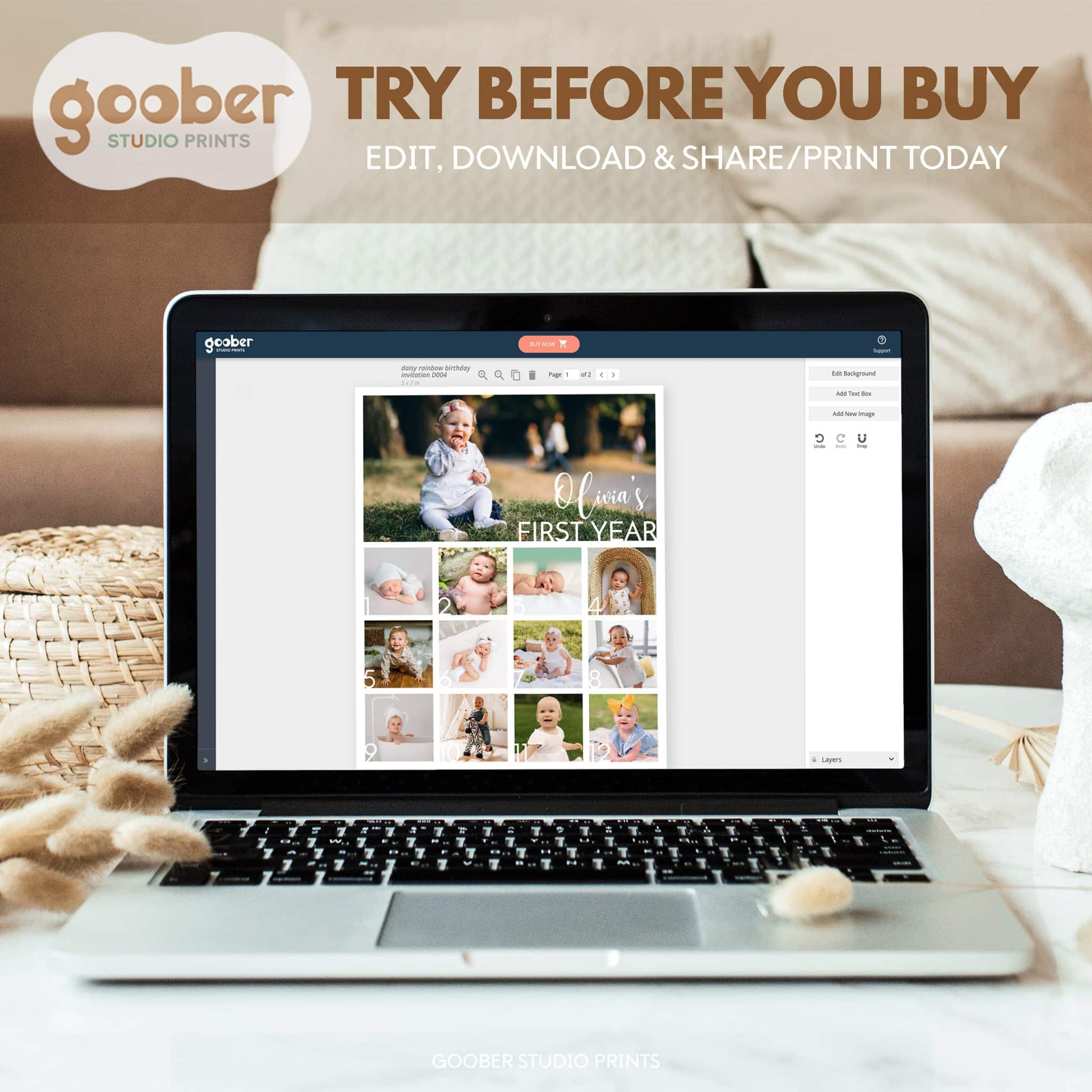 An access link to your editable minimal birthday photo collage design will be sent to your e-mail address. The link allows you to edit, save and download your design as JPG or PDF file. The design is made for printing at 16×20 inches. We’re happy to answer any questions through our contact page.