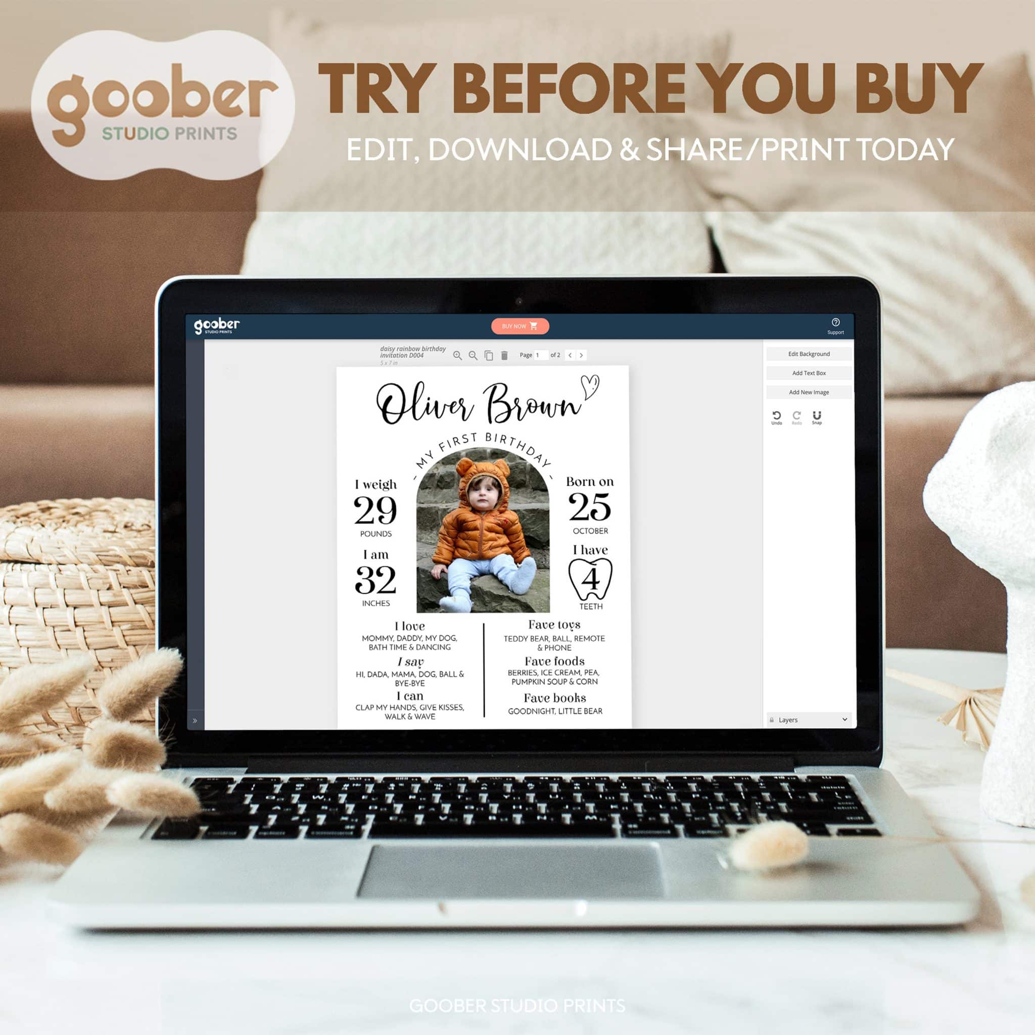 An access link to your editable minimalist birthday milestone photo poster design will be sent to your e-mail address. The link allows you to edit, save and download your design as JPG or PDF file. The design is made for printing at 16×20, 18×24 and 24×36 inches. We’re happy to answer any questions through our contact page.