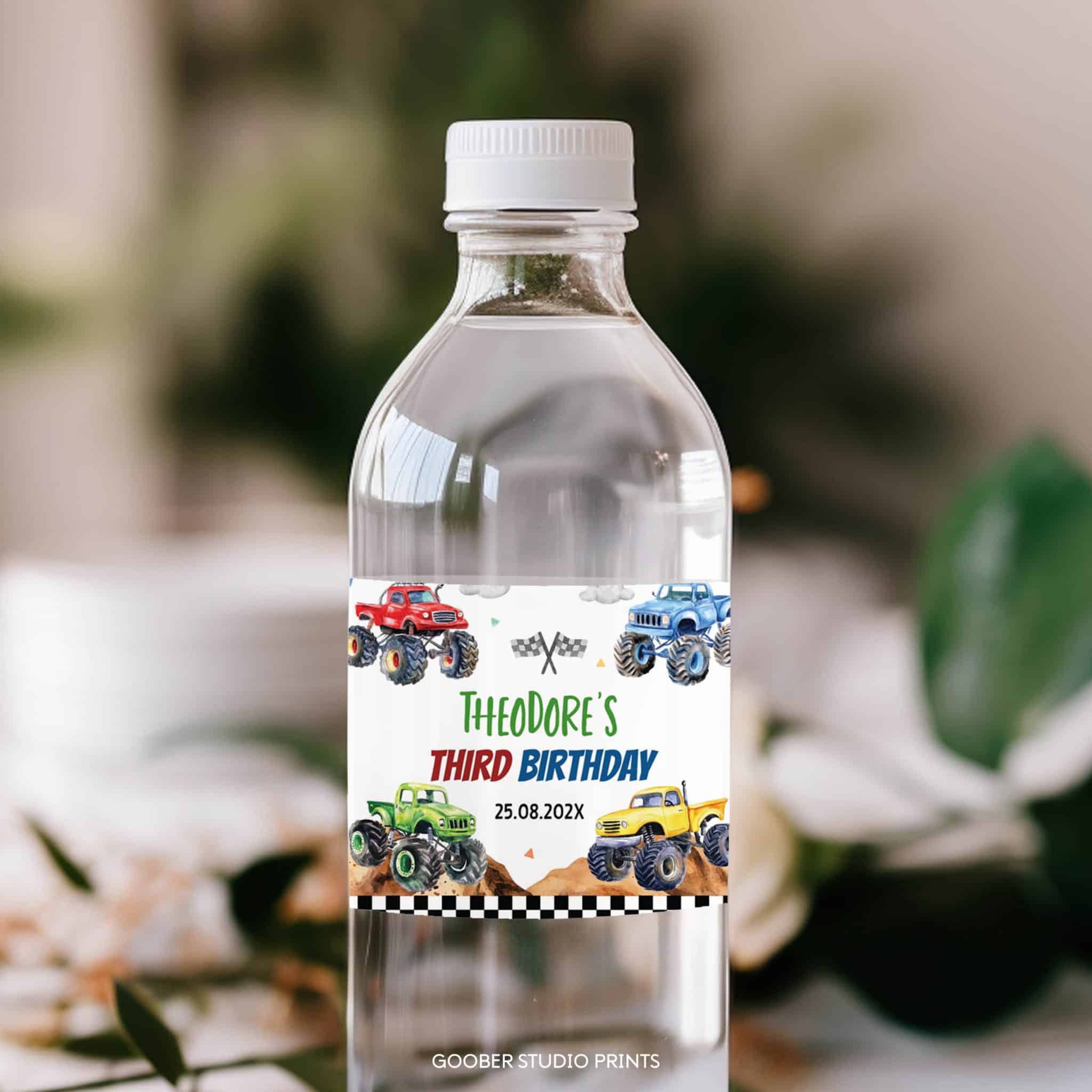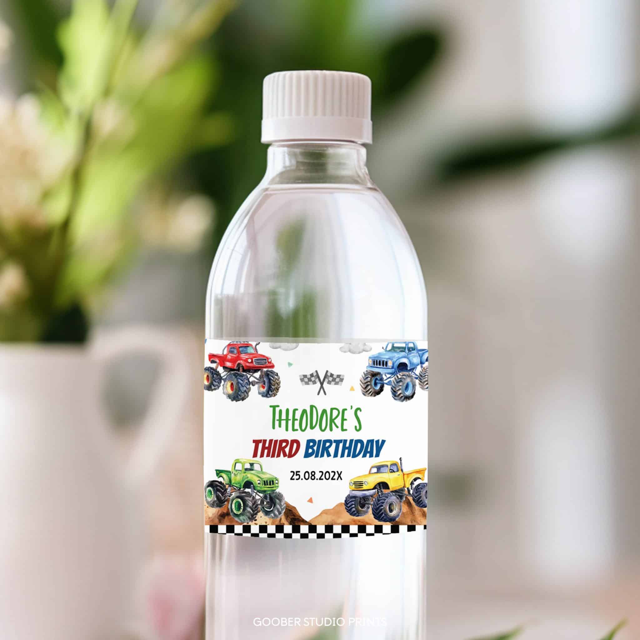 Add high-speed fun to your party drinks with our monster truck water bottle labels! Featuring bold monster trucks and racing-themed designs, these labels can be customized with the birthday boy’s name and age. Designed to fit standard 8.5”x2” bottles, they’re easy to print at home and make the perfect addition to your kids’ birthday party decor. Complete the celebration with these race-ready labels for an action-packed touch!